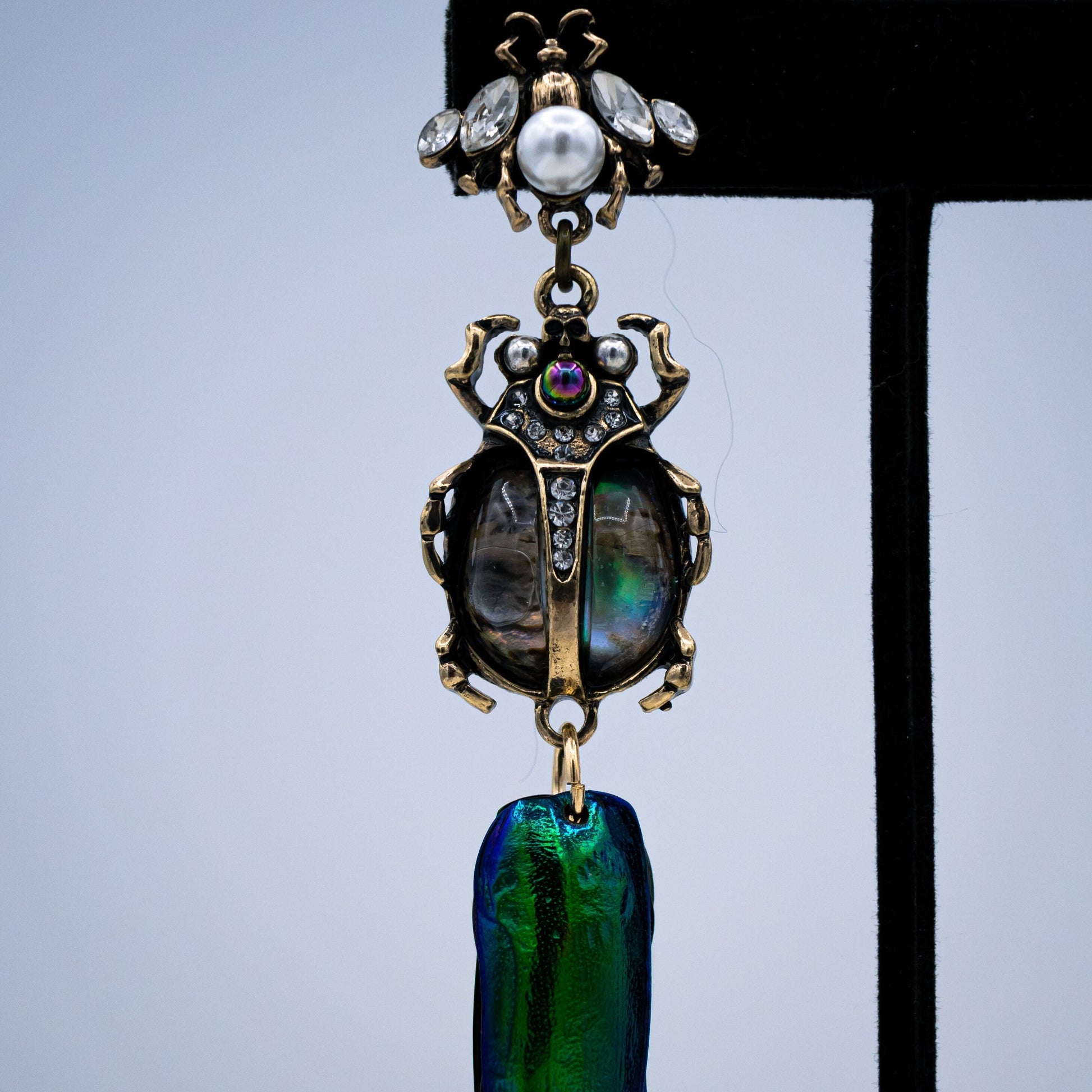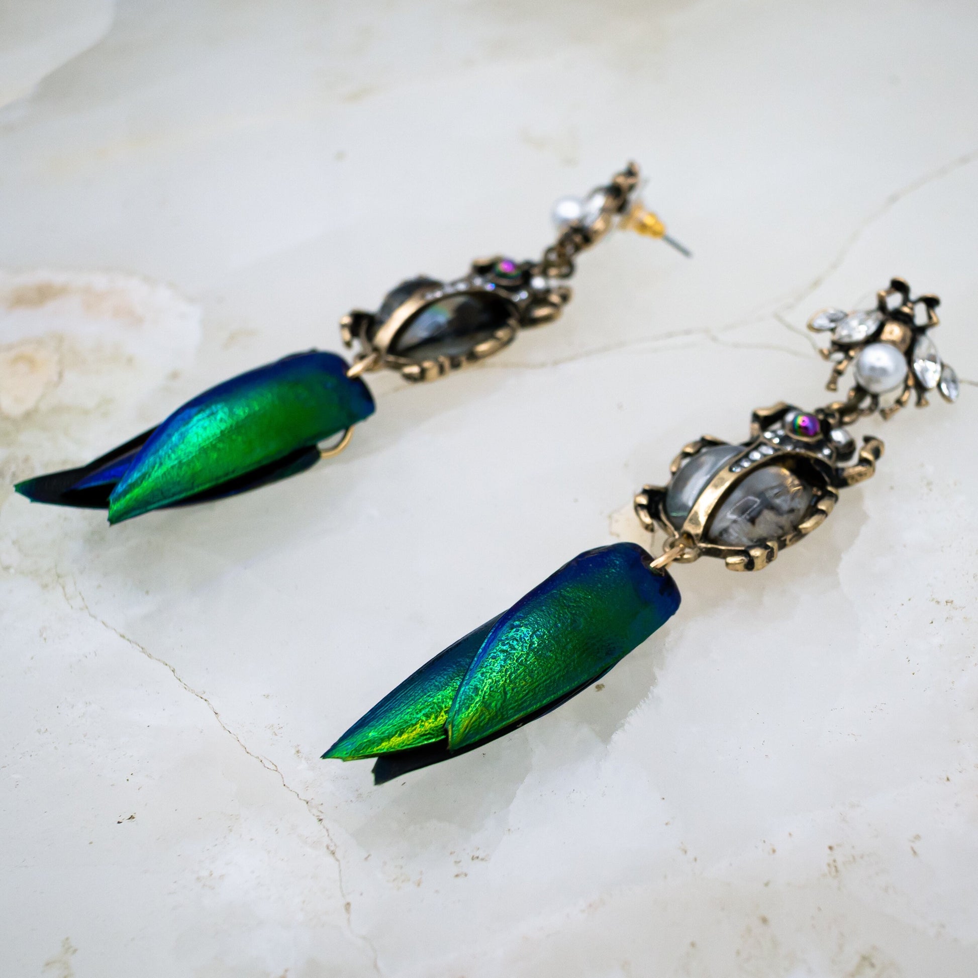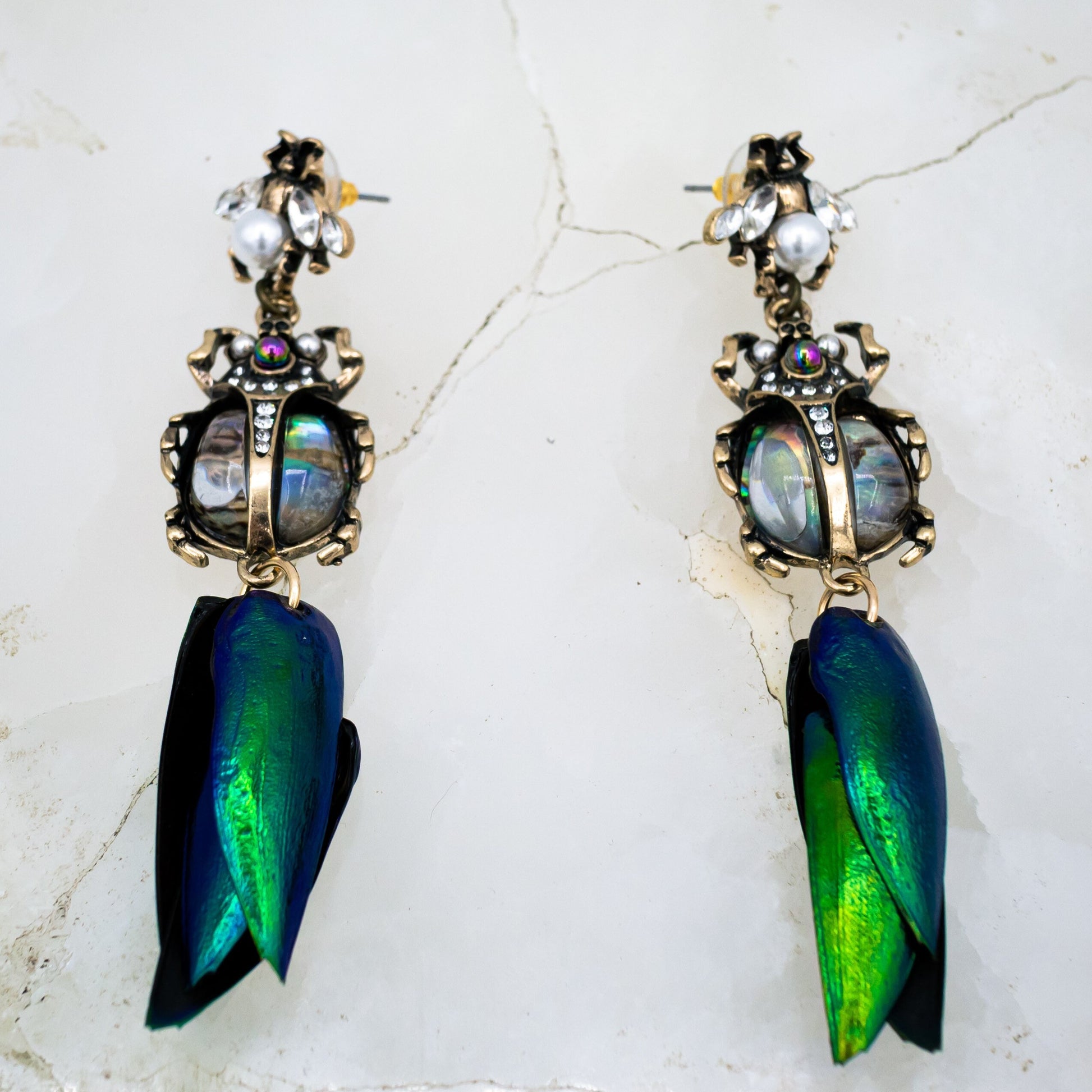 These beautiful earrings are made from genuine jewel beetle shells that dangle in pairs from an iridescent scarab beetle connector from pearl and stone bee stud earrings
