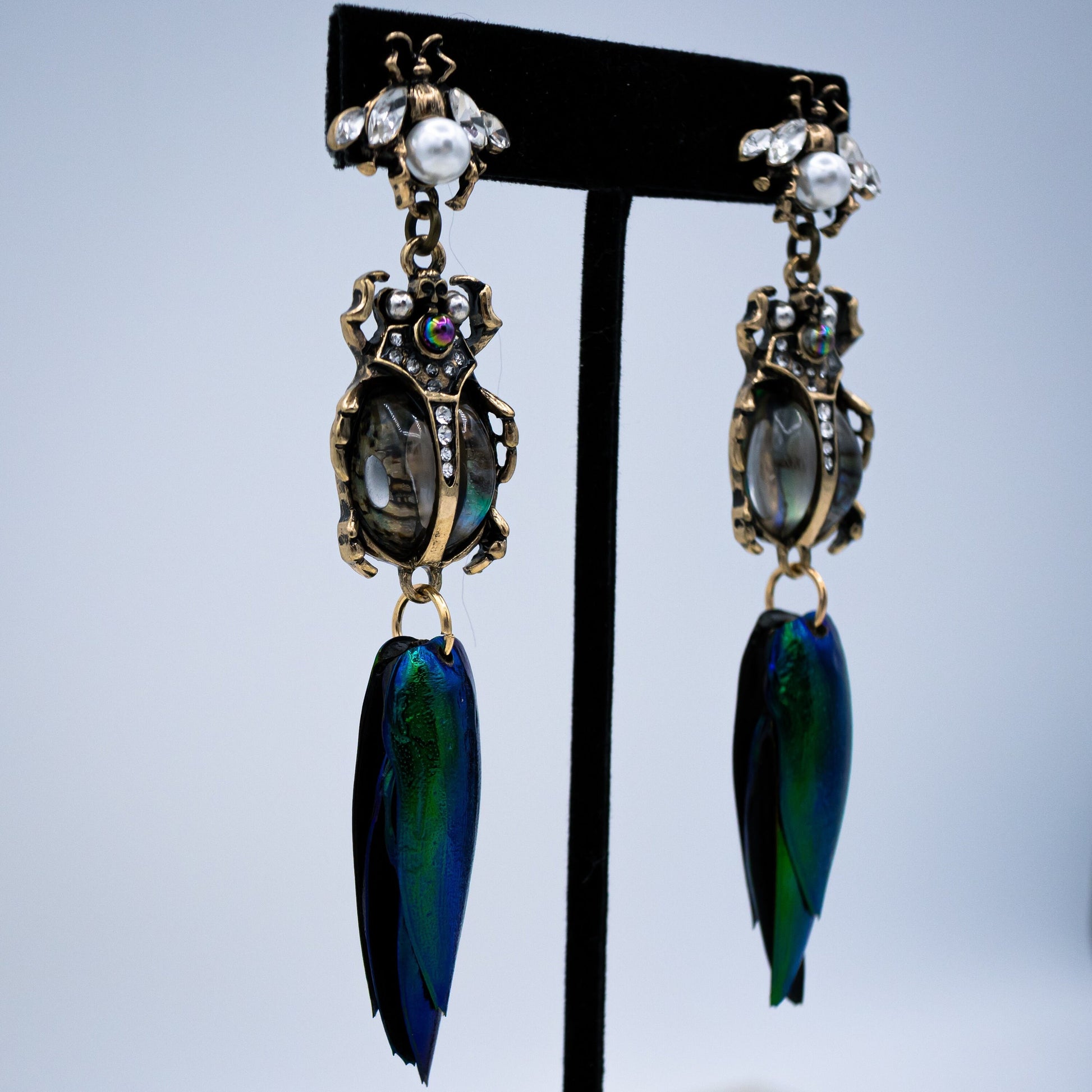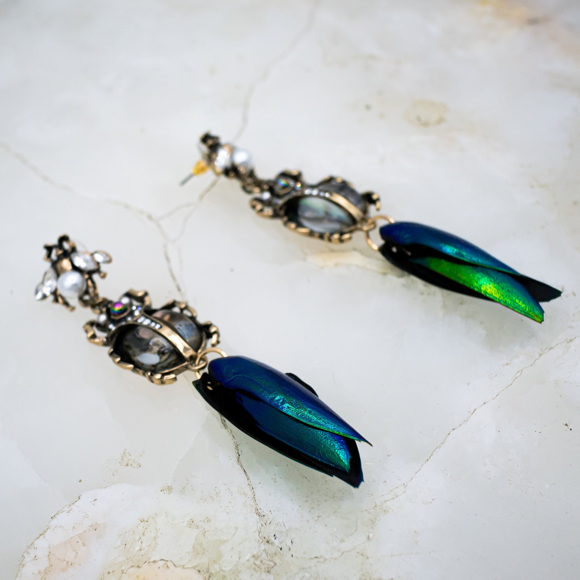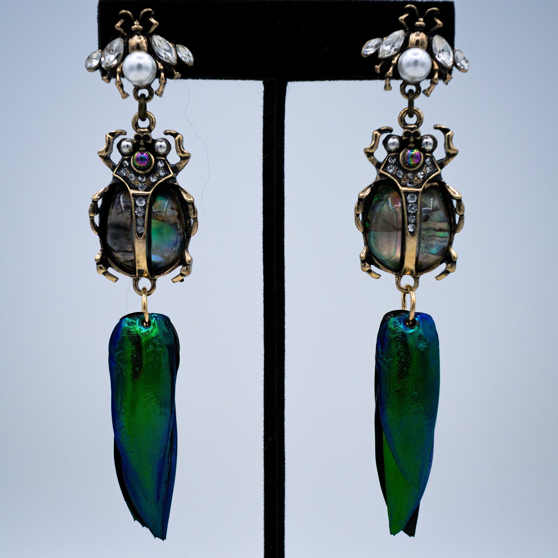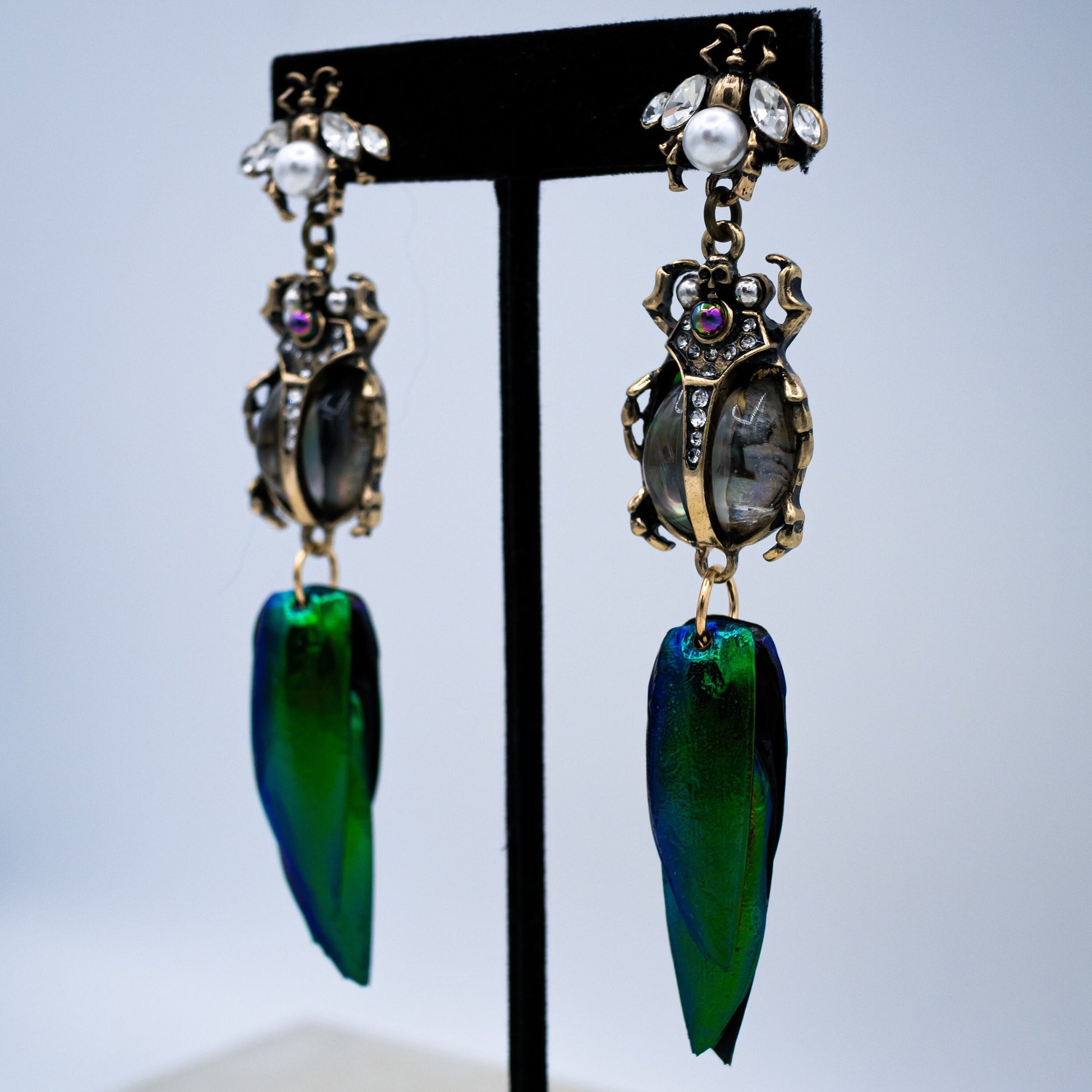 These beautiful earrings are made from genuine jewel beetle shells that dangle in pairs from an iridescent scarab beetle connector from pearl and stone bee stud earrings