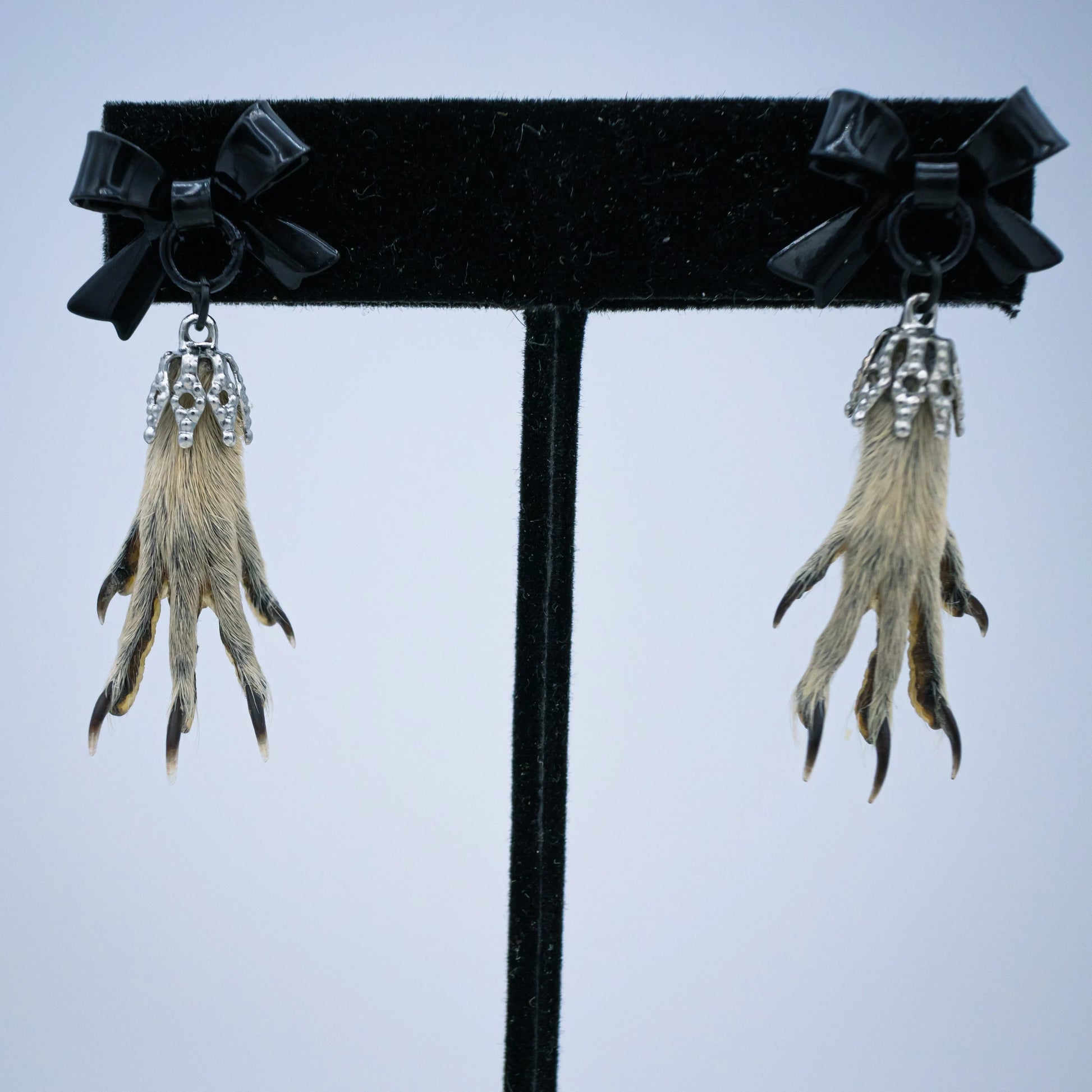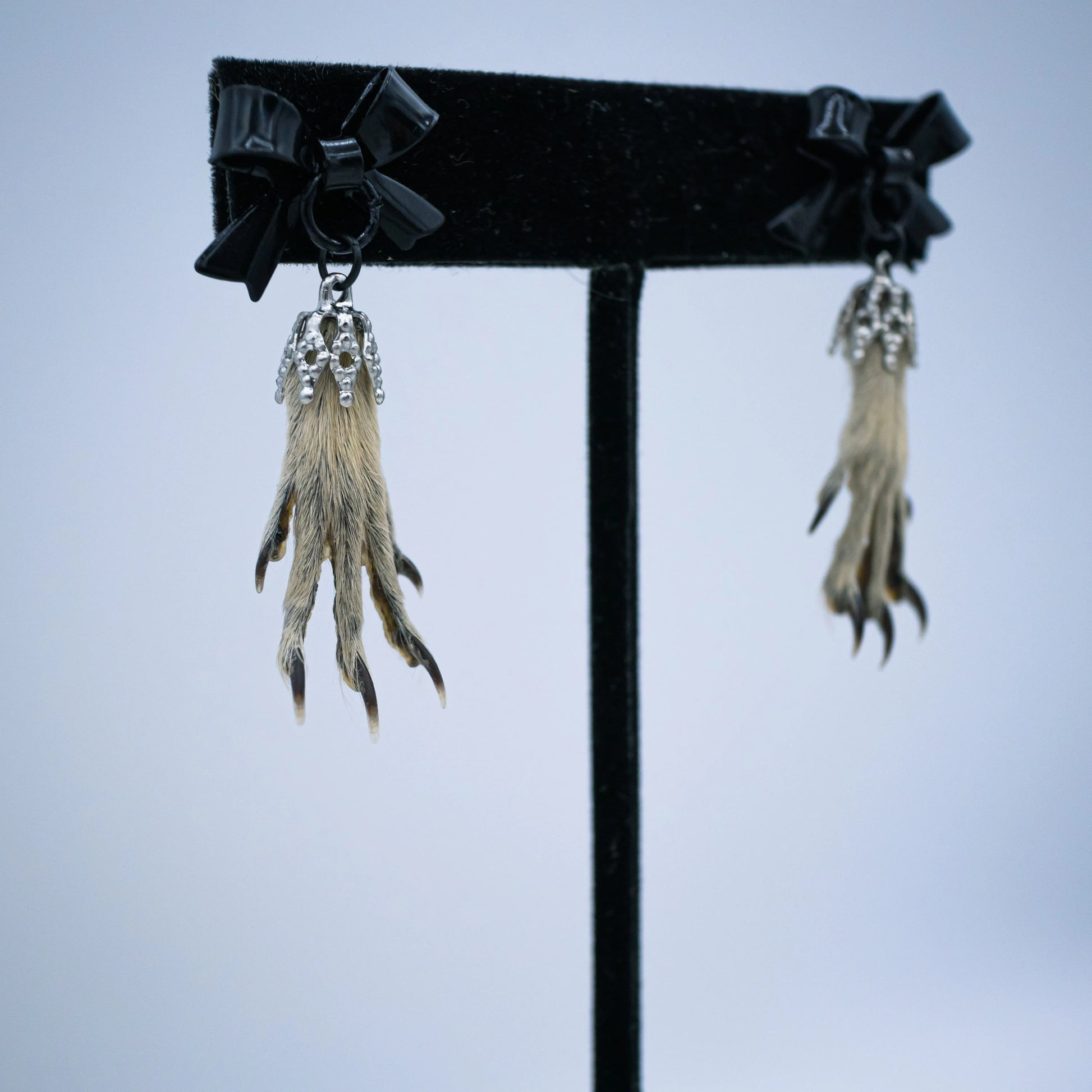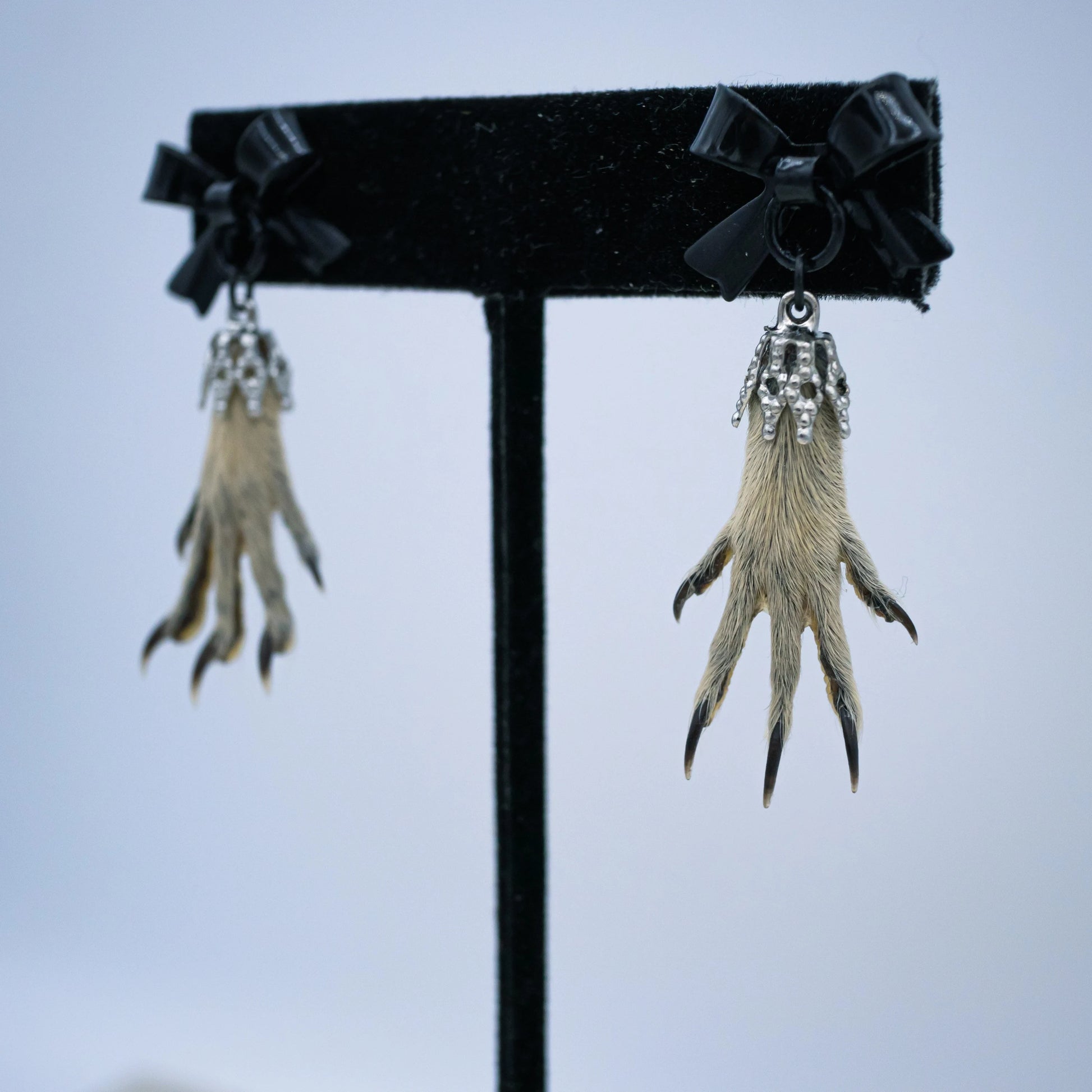 These unique earrings are made from authentic prairie dog paws that dangle under black bow stud earrings.