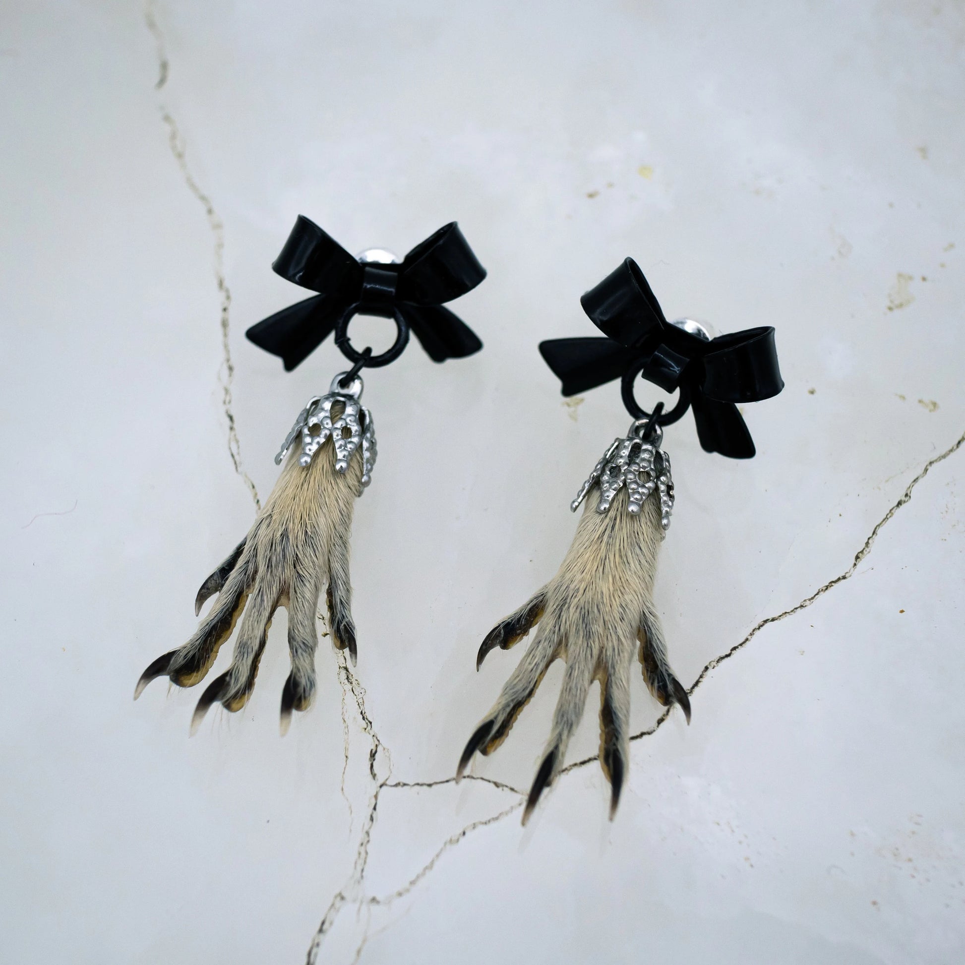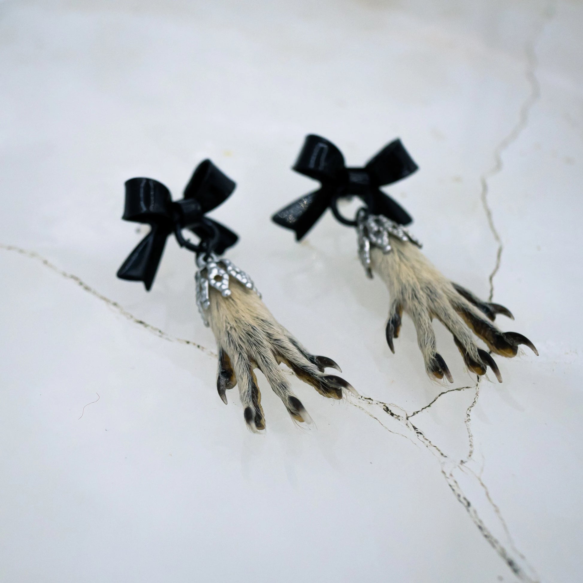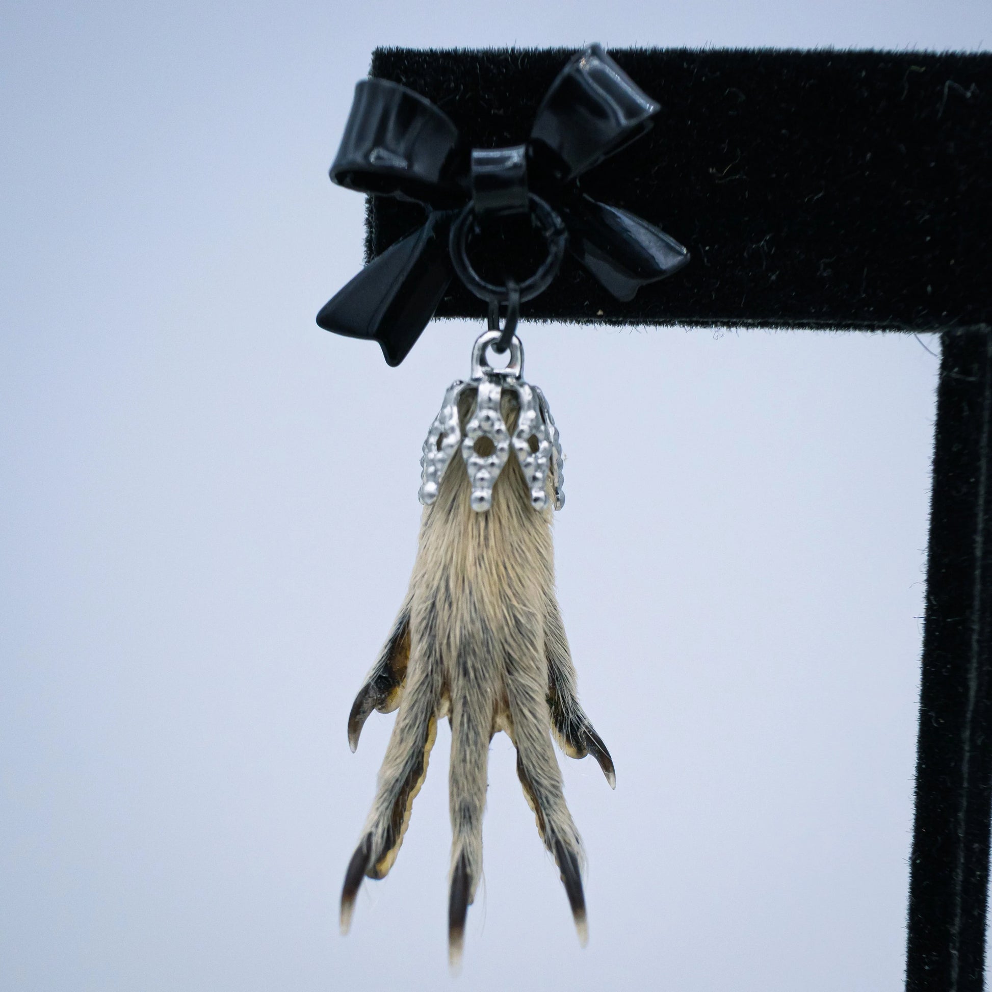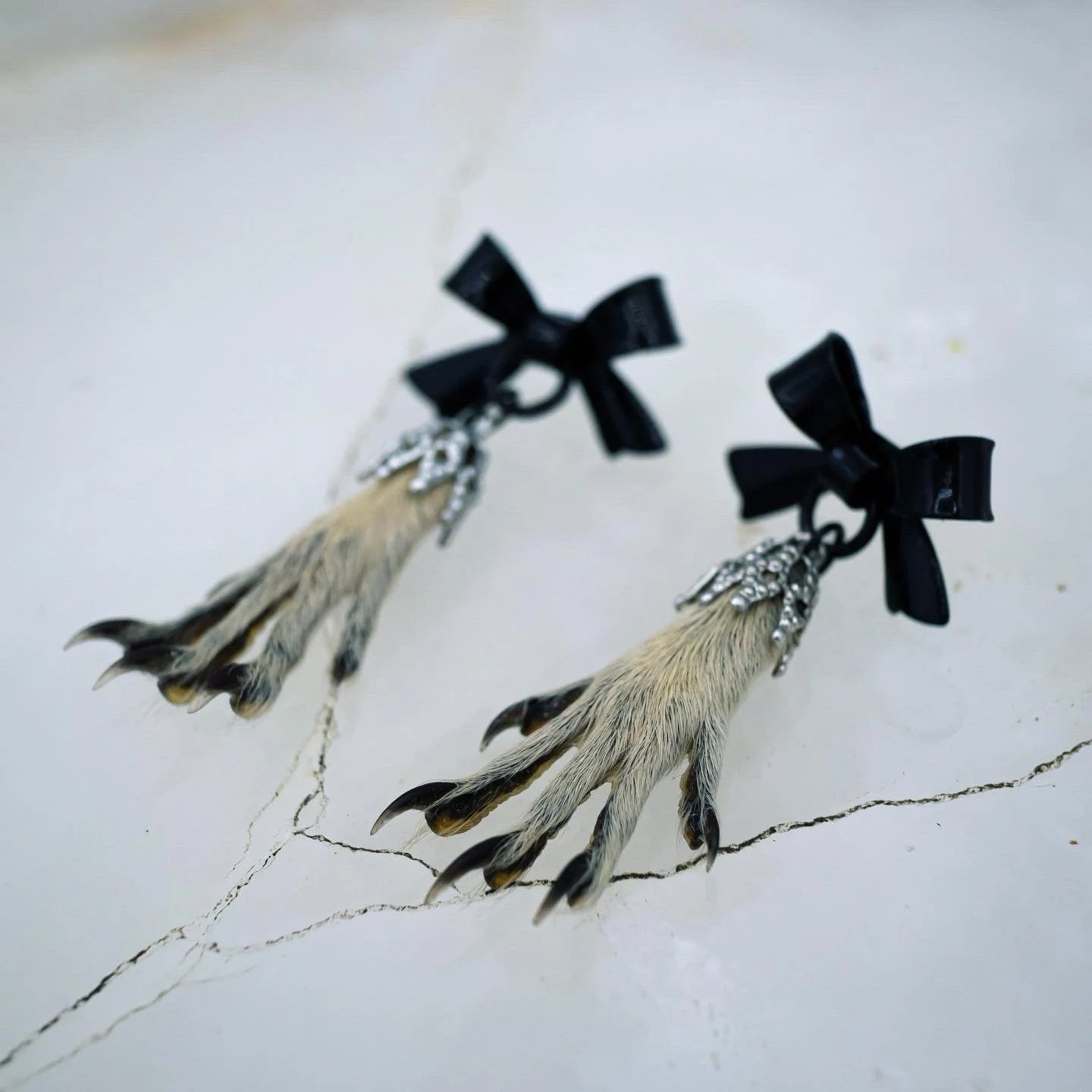 These unique earrings are made from authentic prairie dog paws that dangle under black bow stud earrings.