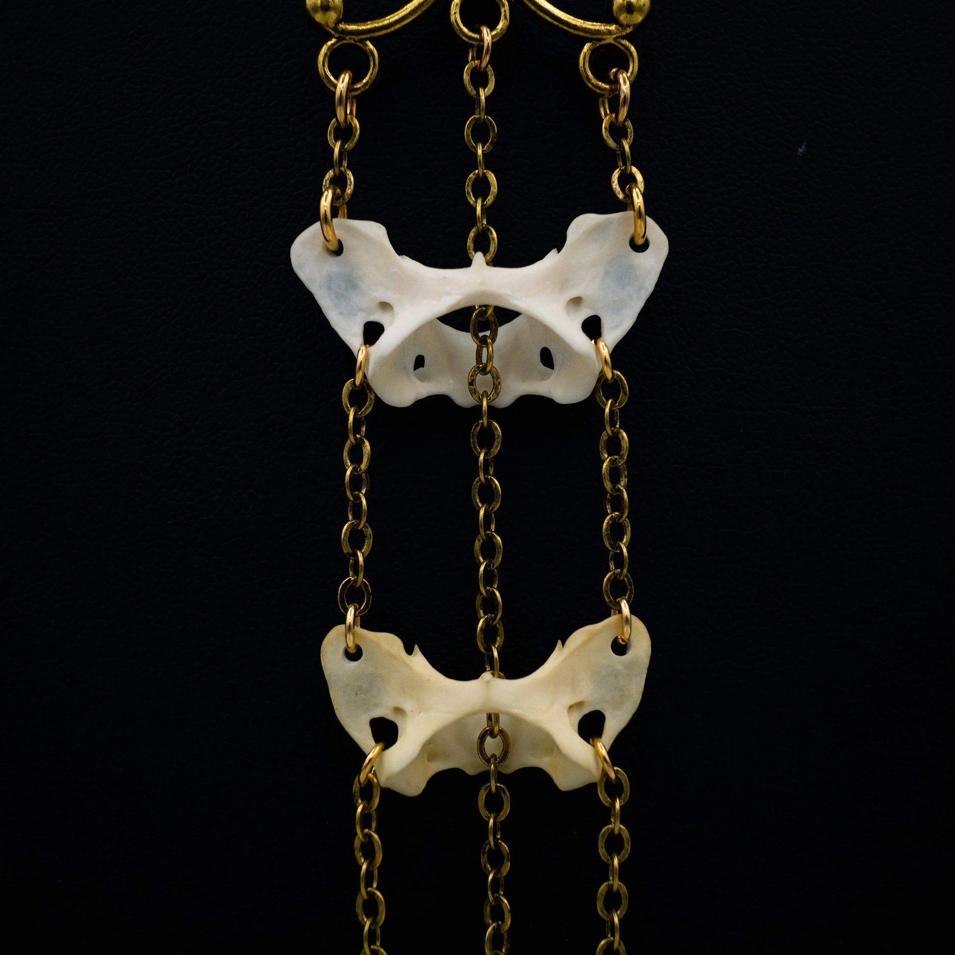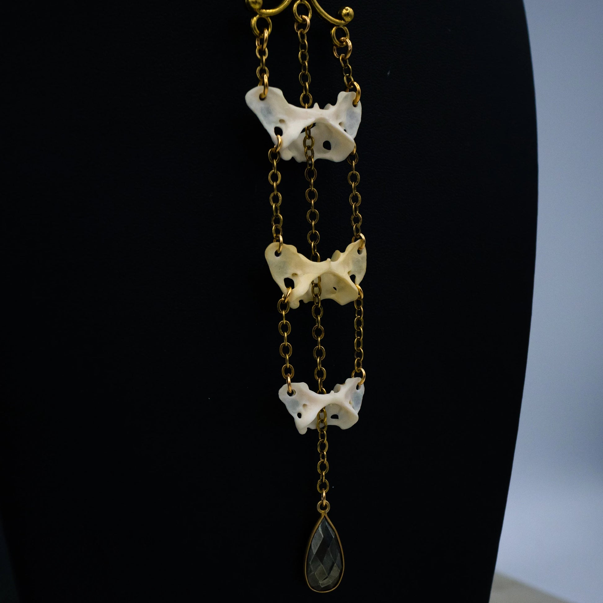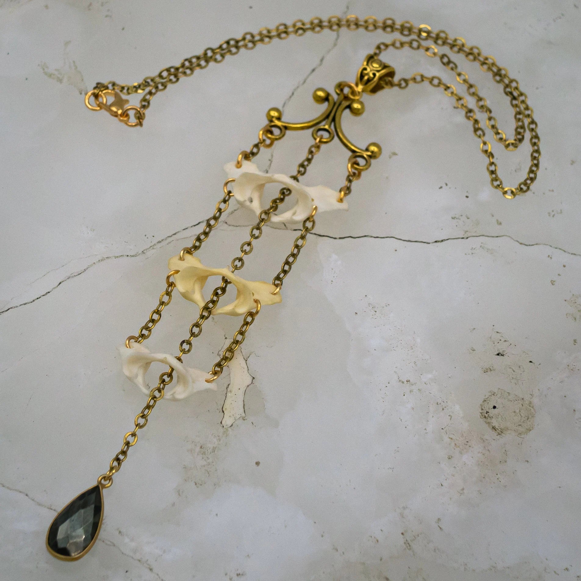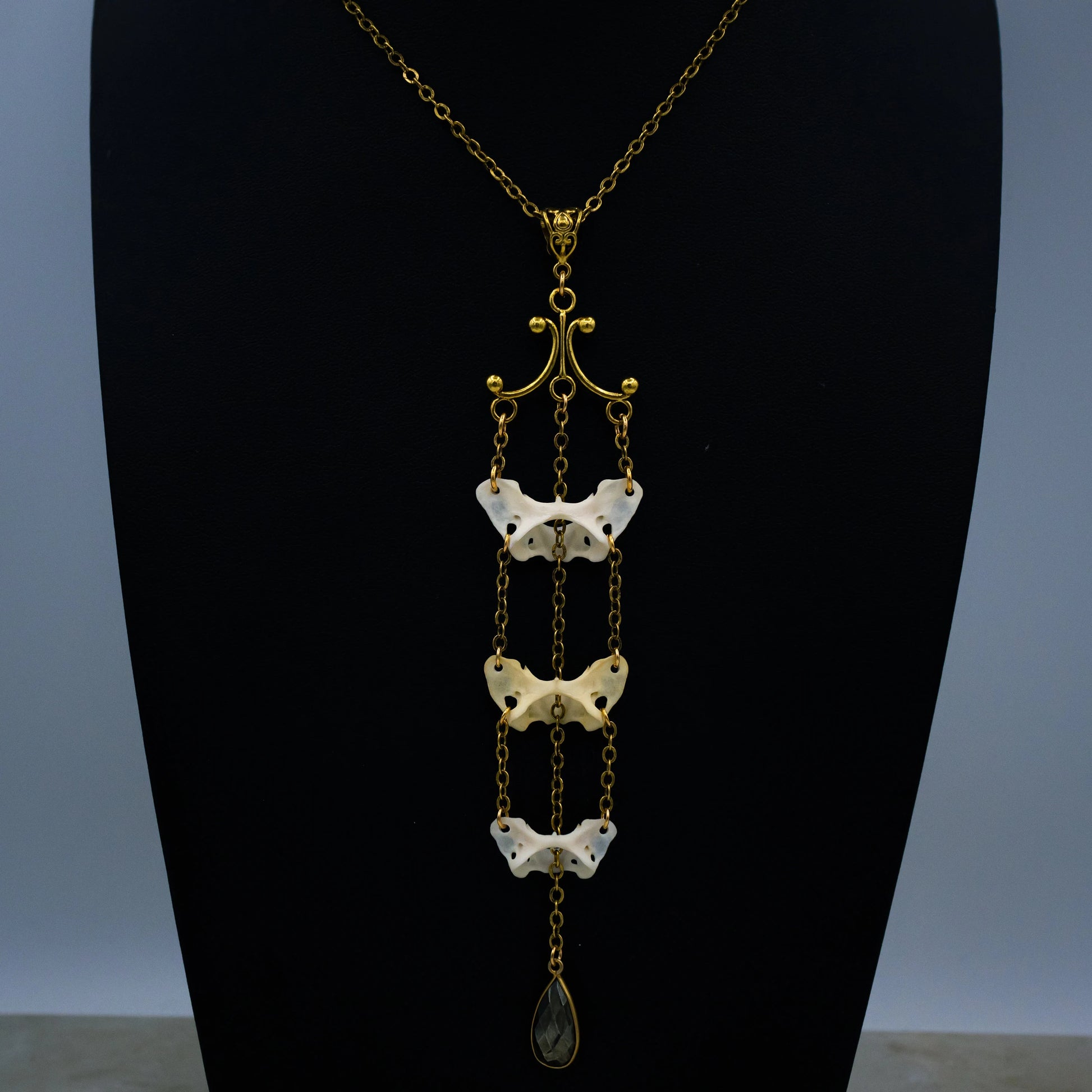Three authentic atlas bones hang in a row and dangle a teardrop pyrite stone from a gold chain