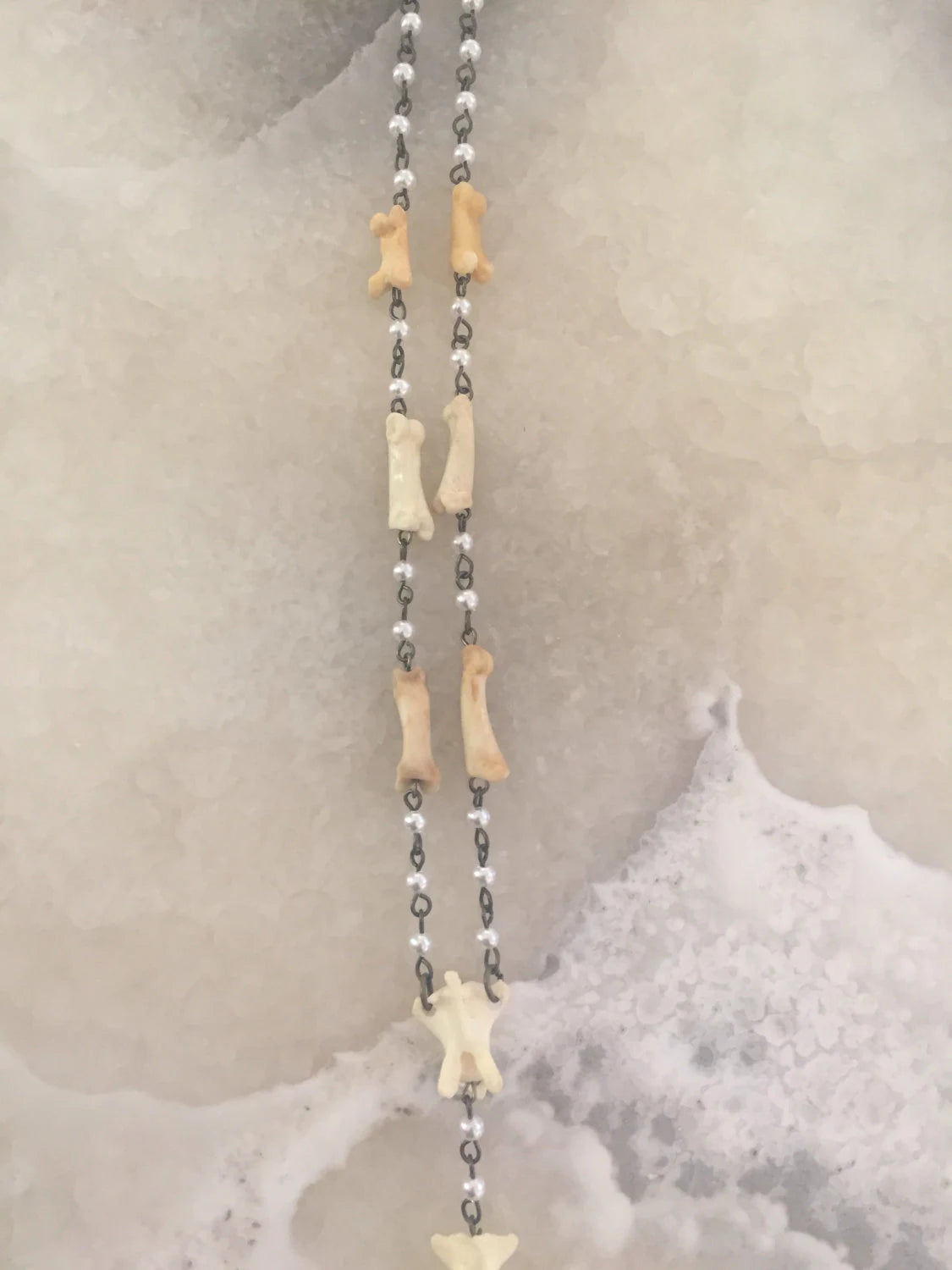Real coyote bones make up this unique rosary style necklace interlaced with a handmade pearl chain