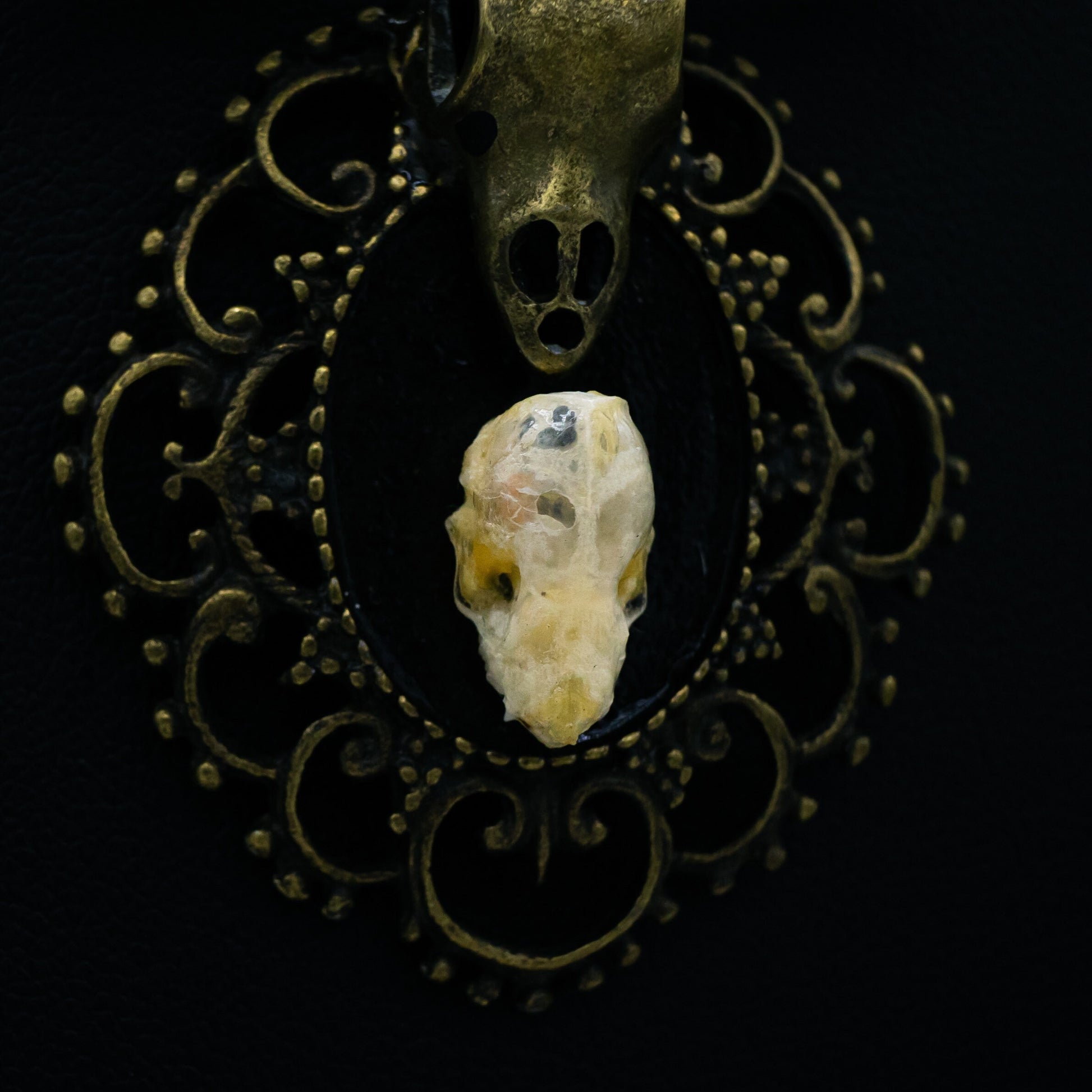 This authentic bat skull rests on a bronze setting decorated with a bronze deer skull and hangs from a beaded pearl chain
