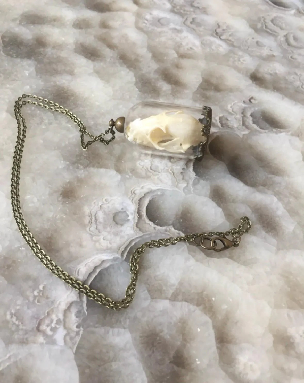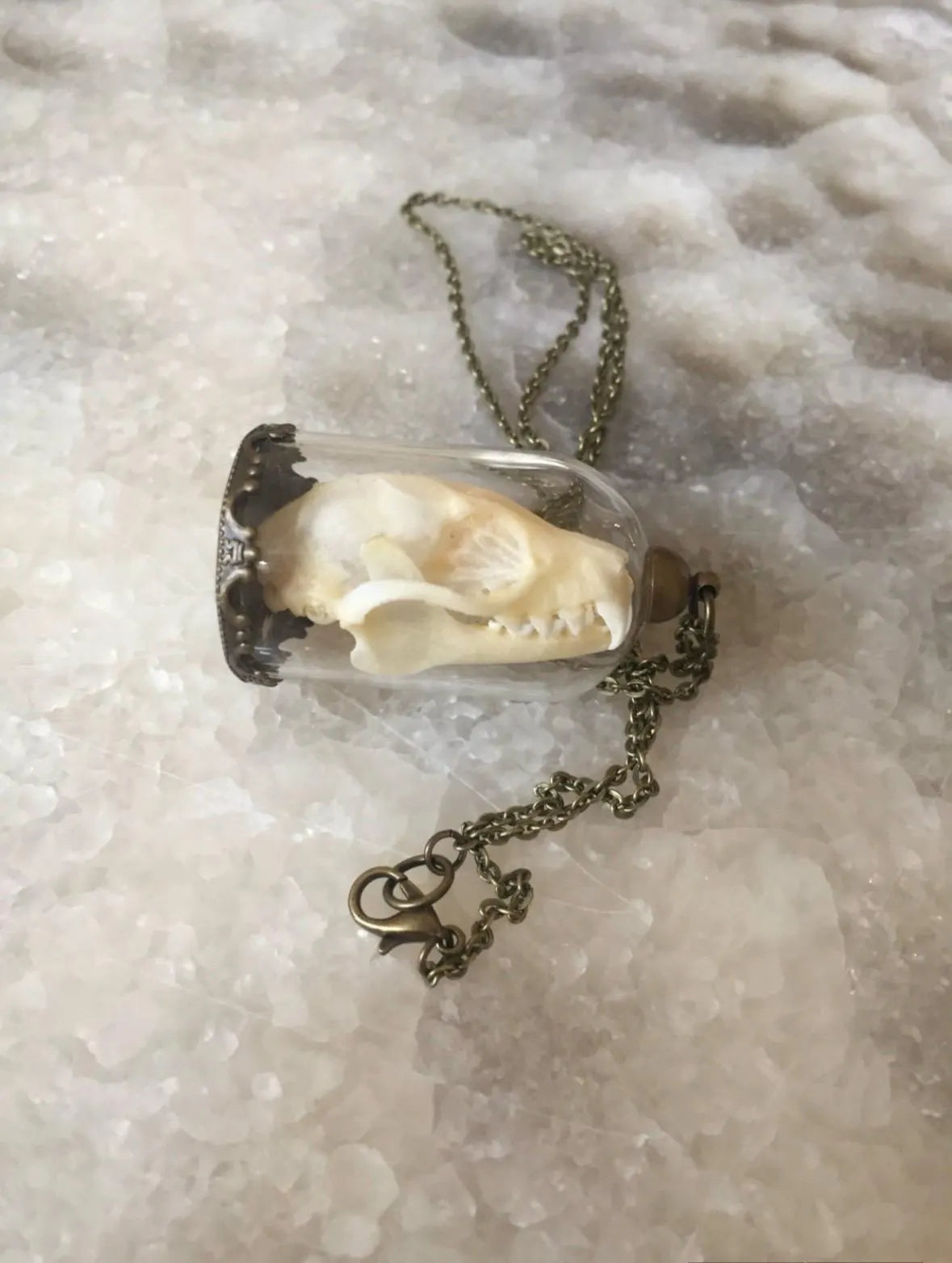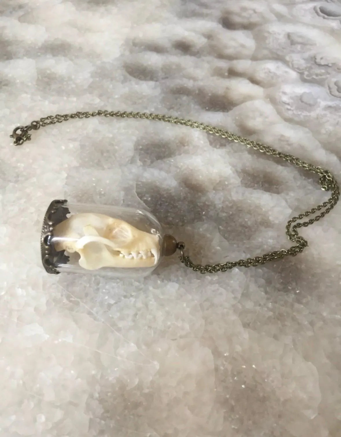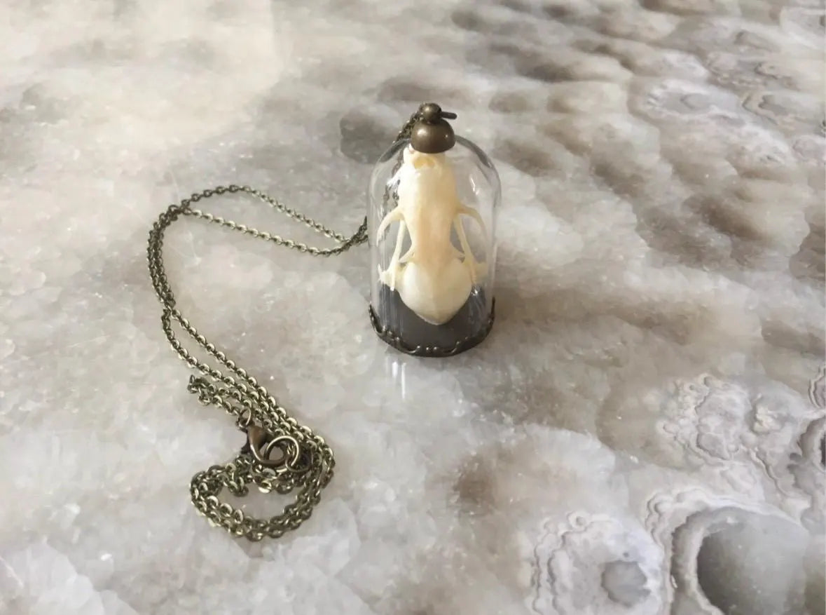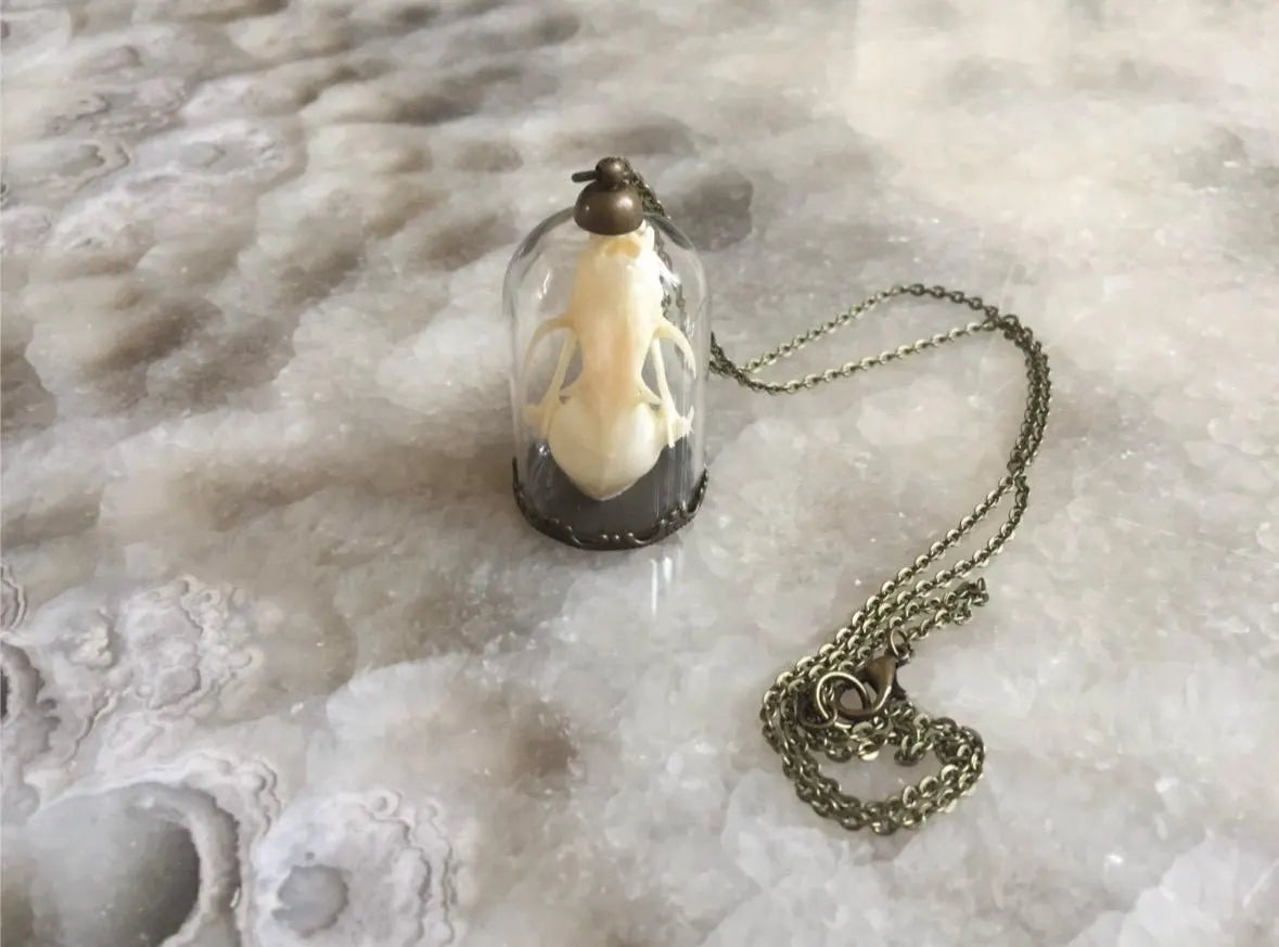 This unique necklace features a bat skull that rests inside a bell jar and hangs from a long bronze chain