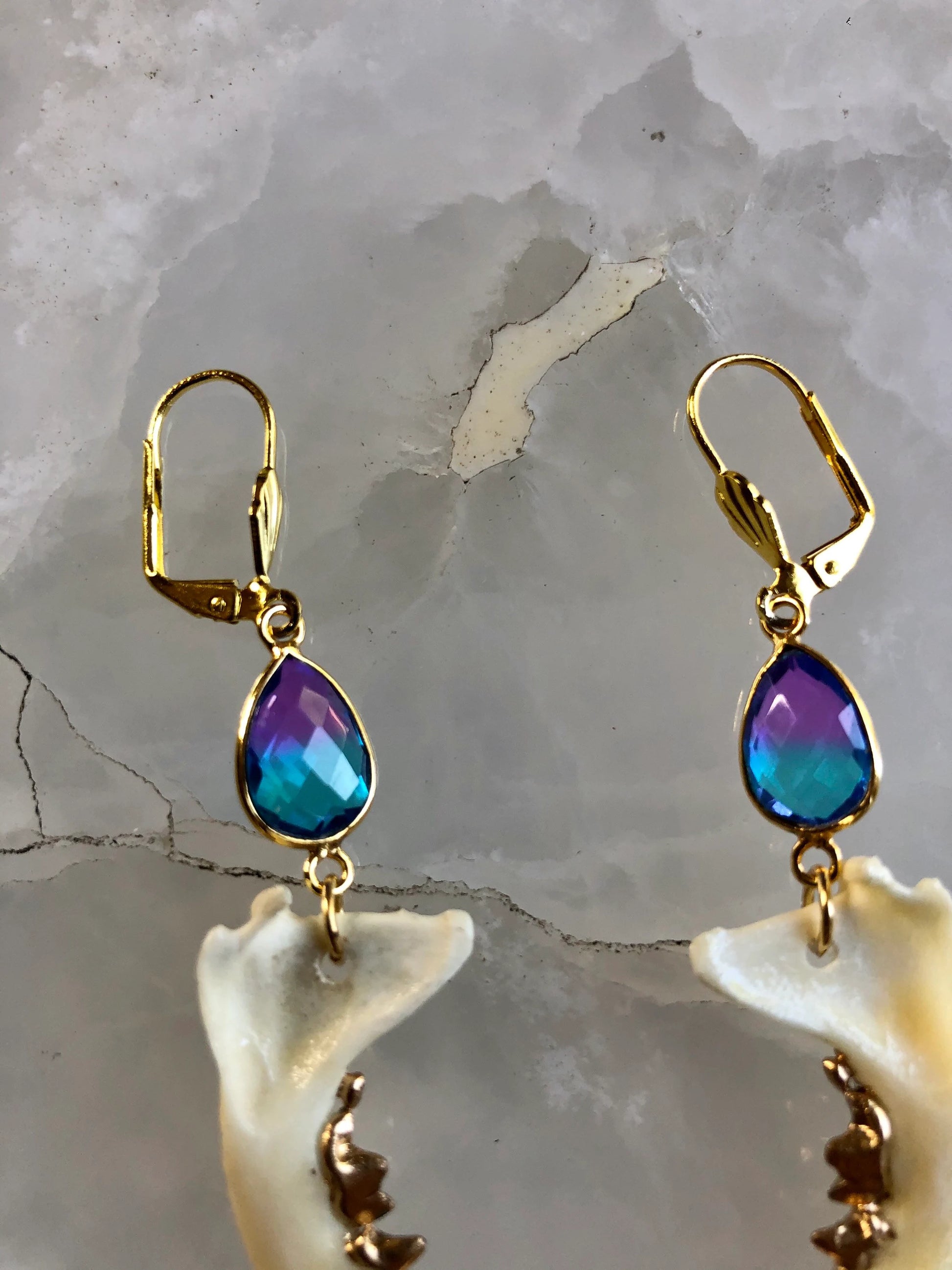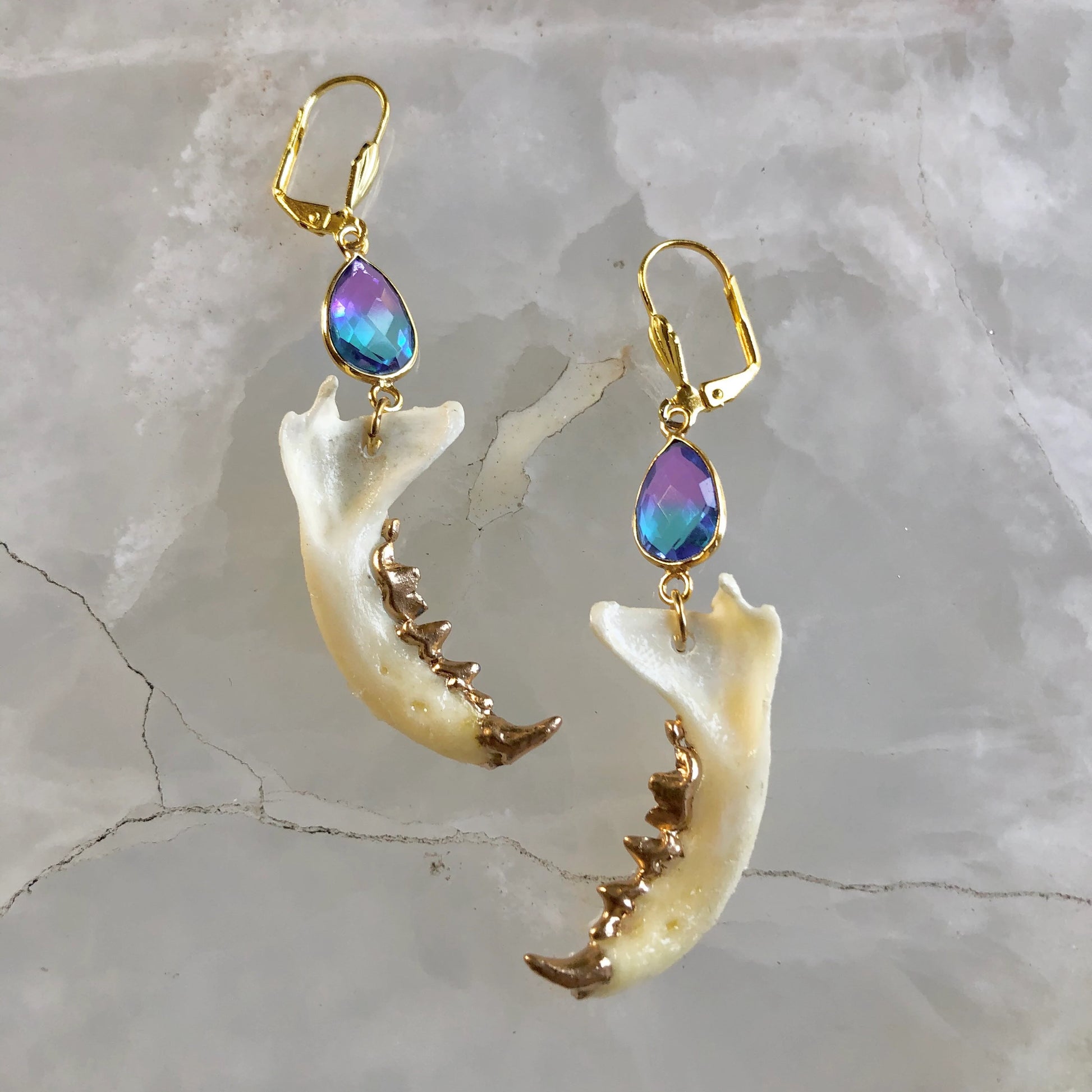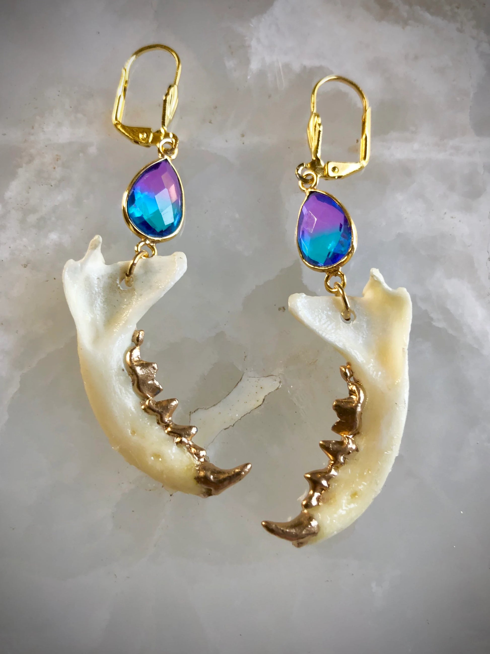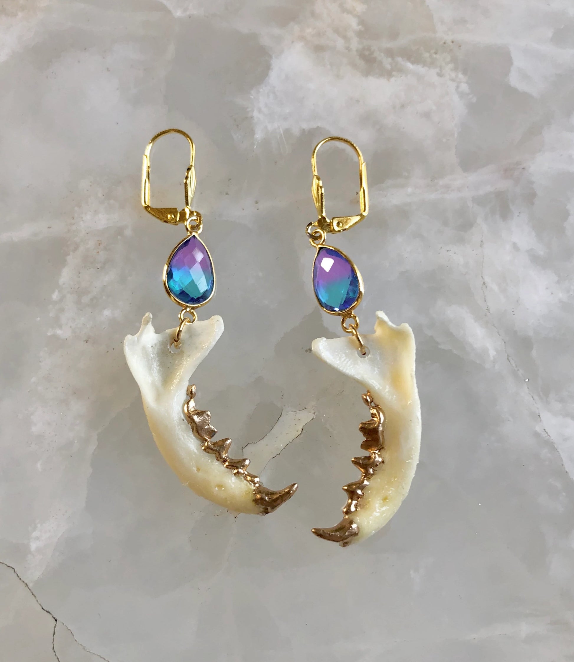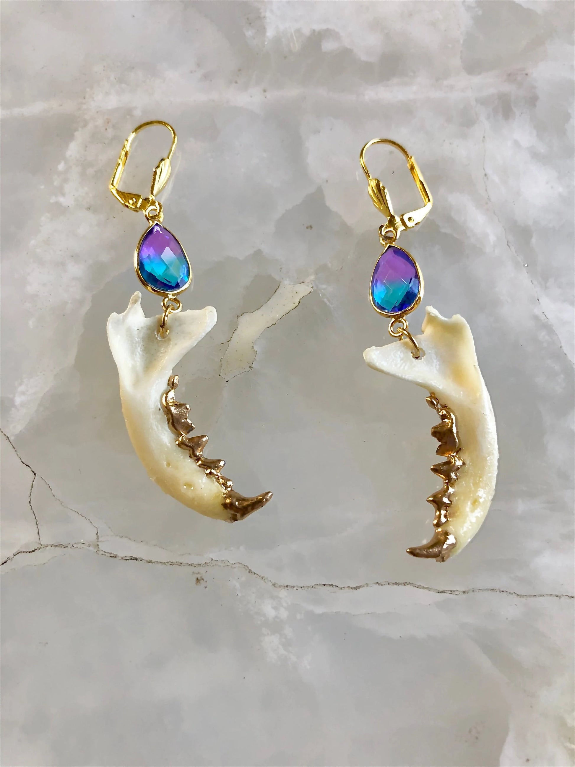 These unique and stunning earrings are made from authentic mink jaws with gold gilded teeth that hang from blue and purple topaz teardrops by gold latch back earrings