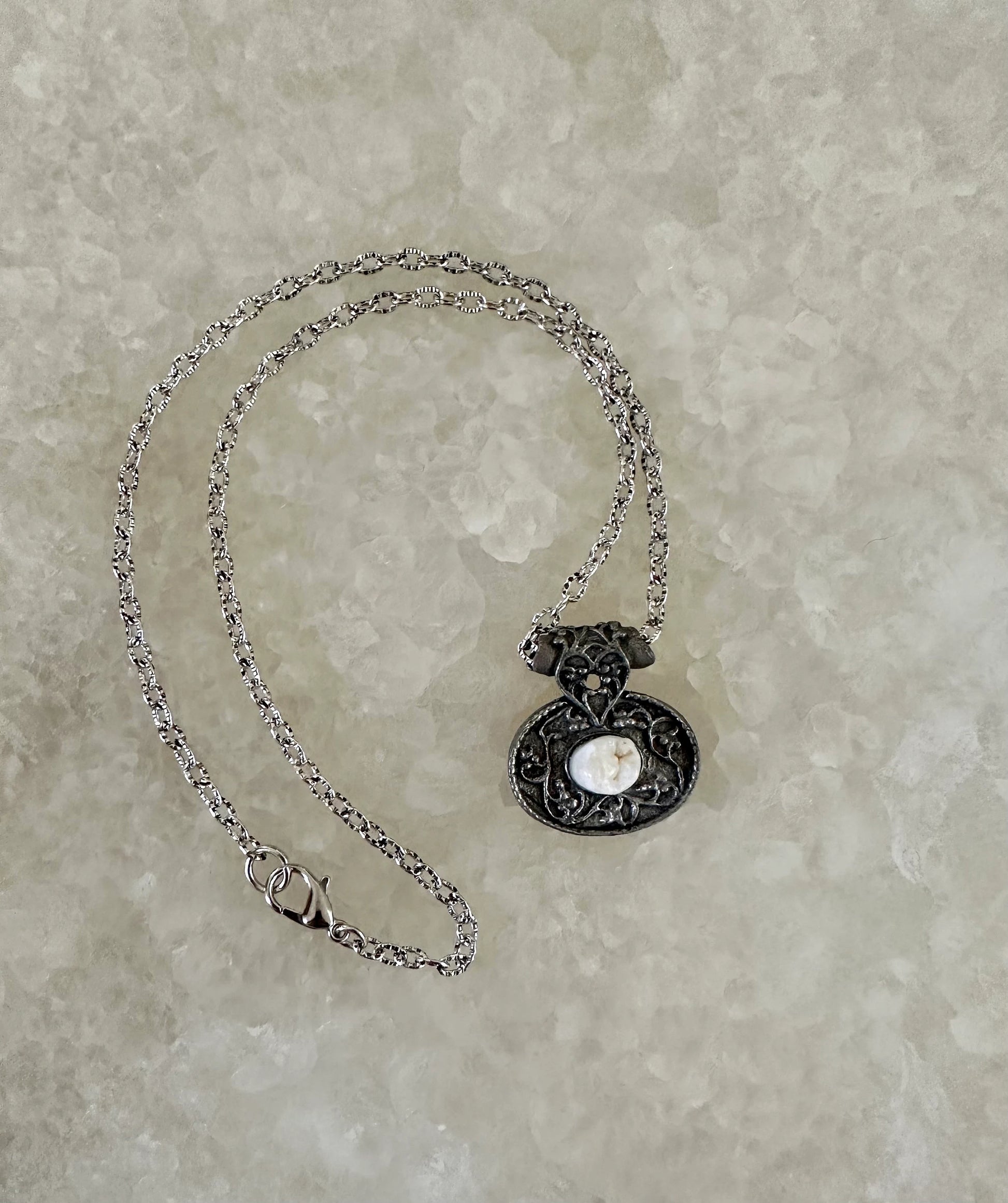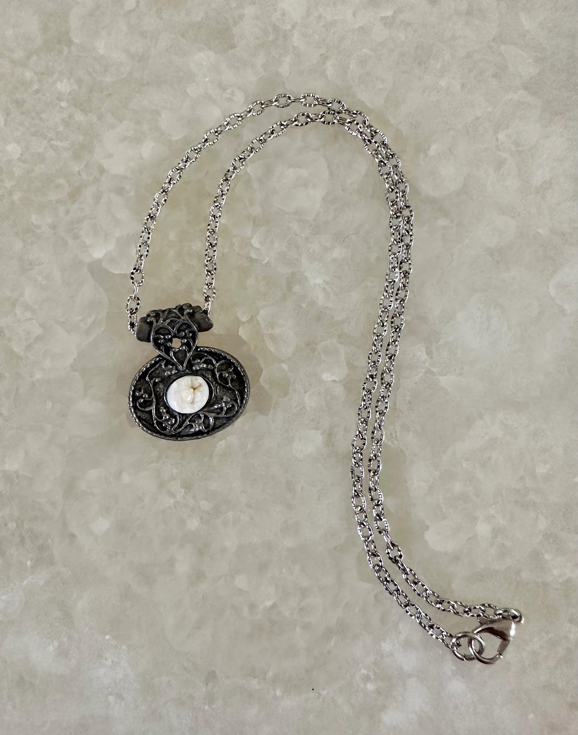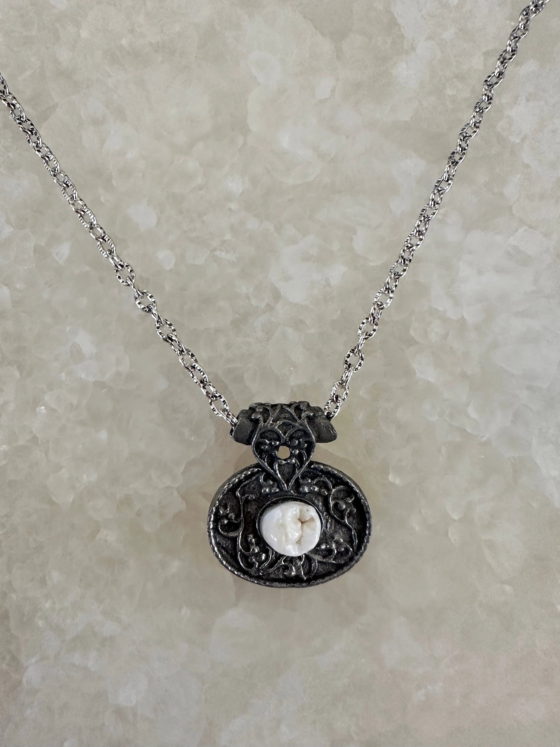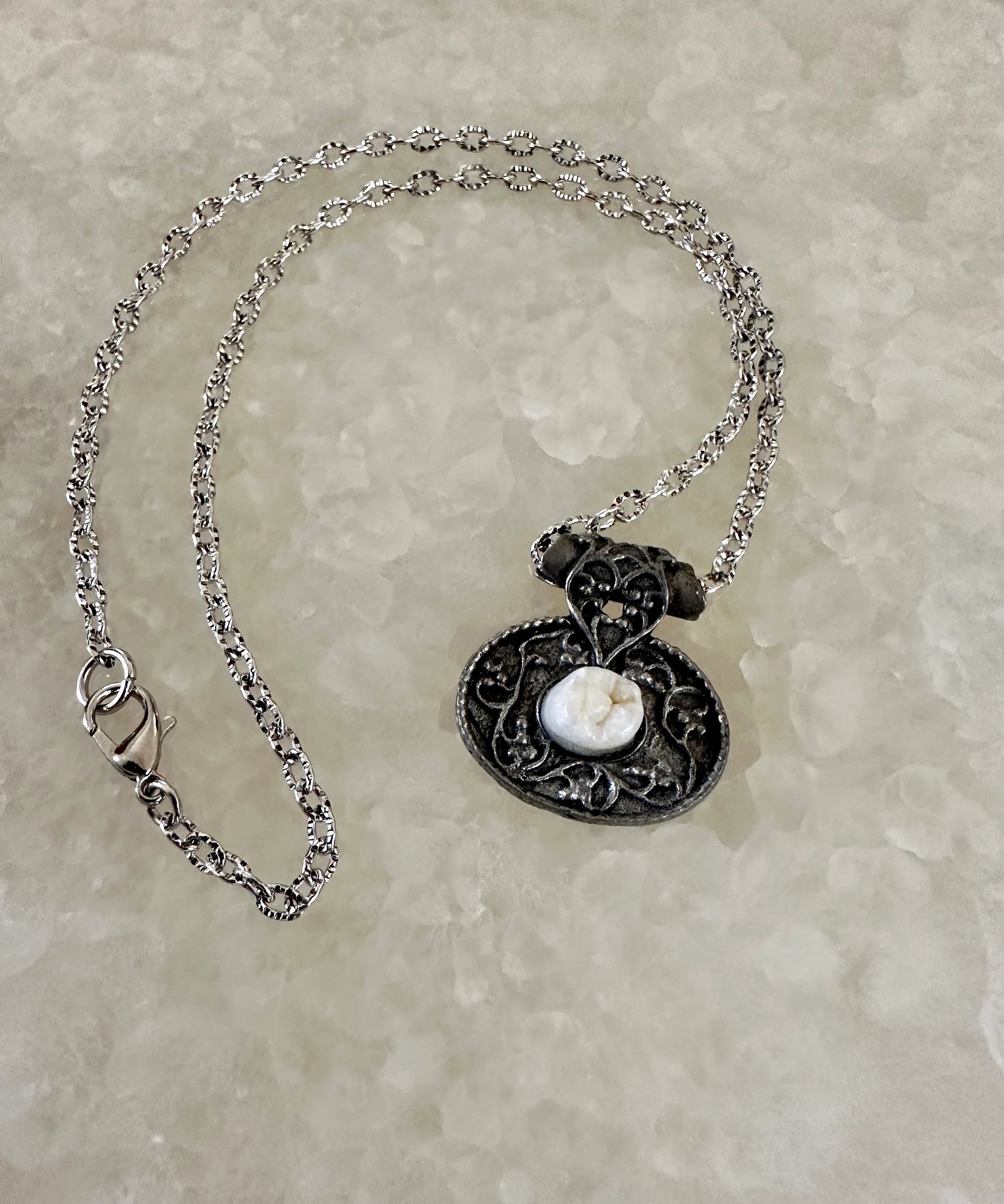 This unique choker necklace lays short on the neck and features a genuine human premolar set to a stunning dark silver setting