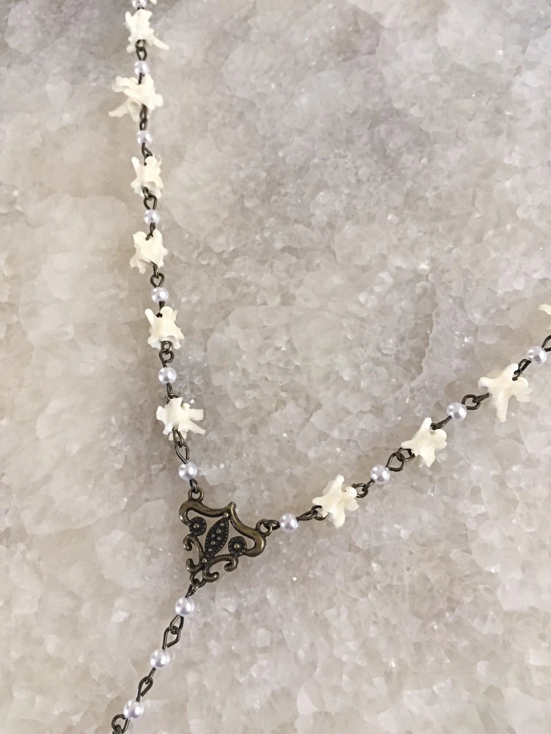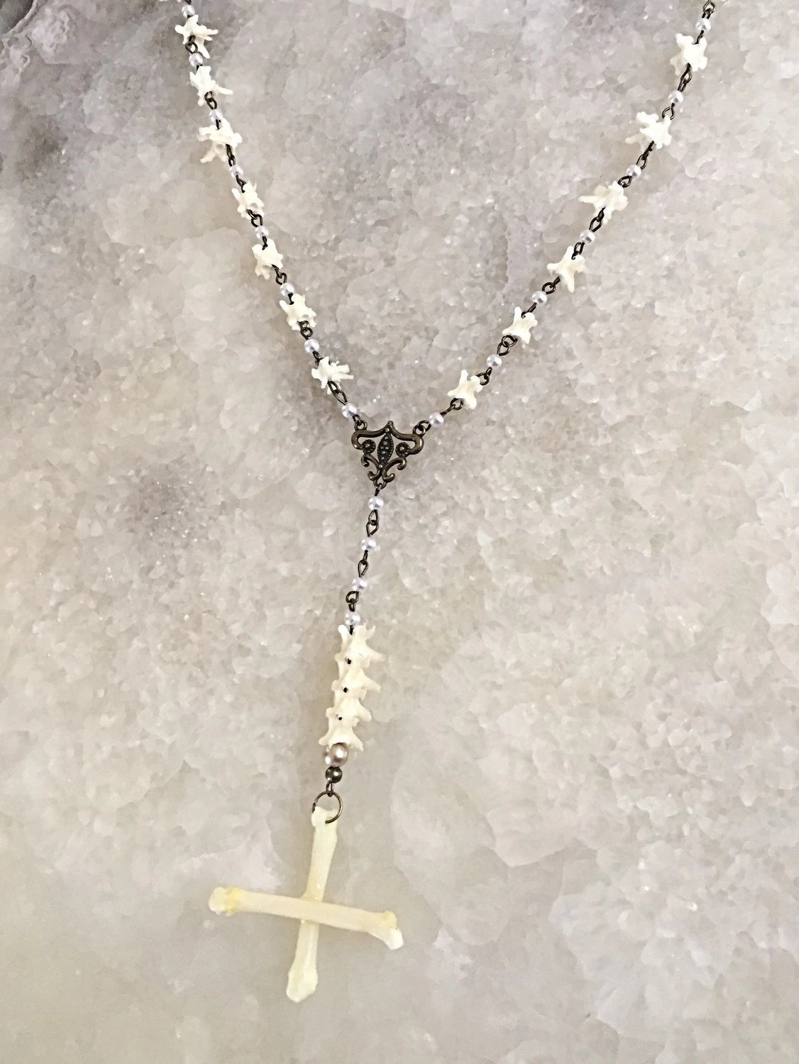 This Rosary style necklace is made of authentic rattlesnake vertebrae and small pearls linked together for chain with coyote tarsal bones created to form the cross