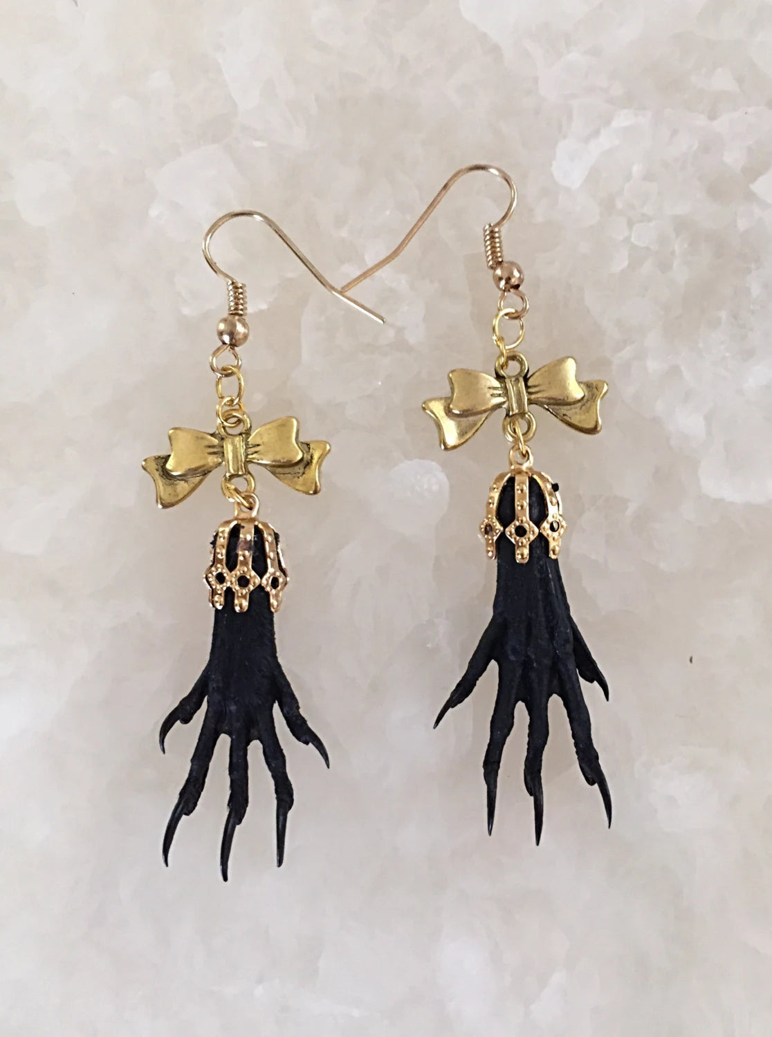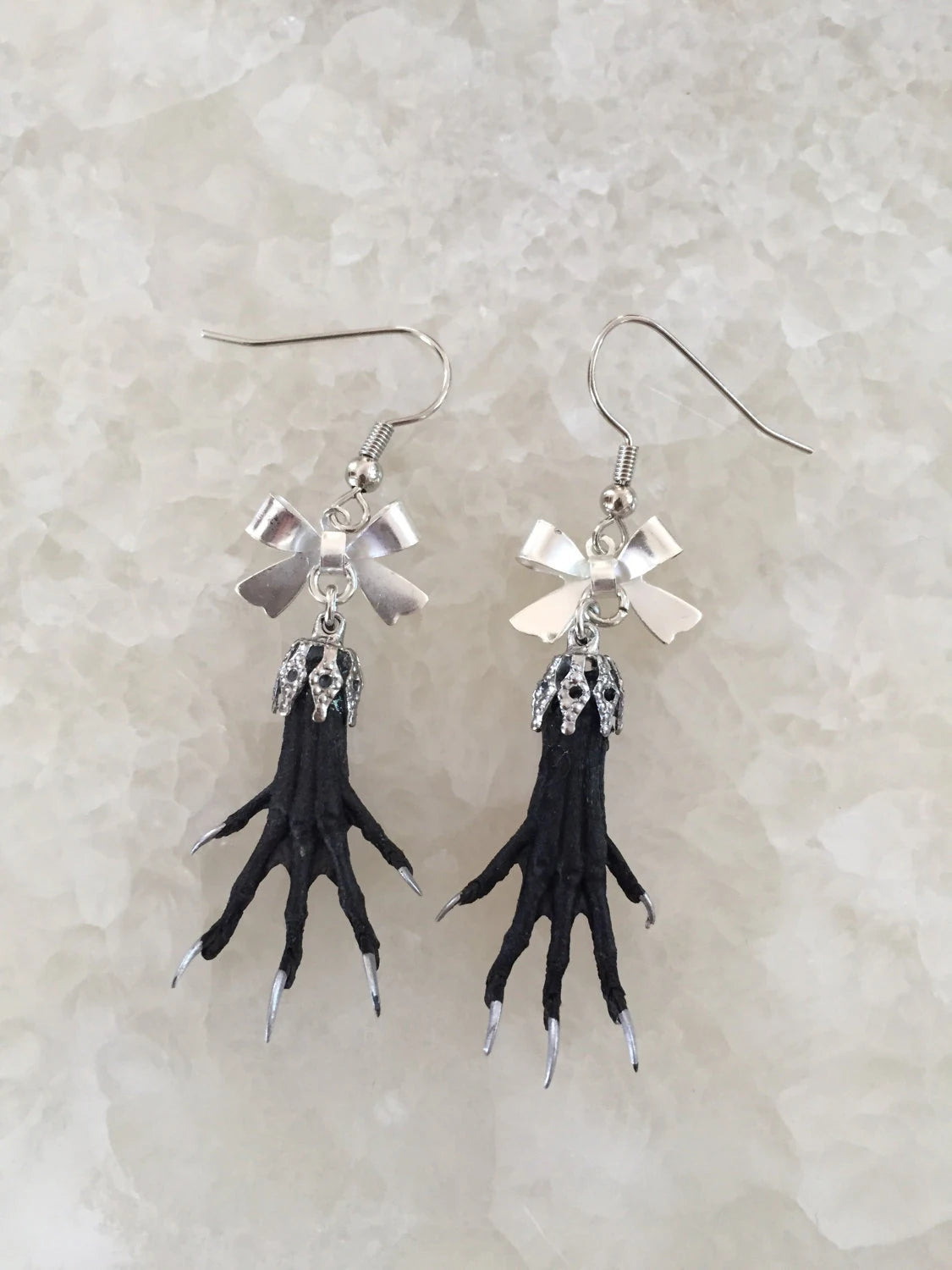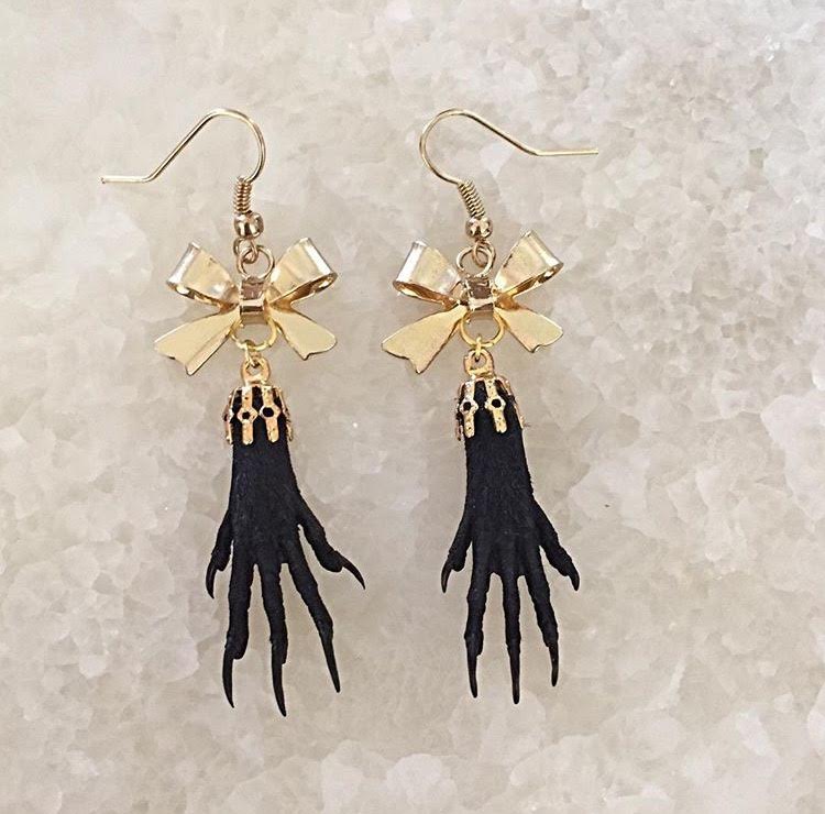 Genuine taxidermy paws dangle from bows as eye catching earrings
