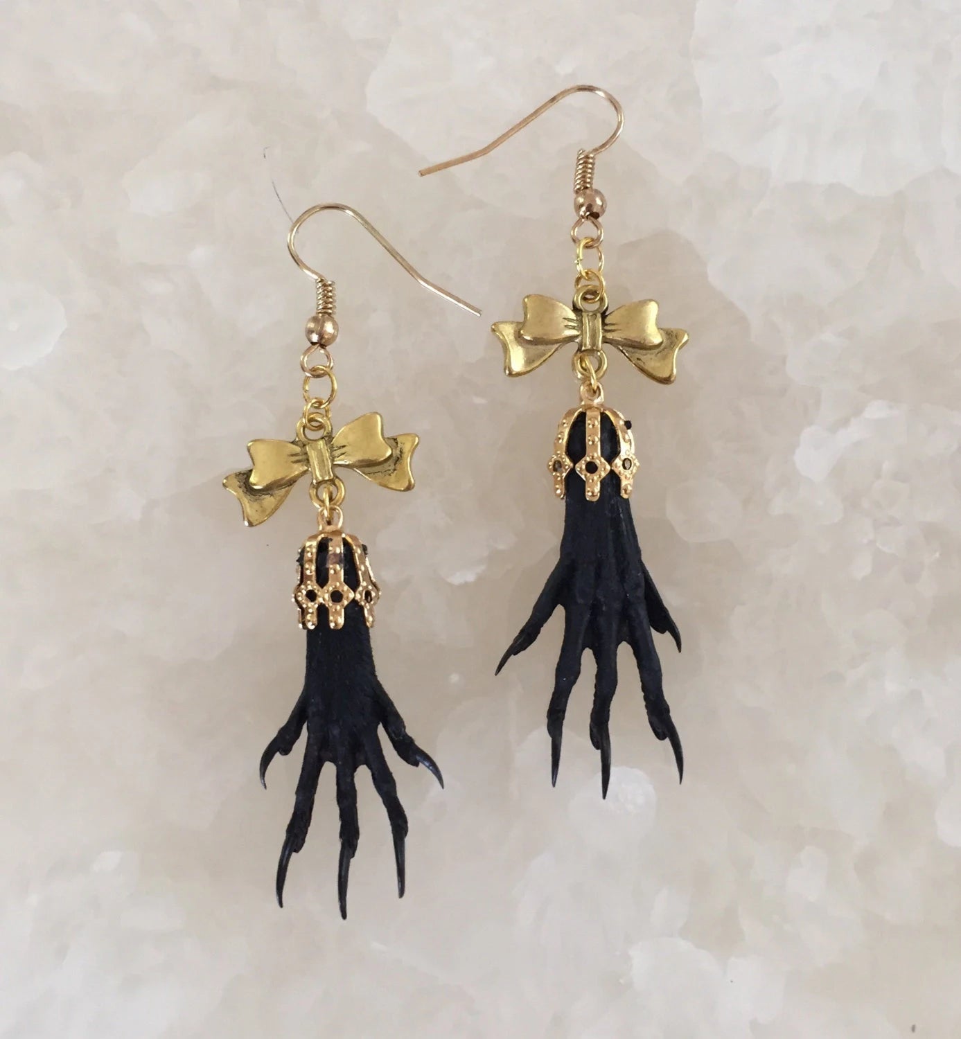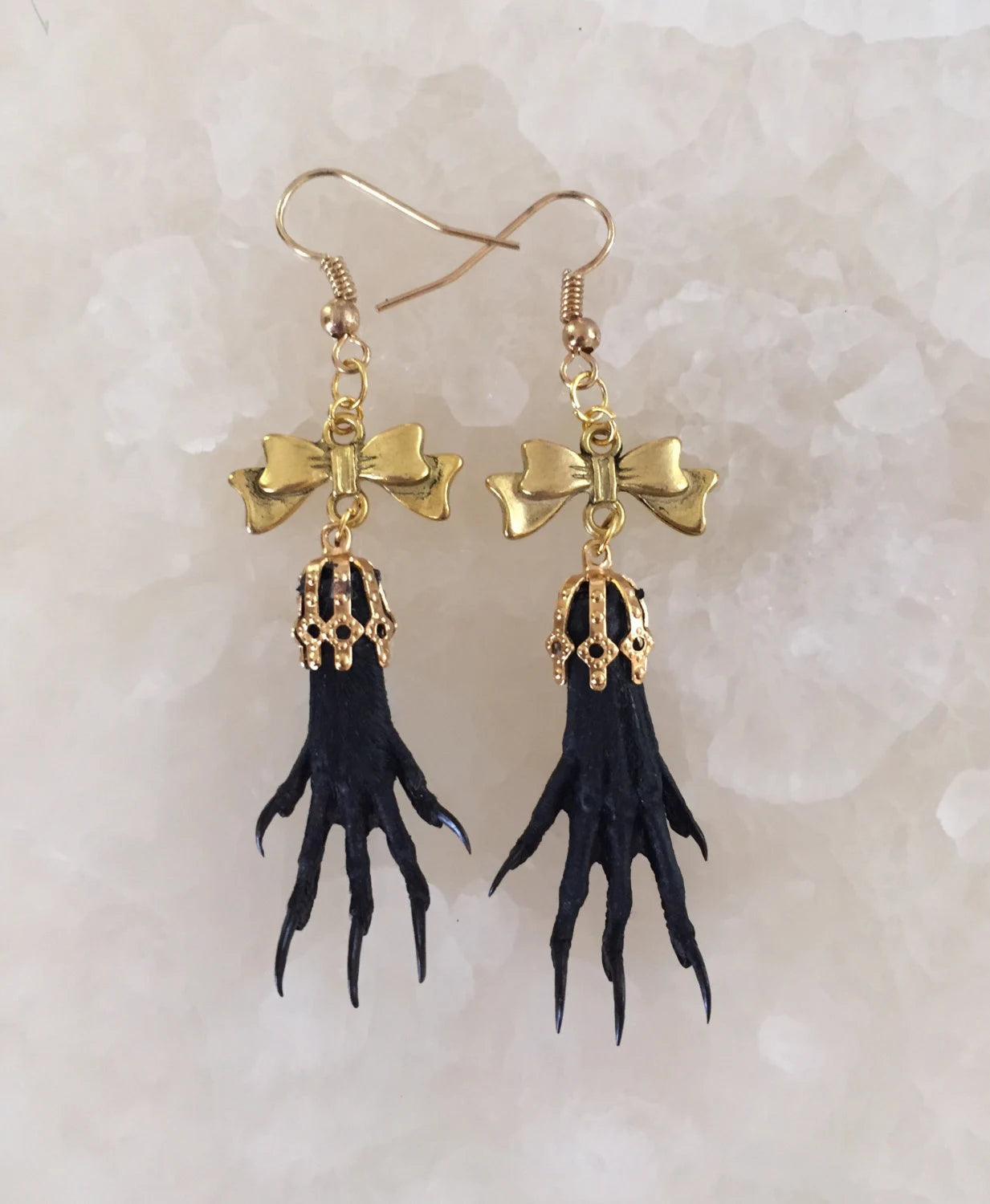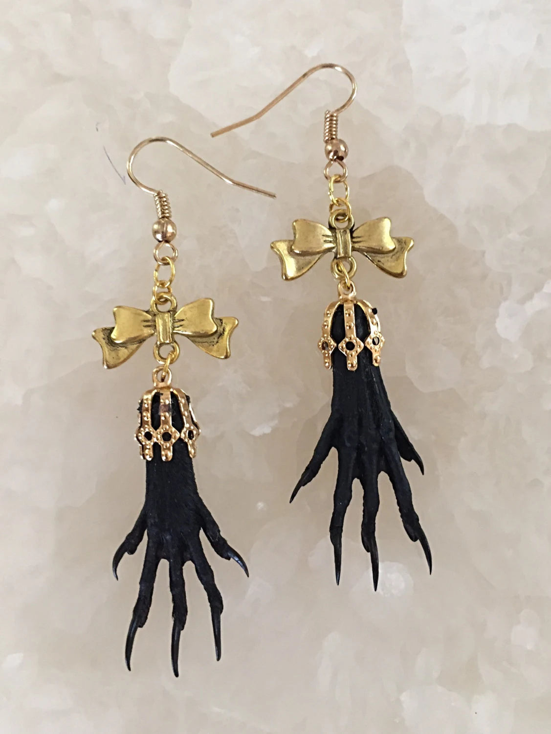 Genuine taxidermy paws dangle from bows as eye catching earrings
