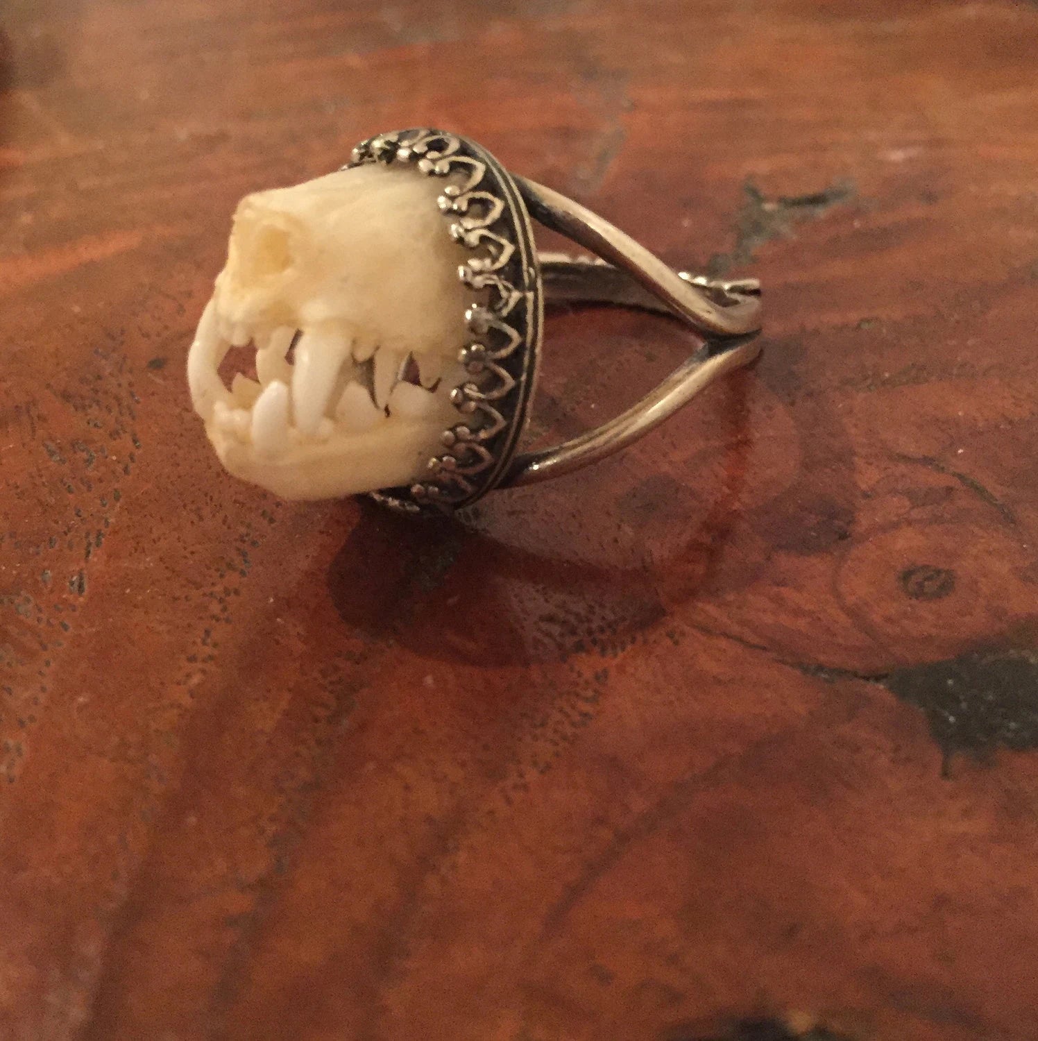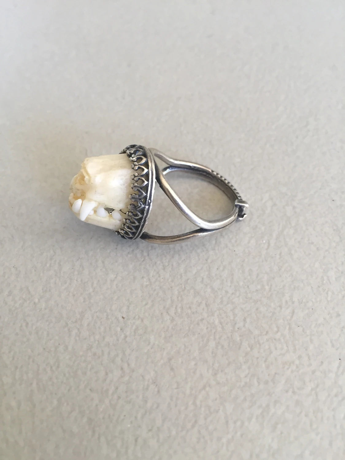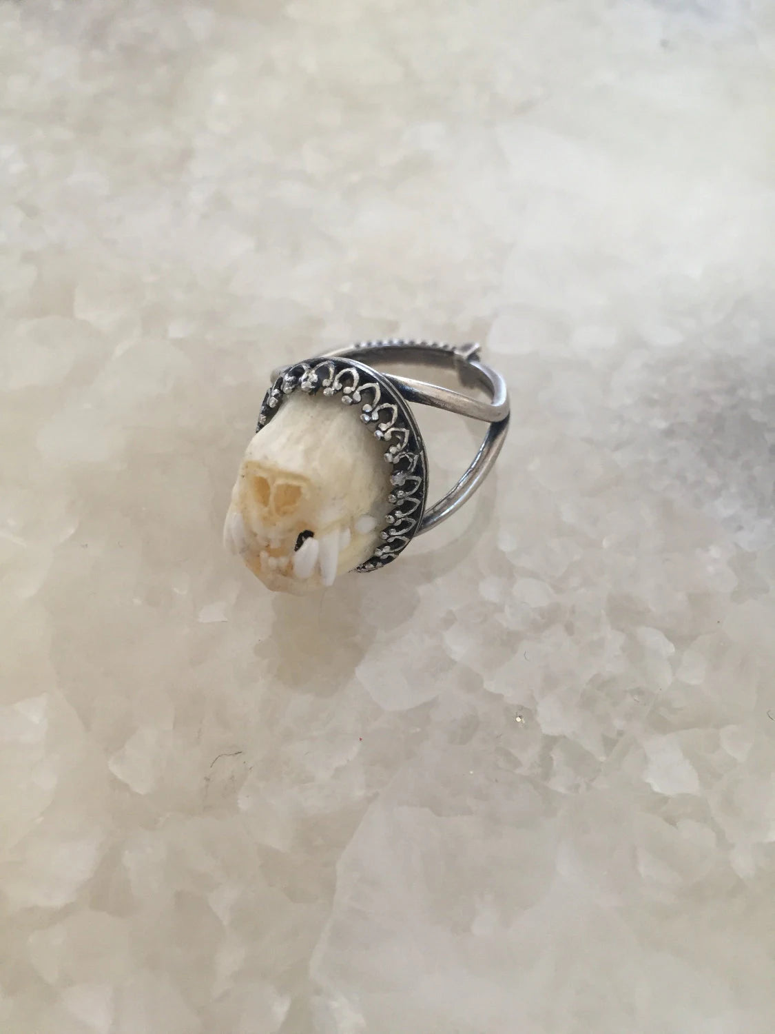 This unique charivari style ring is made from an authentic bat snout set to this elegant silver adjustable crown bezel ring setting