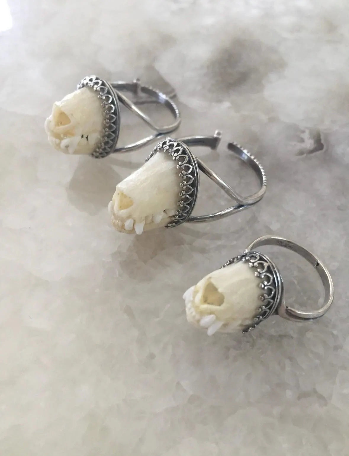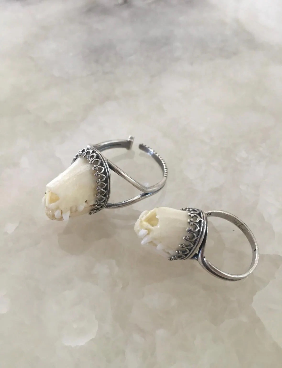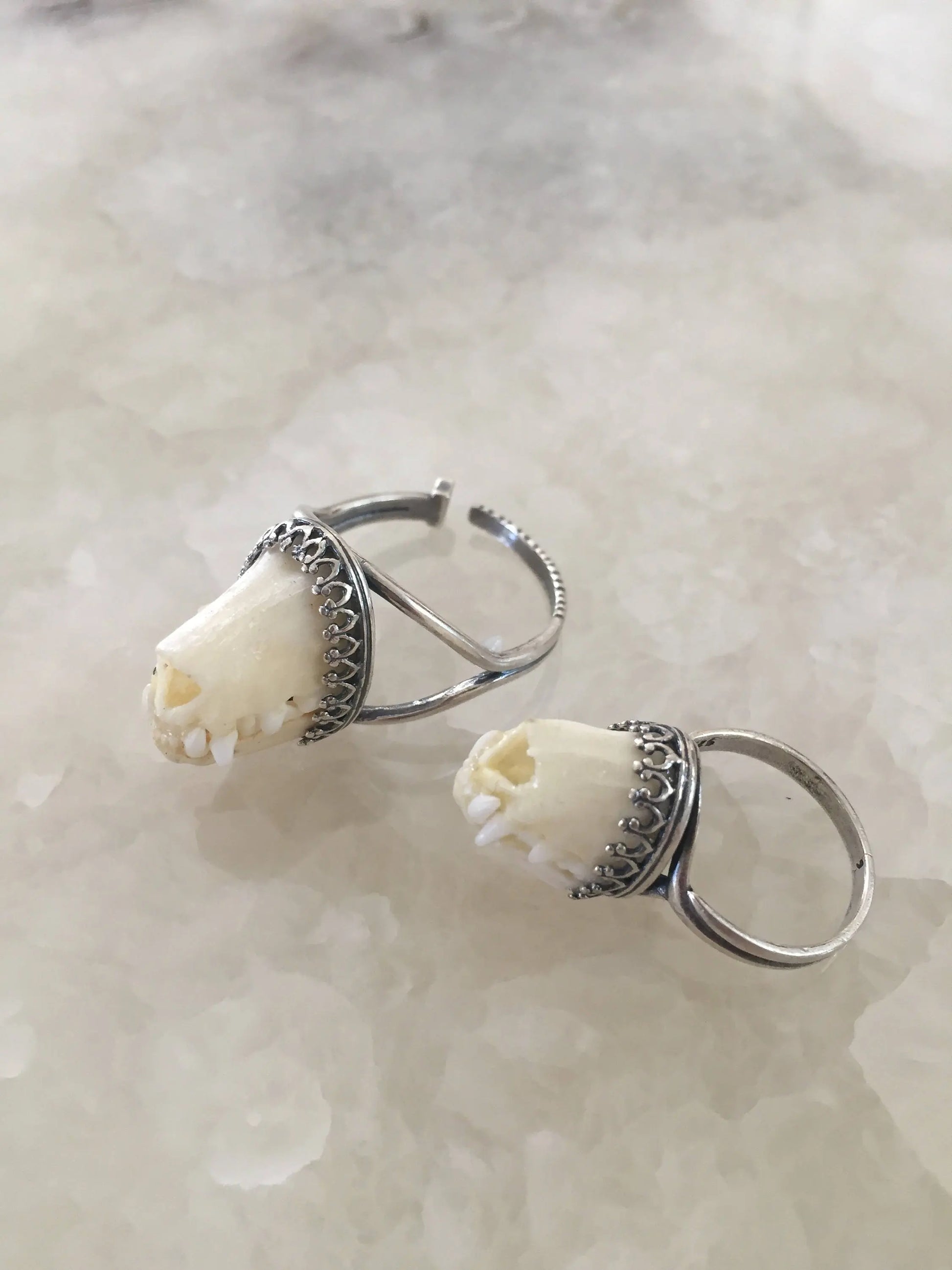 This unique charivari style ring is made from an authentic bat snout set to this elegant silver adjustable crown bezel ring setting