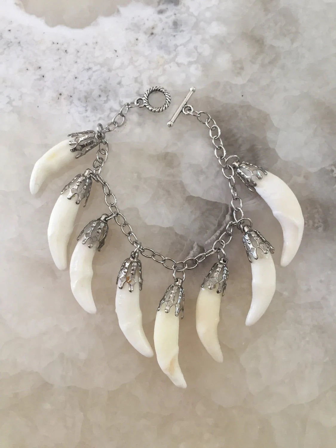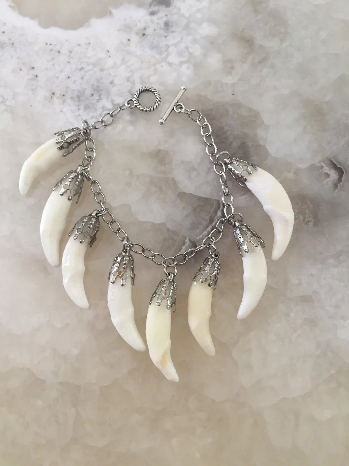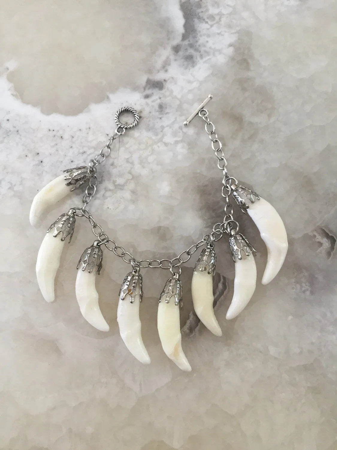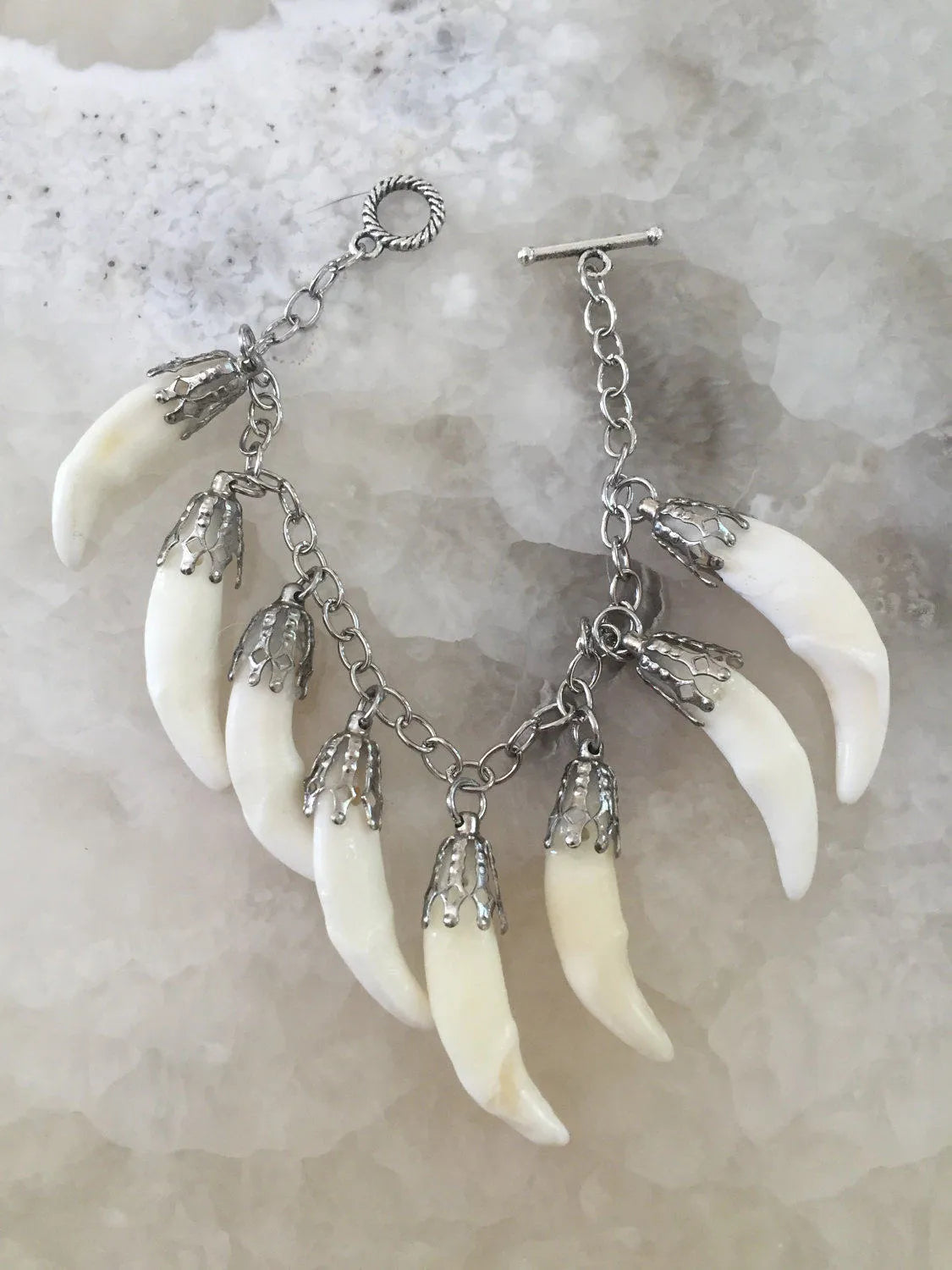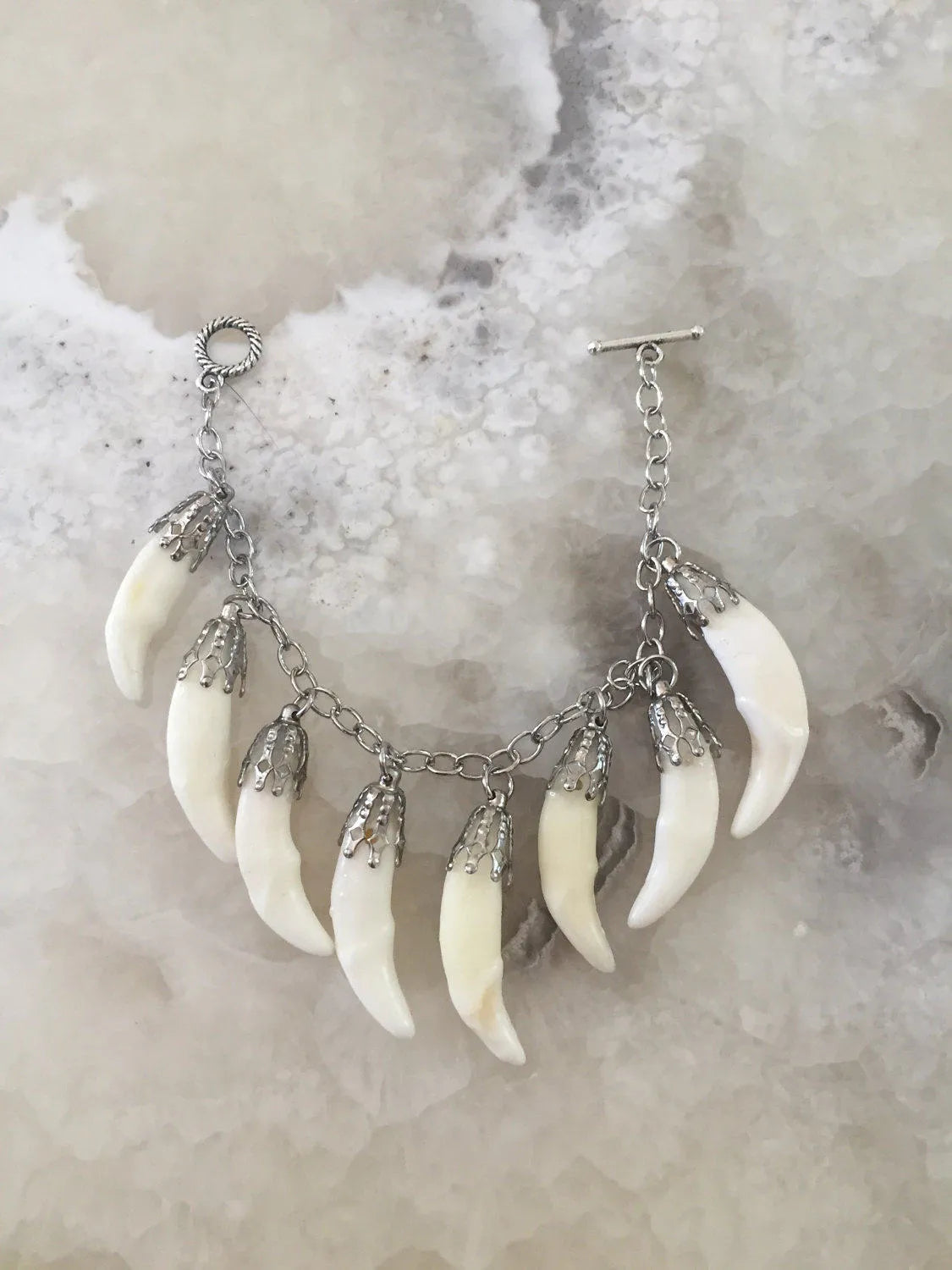8 Authentic coyote teeth are silver pronged and hang from a silver chain bracelet