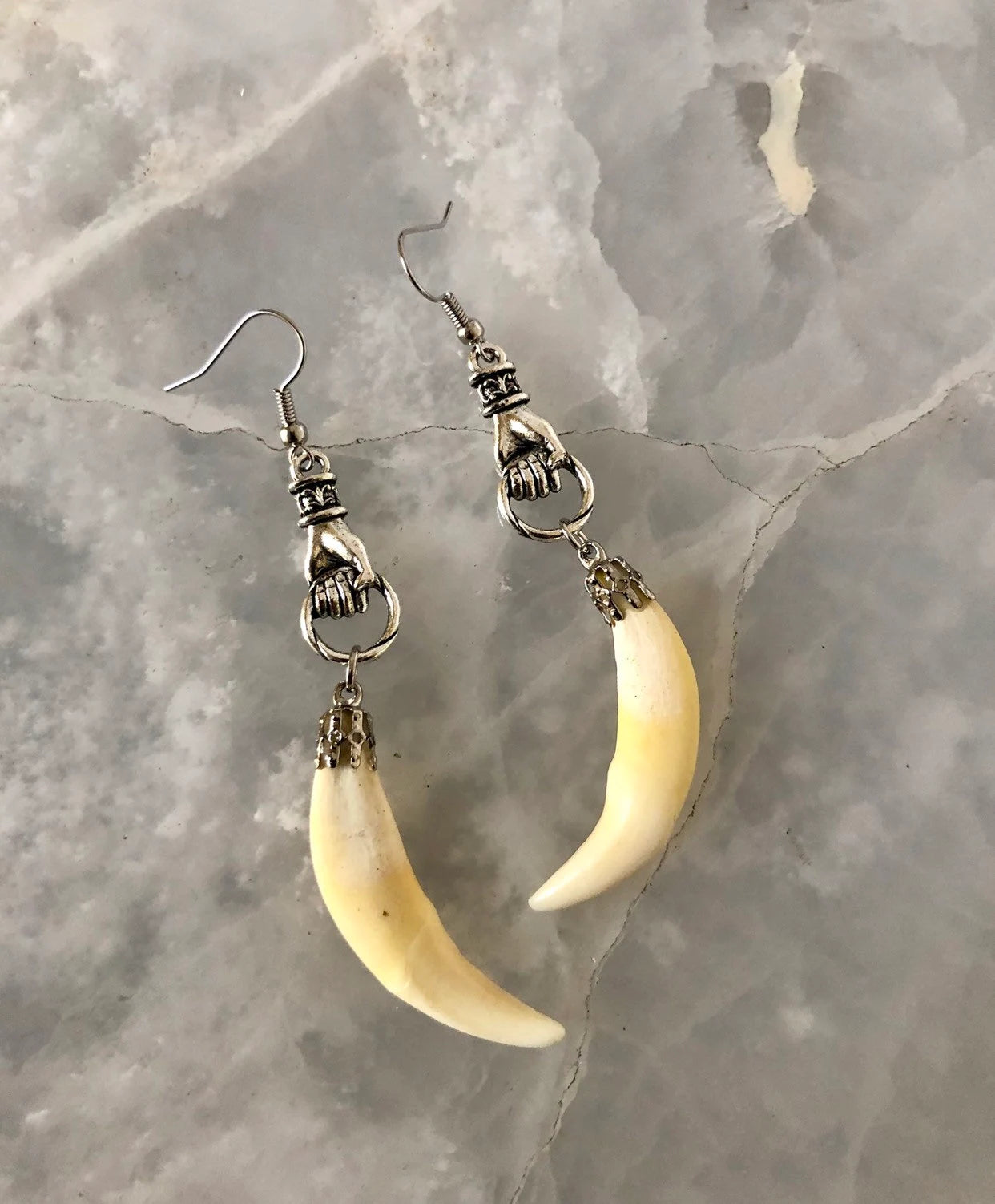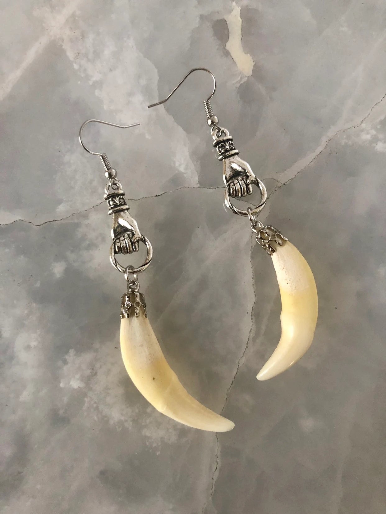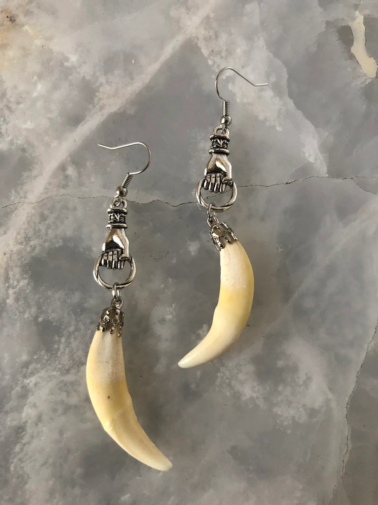 Authentic Coyote fangs dangle from silver hands as unique earrings