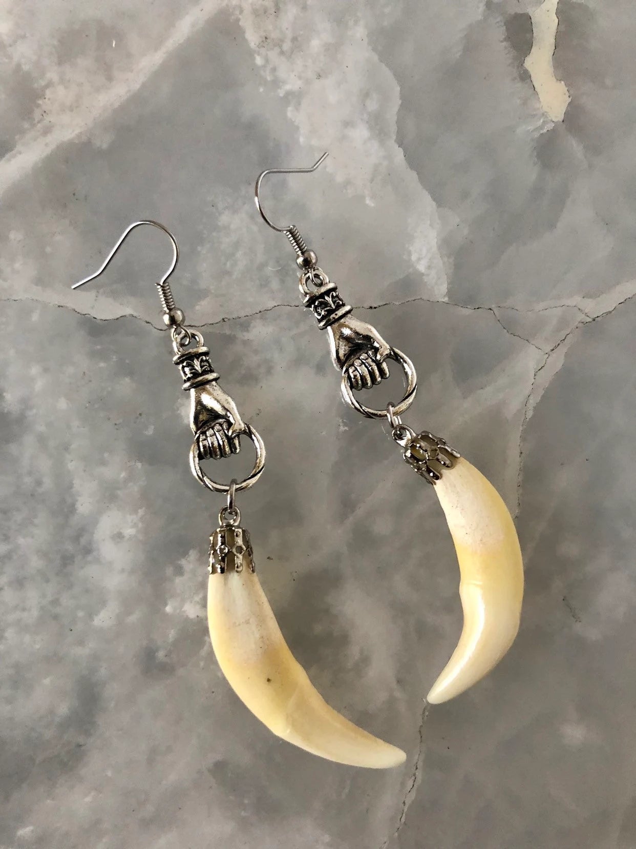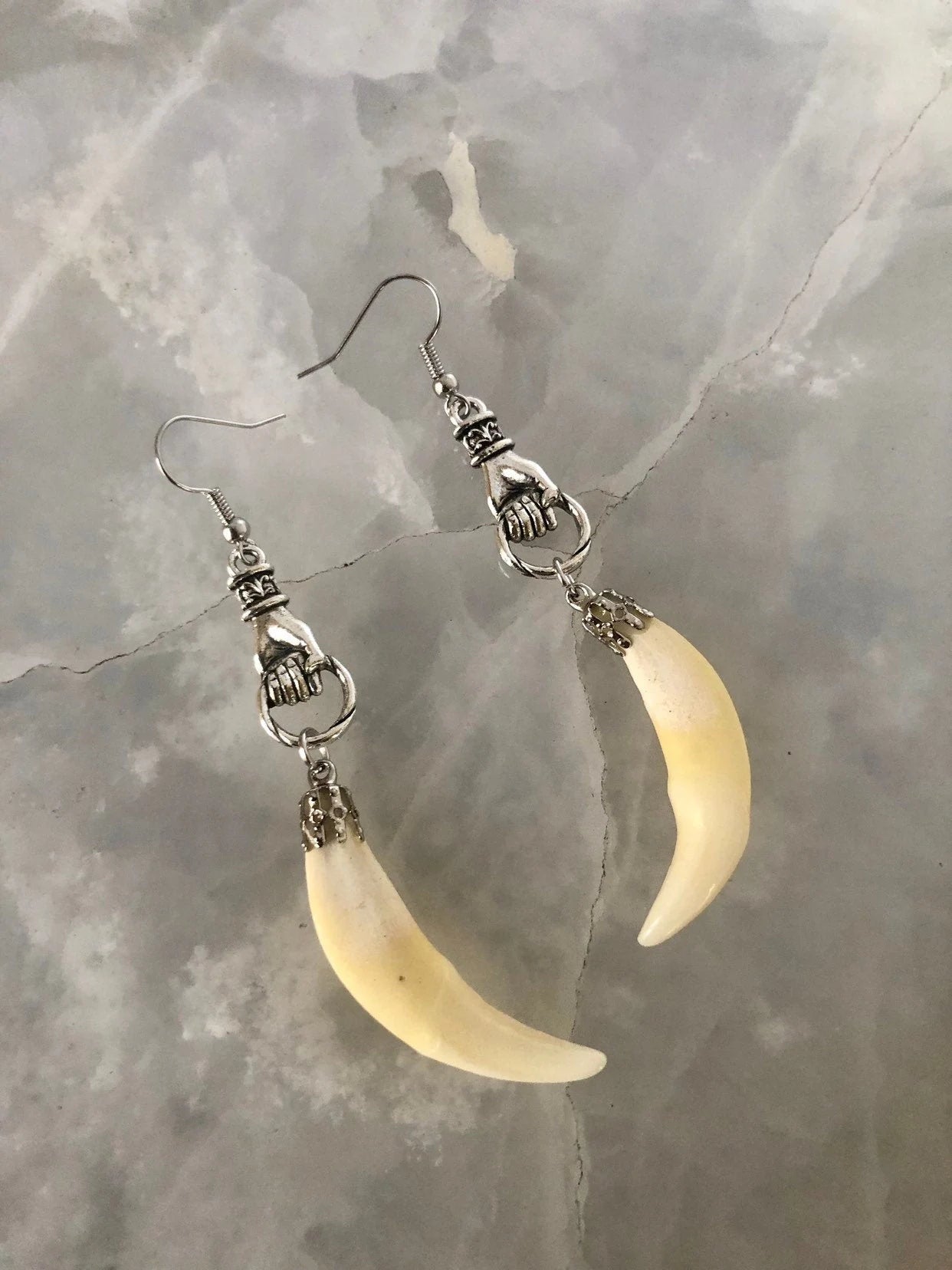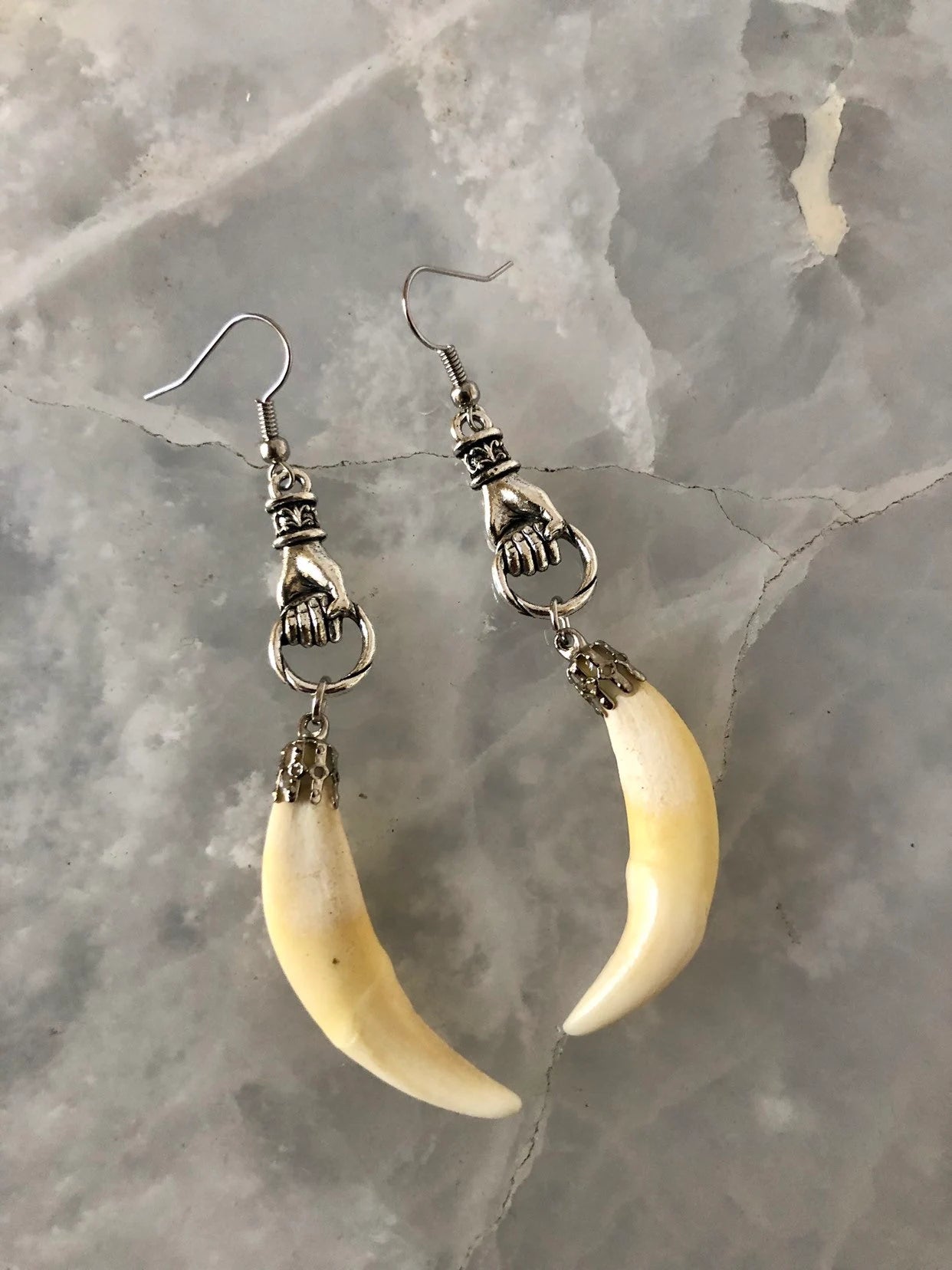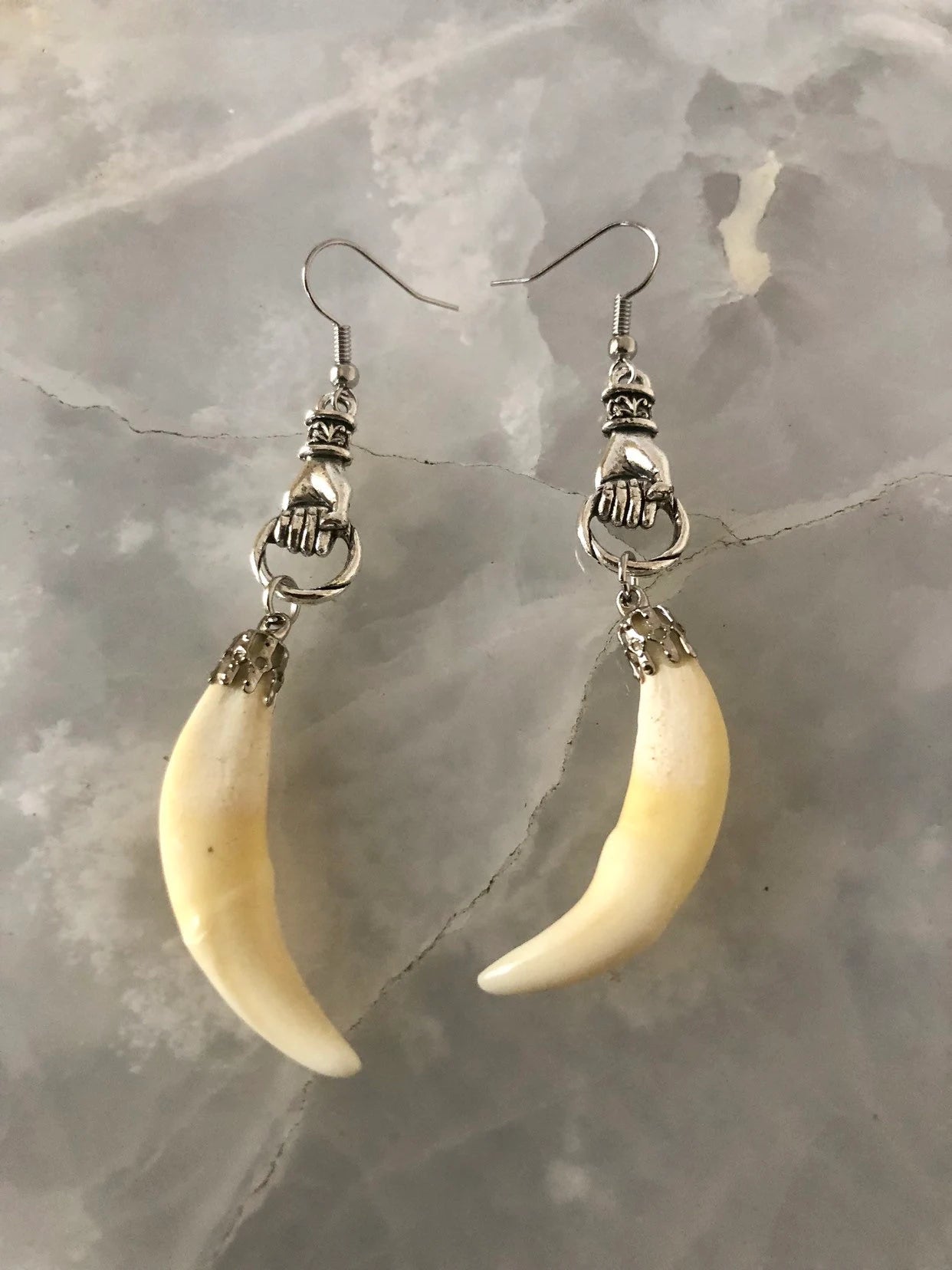 Authentic Coyote fangs dangle from silver hands as unique earrings