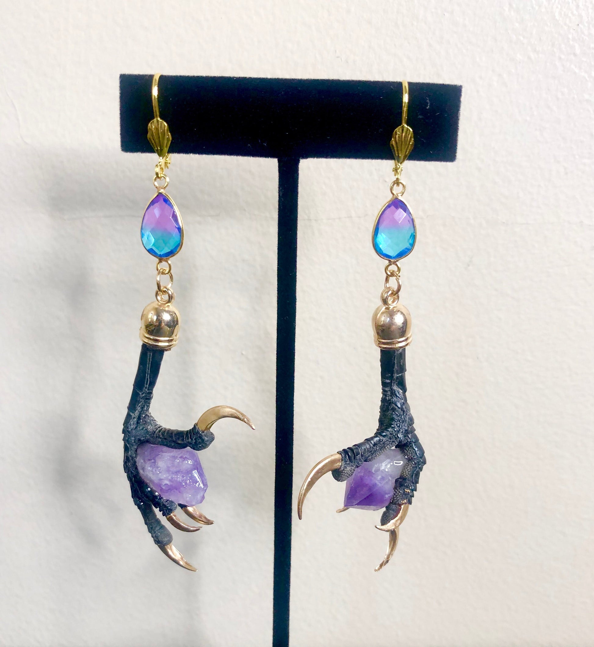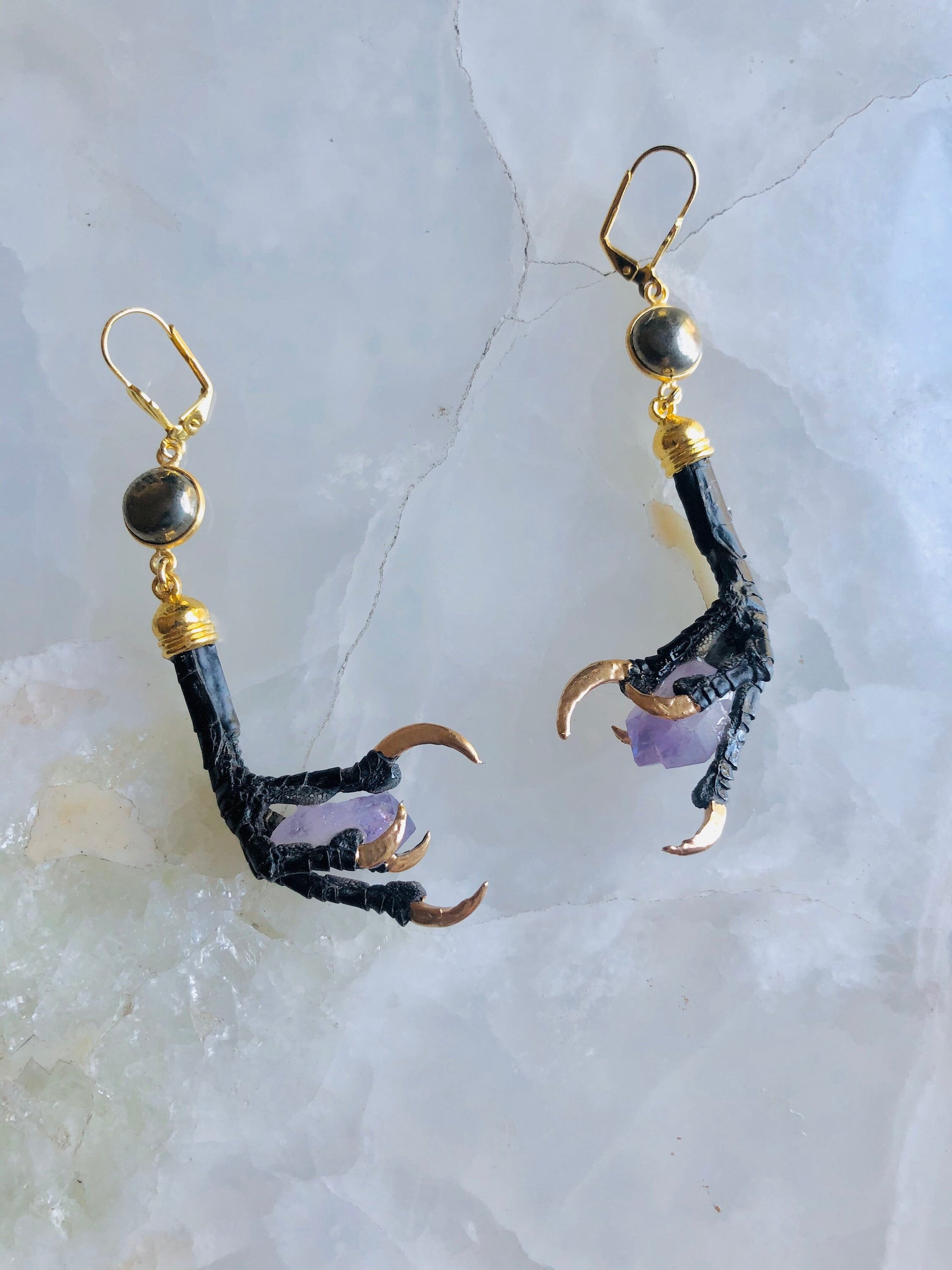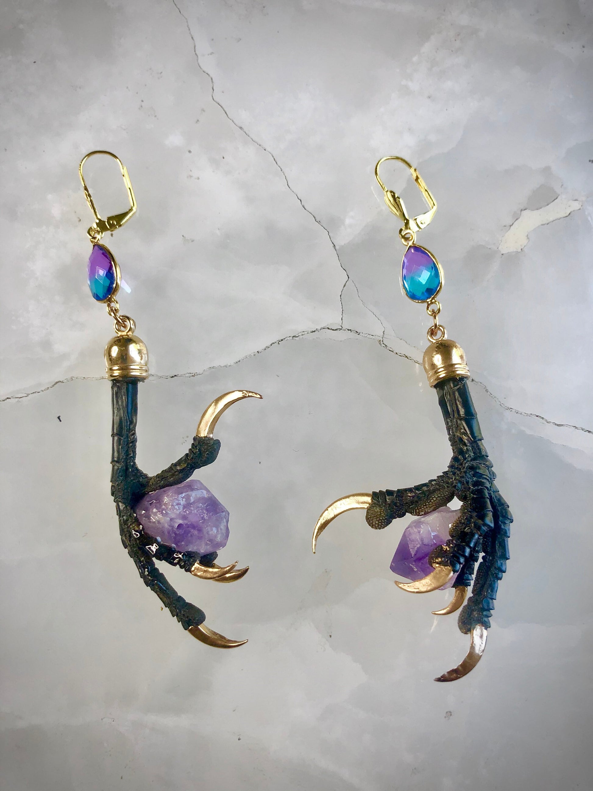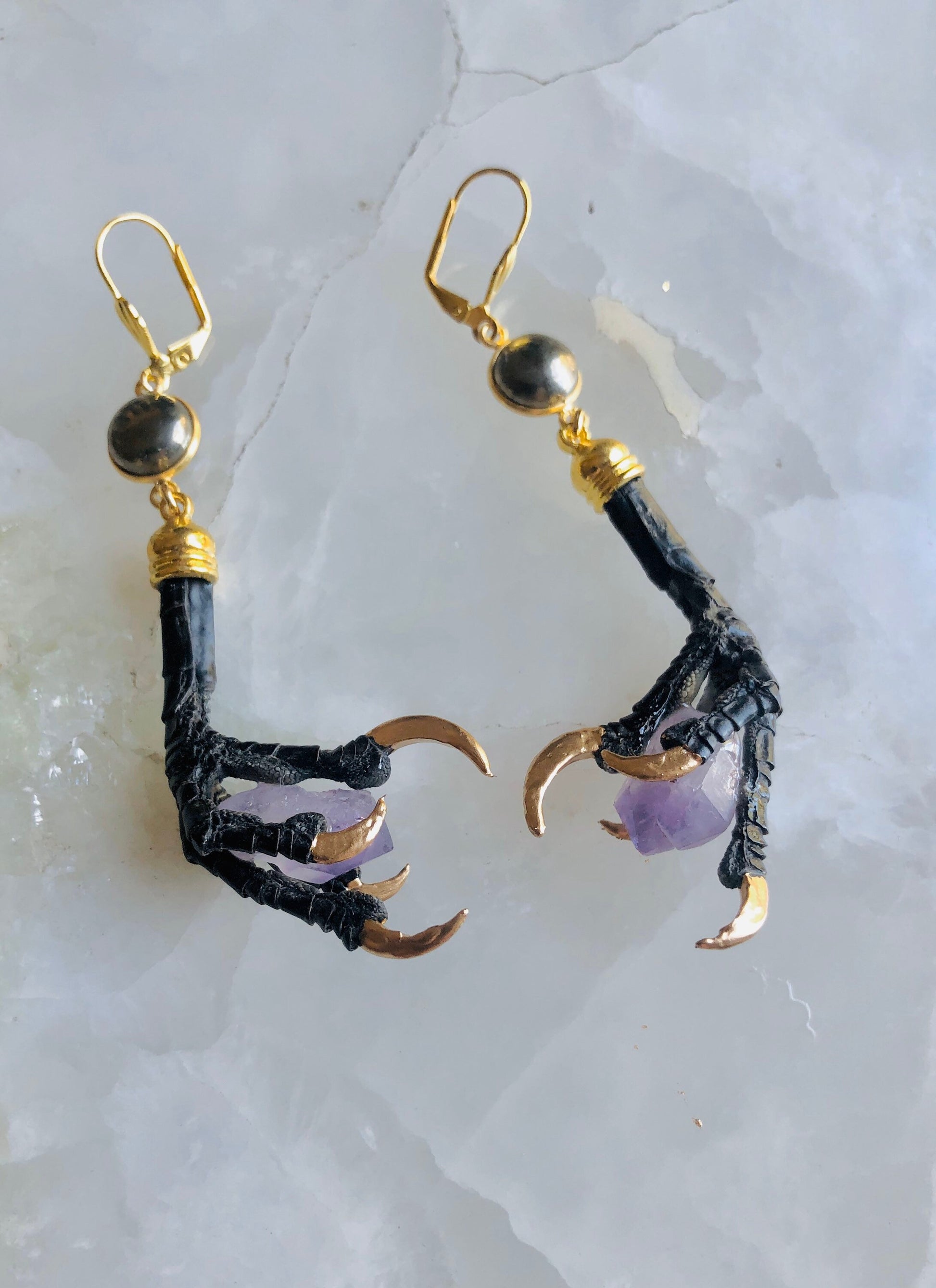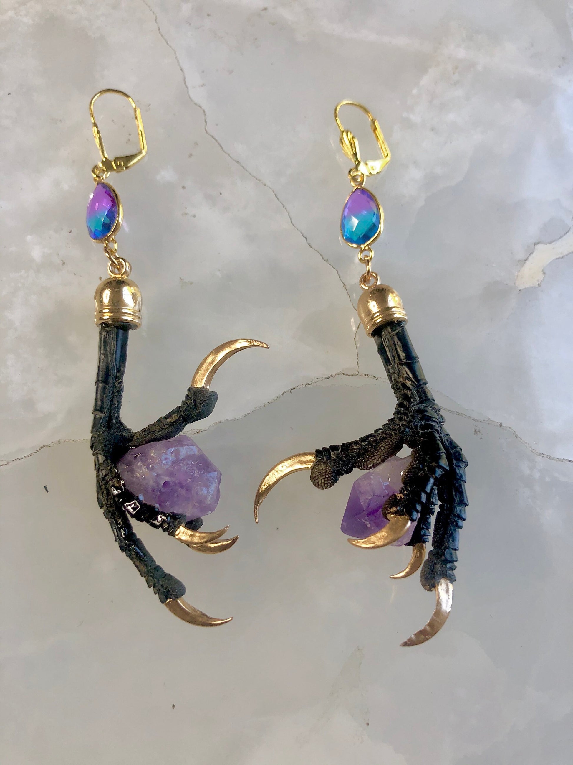 Authentic crow feet with gold gilded nails clutch on to chucks of amethyst and hang from gold caps with precious stones