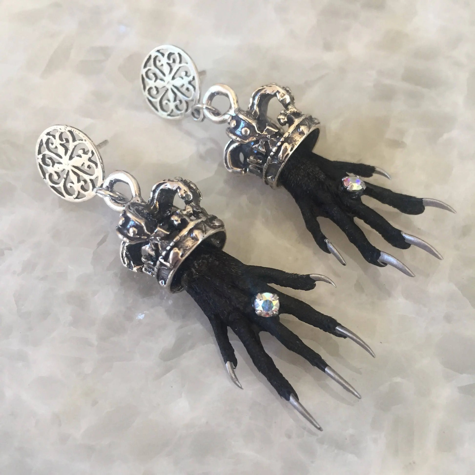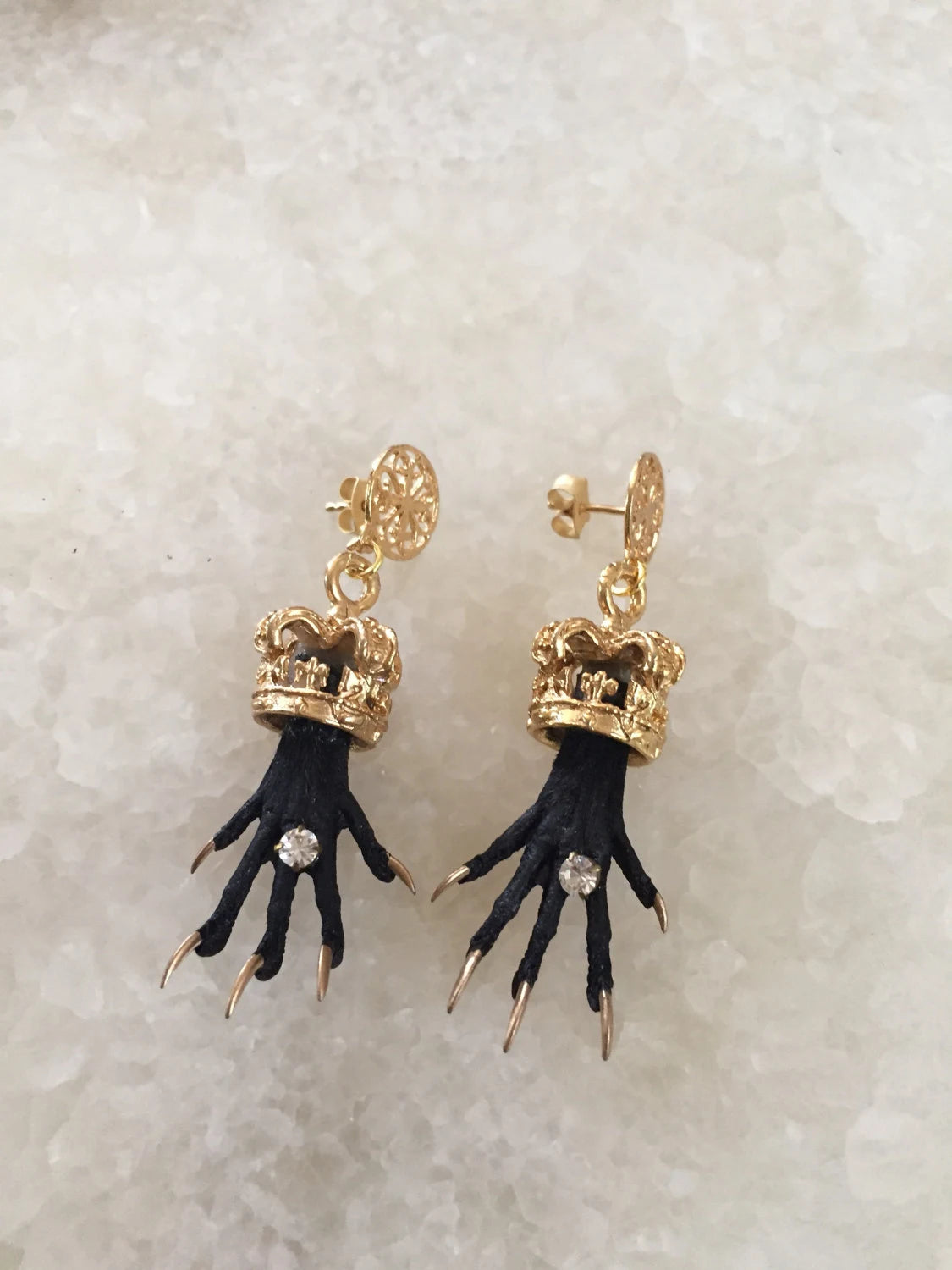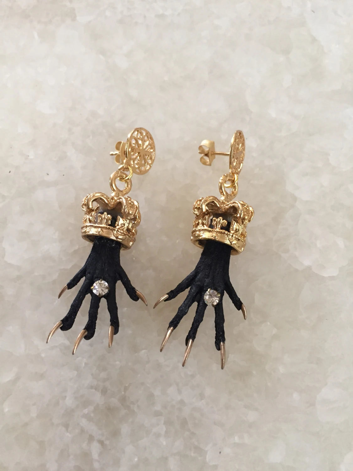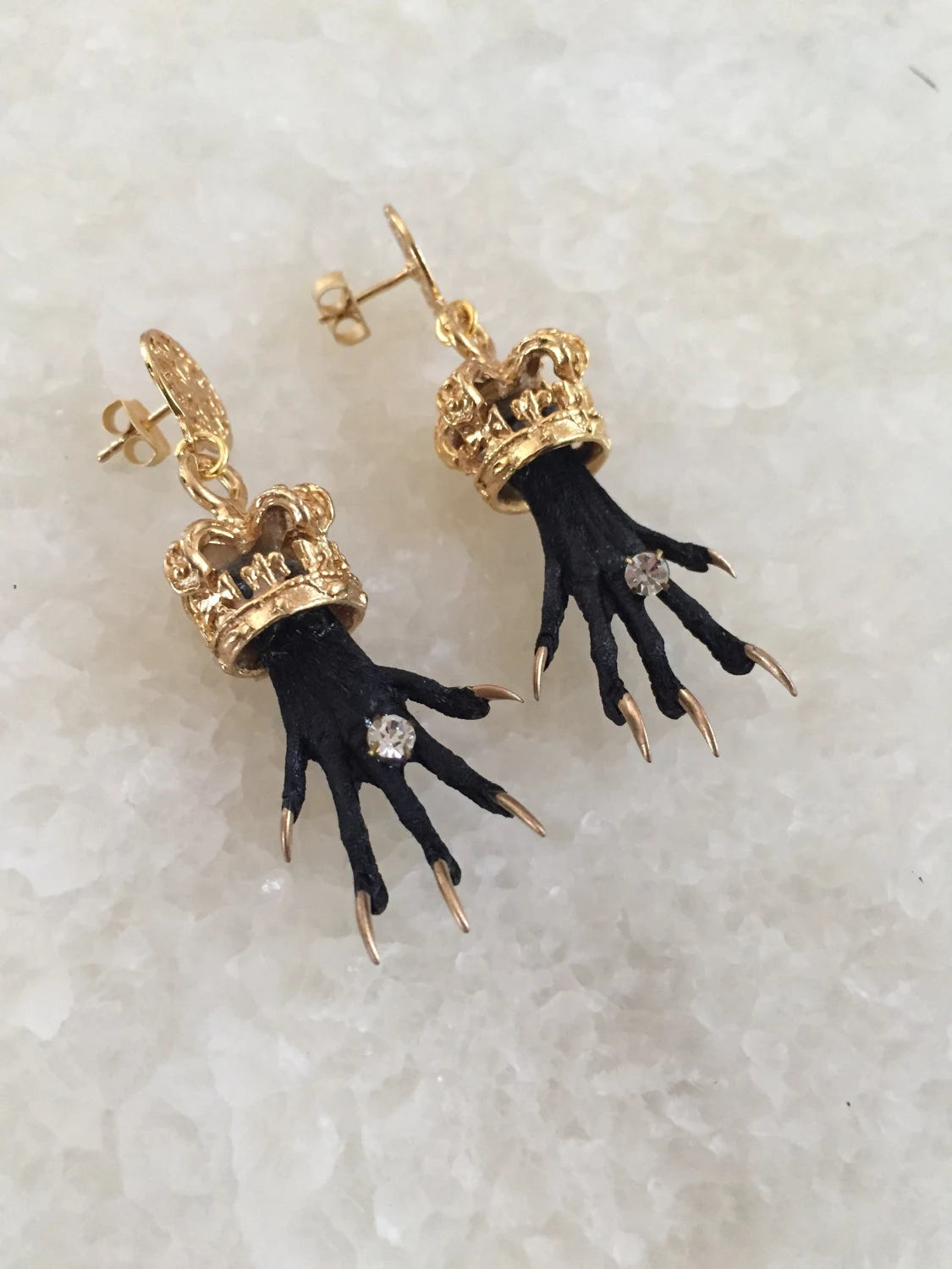 From filigree earring studs hang sterling silver crowns that hold authentic taxidermy rodent paws with gold gilded nails that wear Swarovski crystal rings.