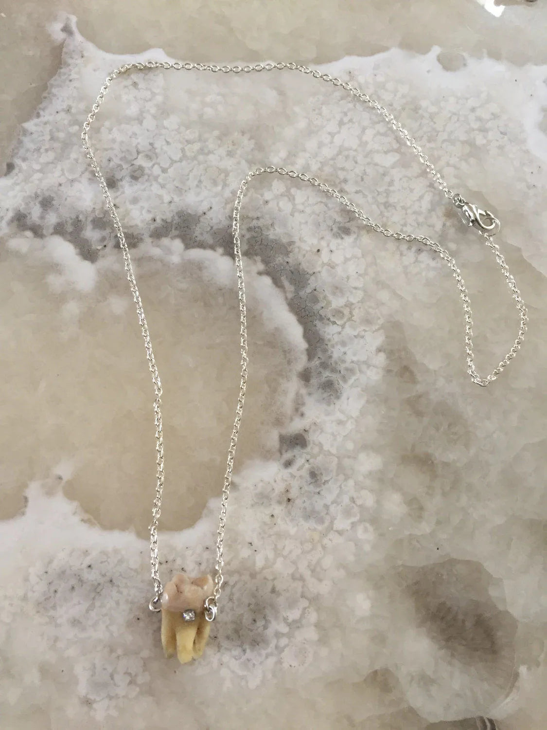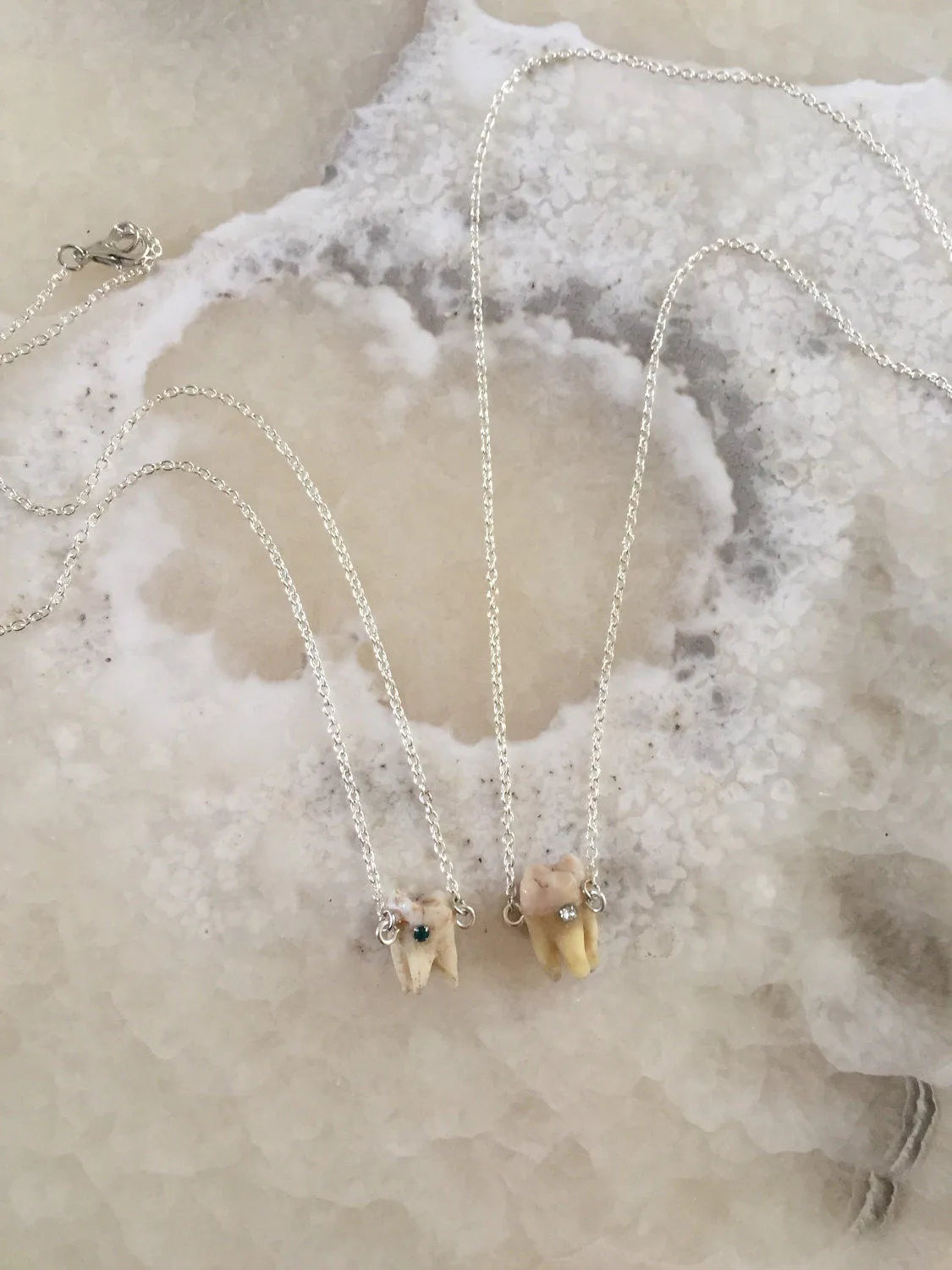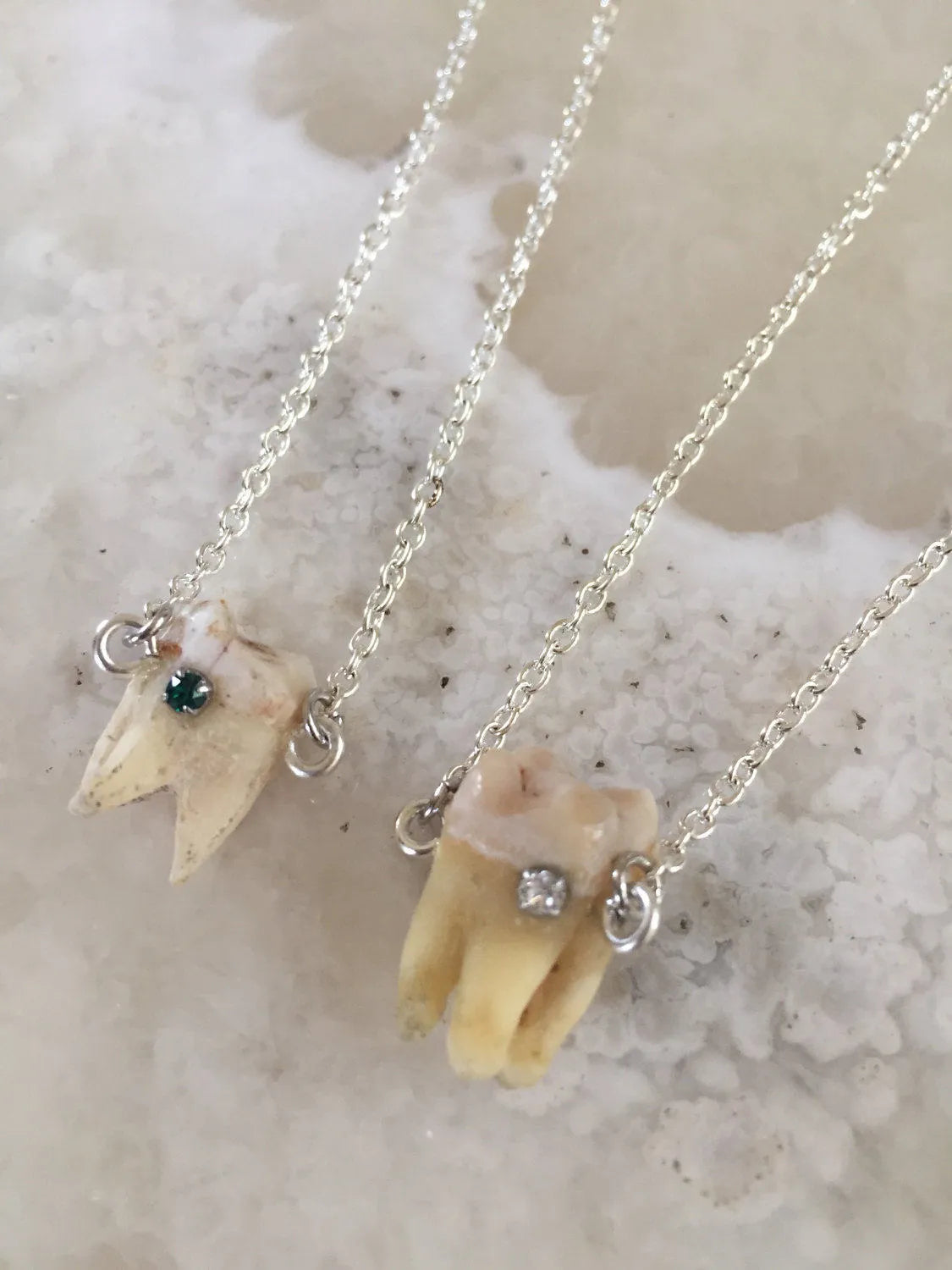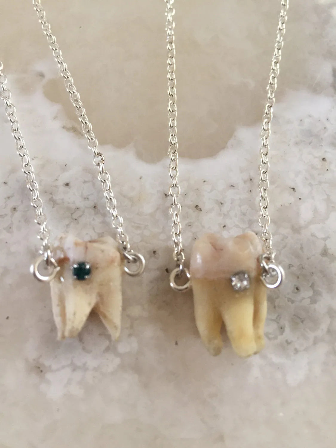 This real human tooth has been turned into a necklace with a Swarovski crystal drilled into it and hangs by a screws on a long silver chain