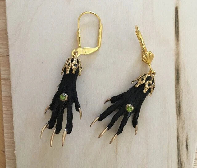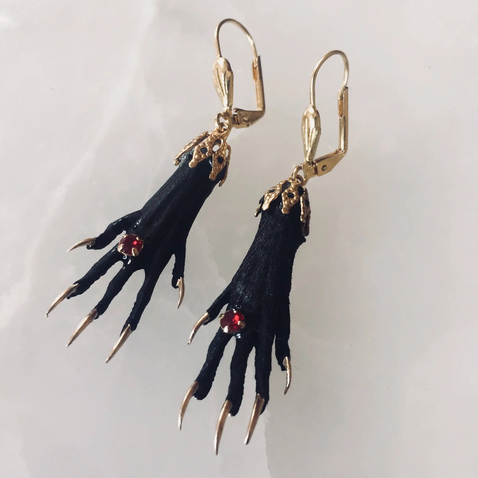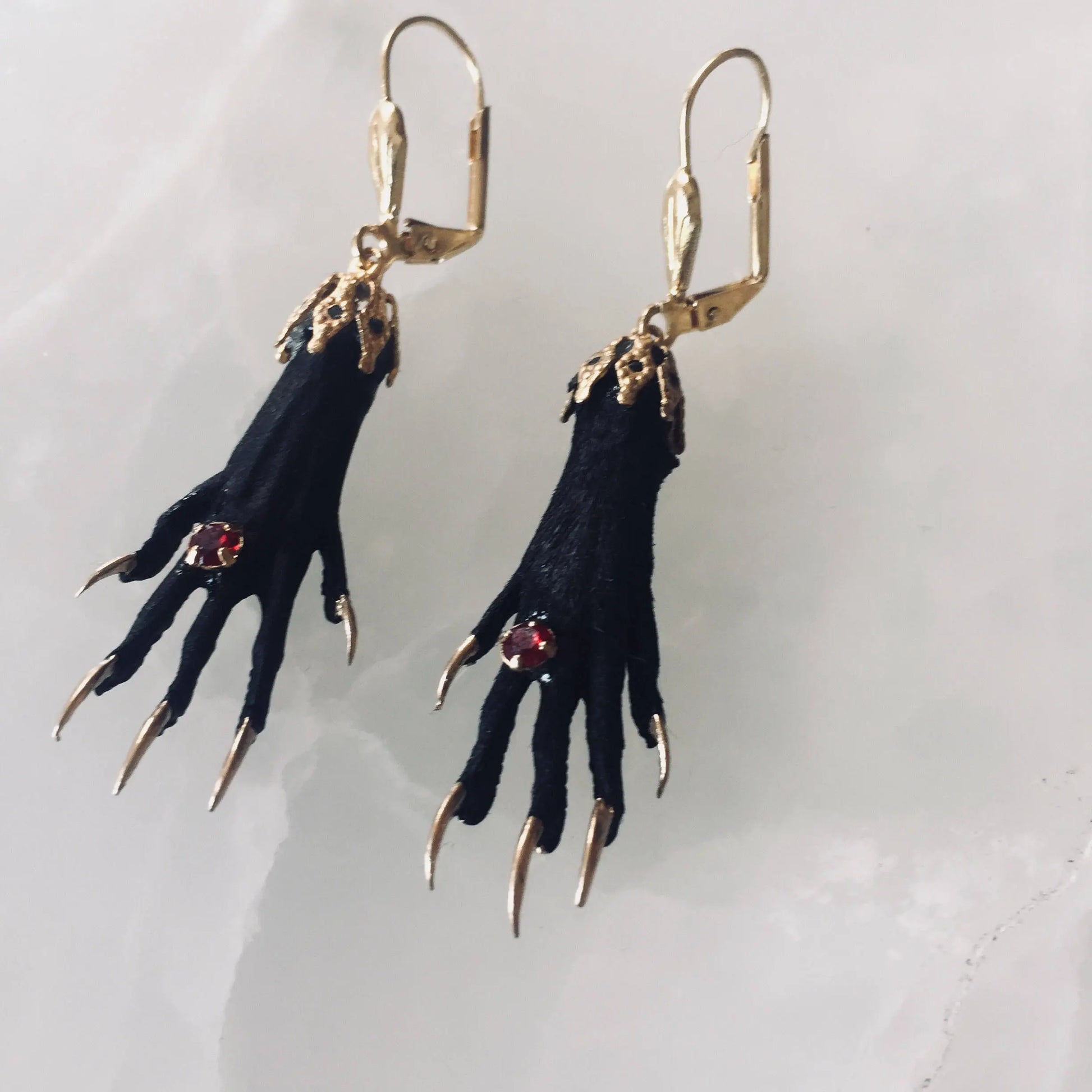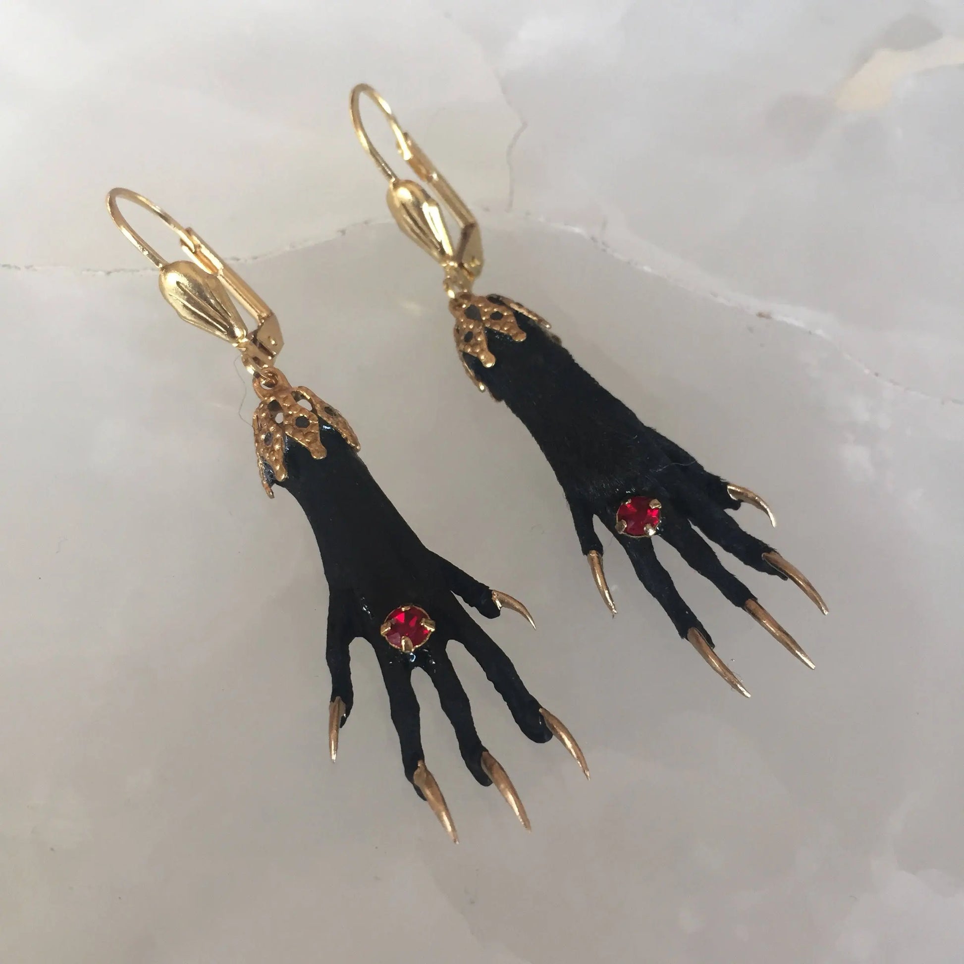 Authentic taxidermy paws with gold gilded nails wear red crystal rings and hang from decorative earring hooks