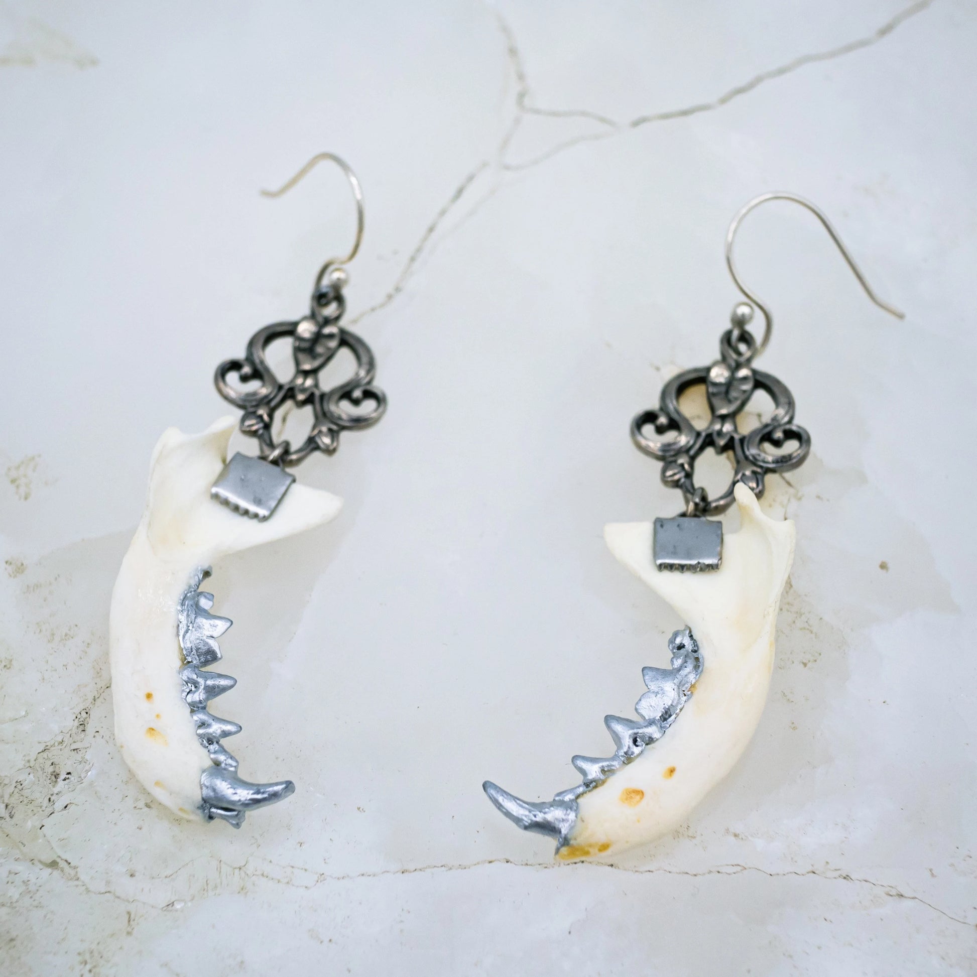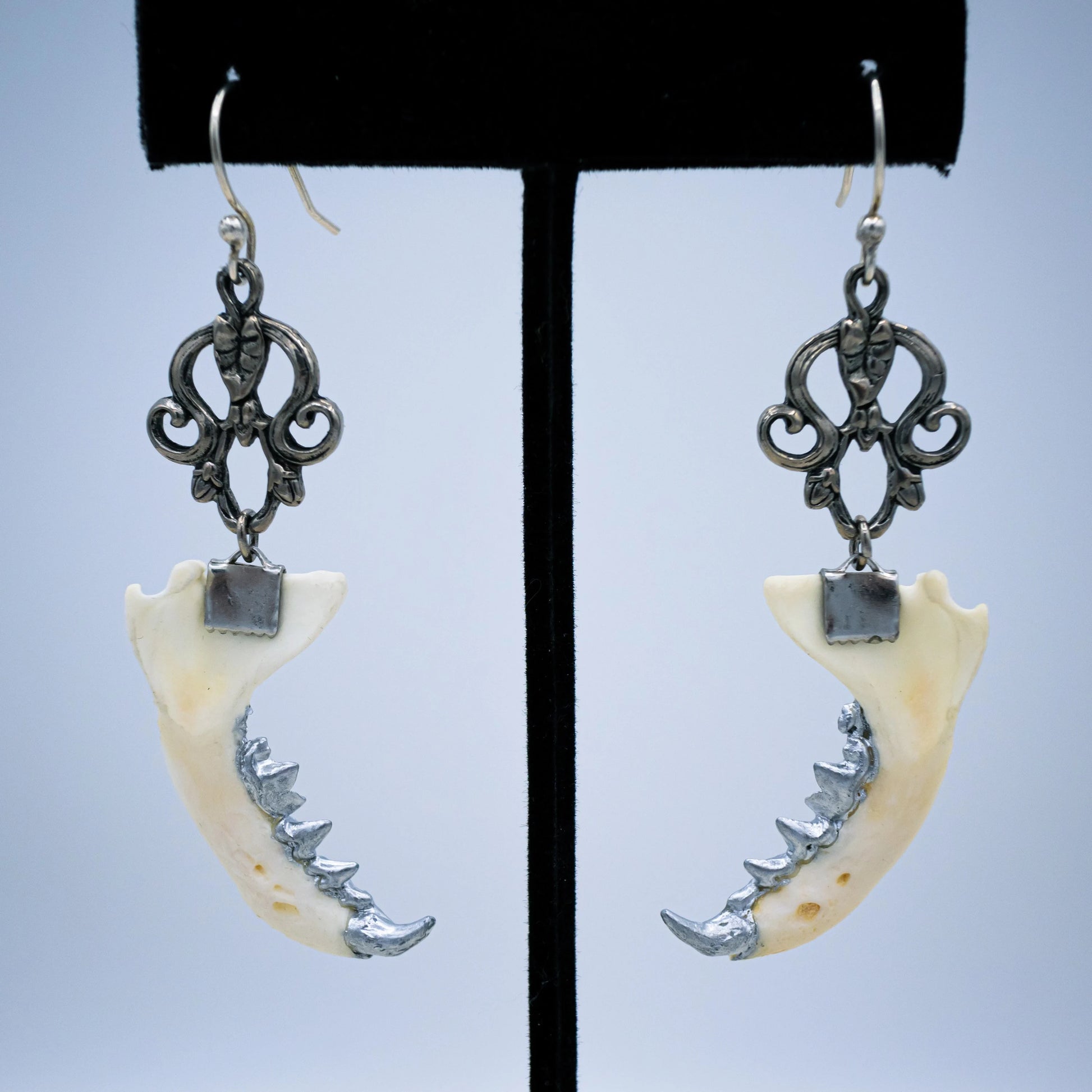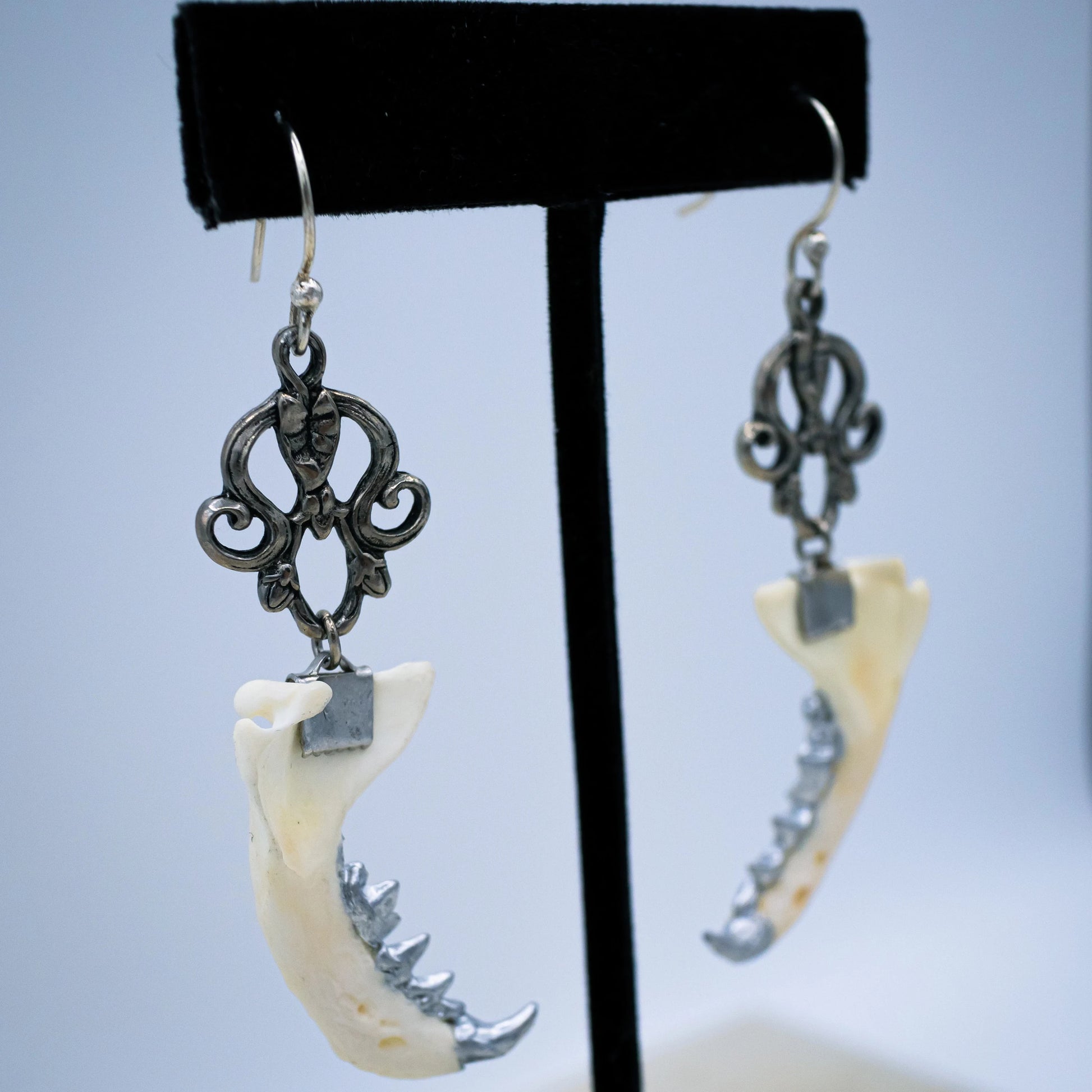 Authentic mink jaws with silver gilded teeth hang from ornate silver findings from matching earring hooks