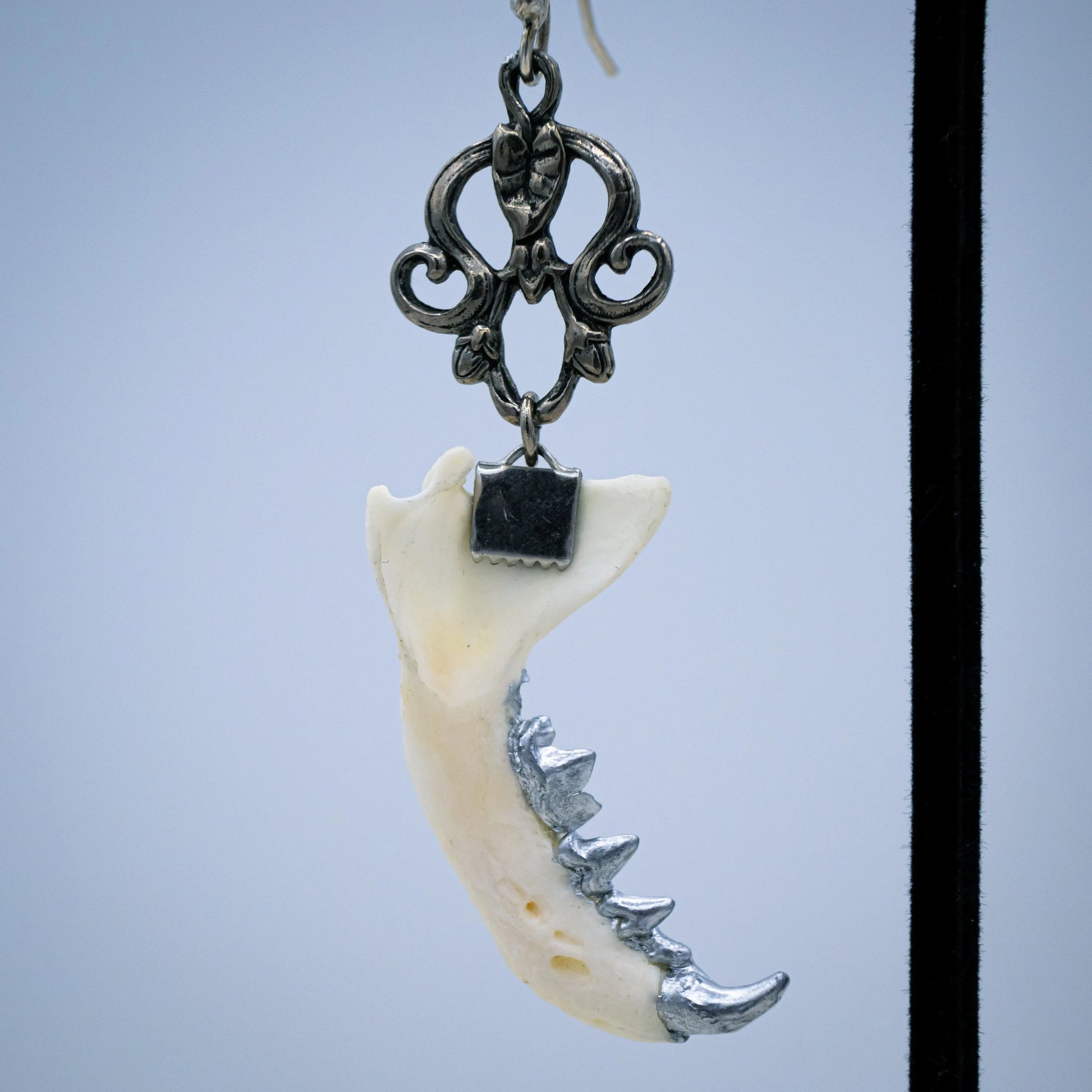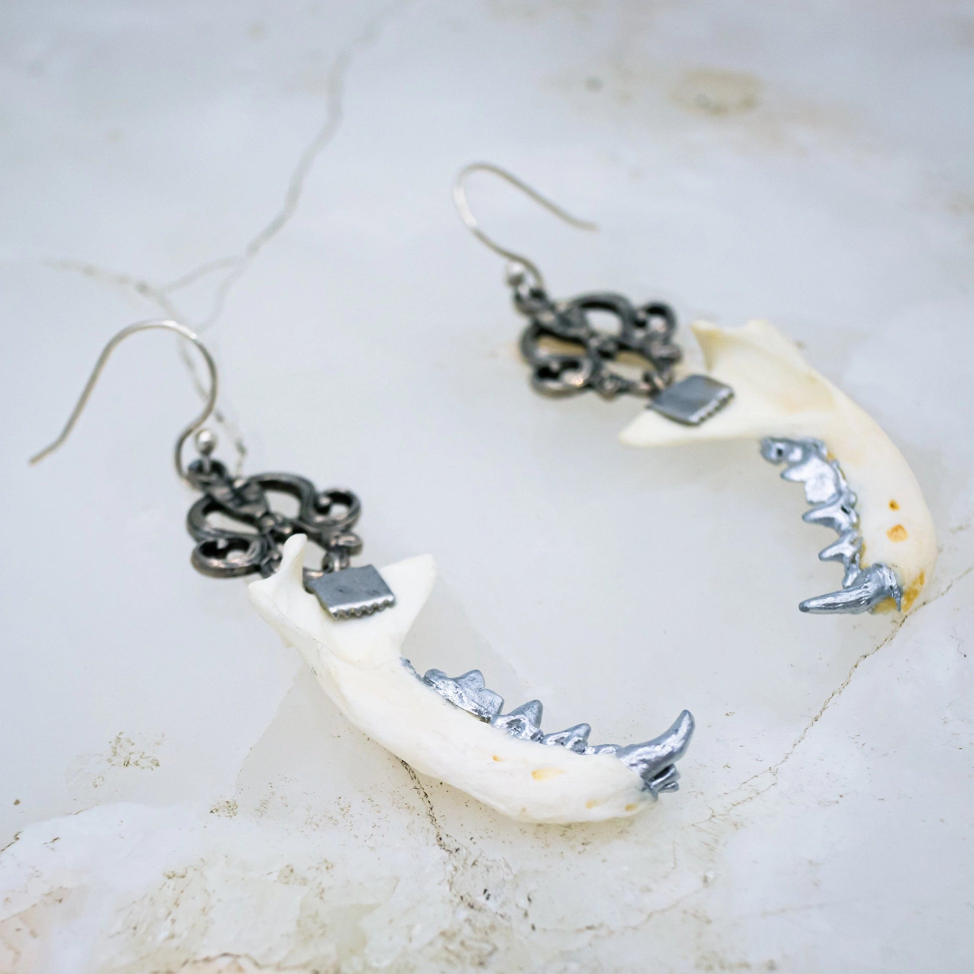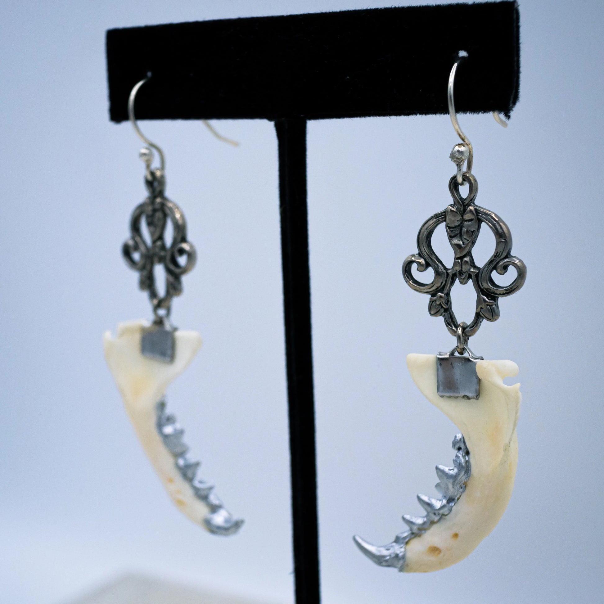 Authentic mink jaws with silver gilded teeth hang from ornate silver findings from matching earring hooks