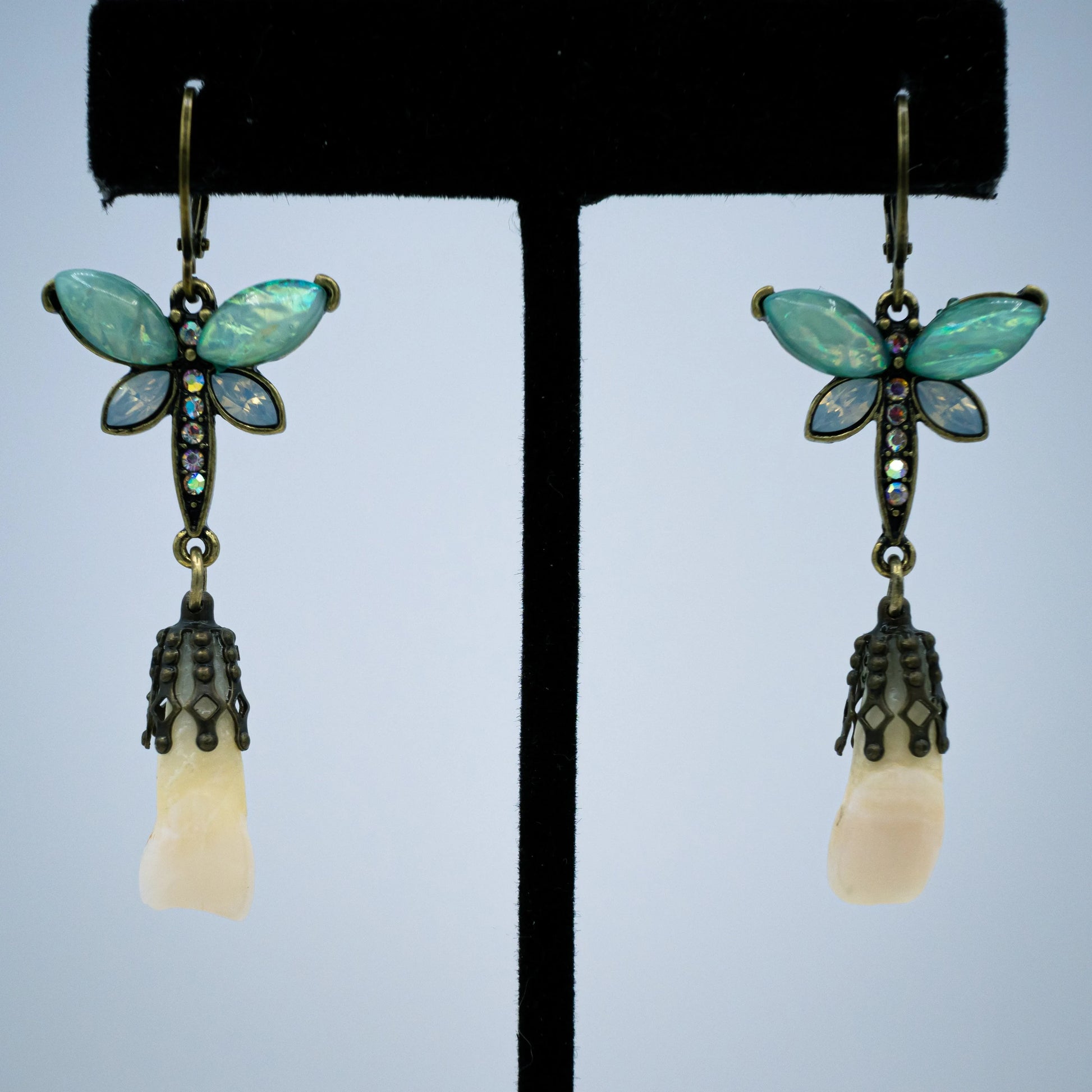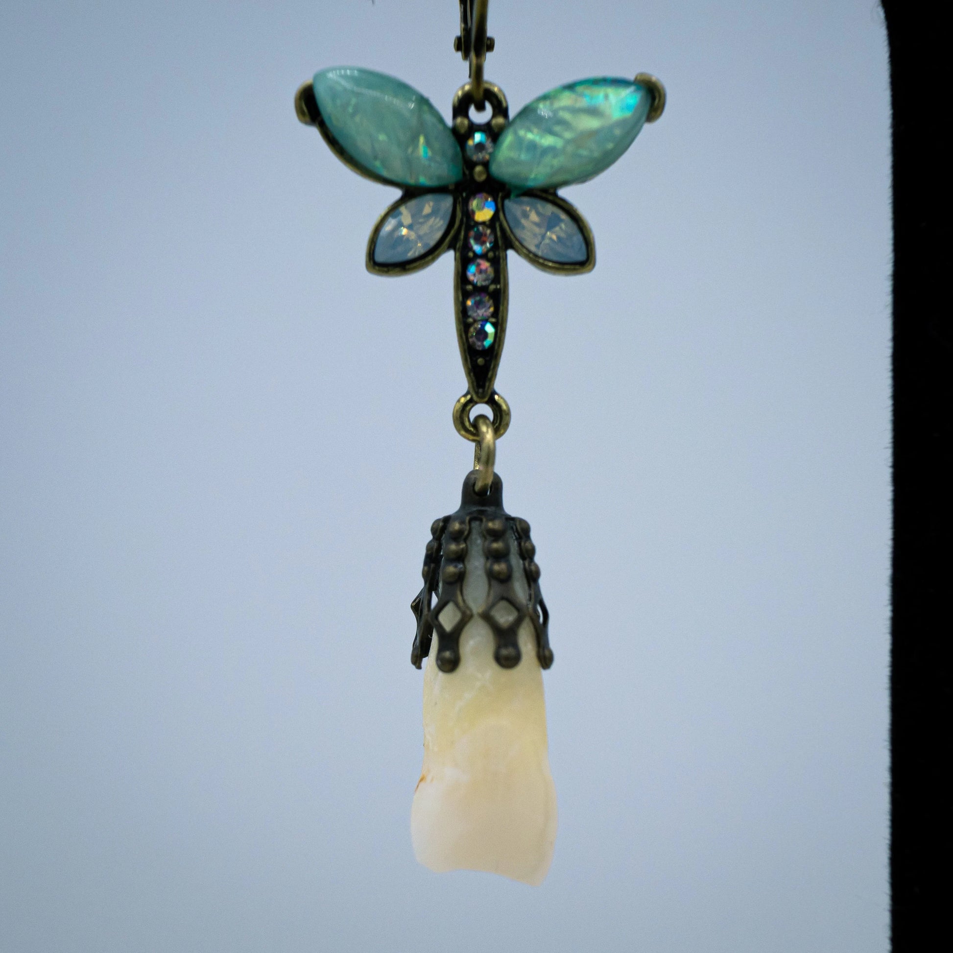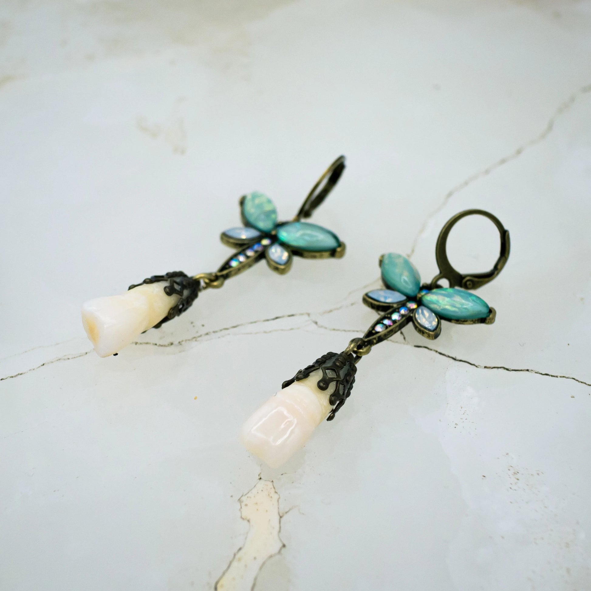 These unique earrings are made from authentic human central incisors (two front teeth) and are filigree capped to dangle from crystal decorated teal and blue butterfly earrings