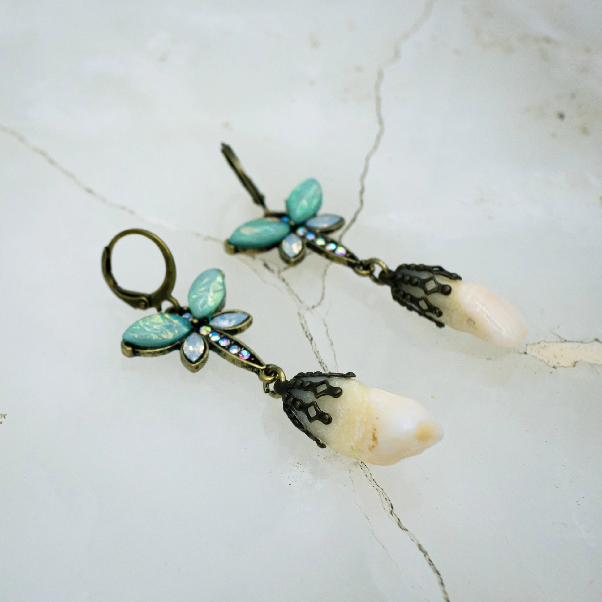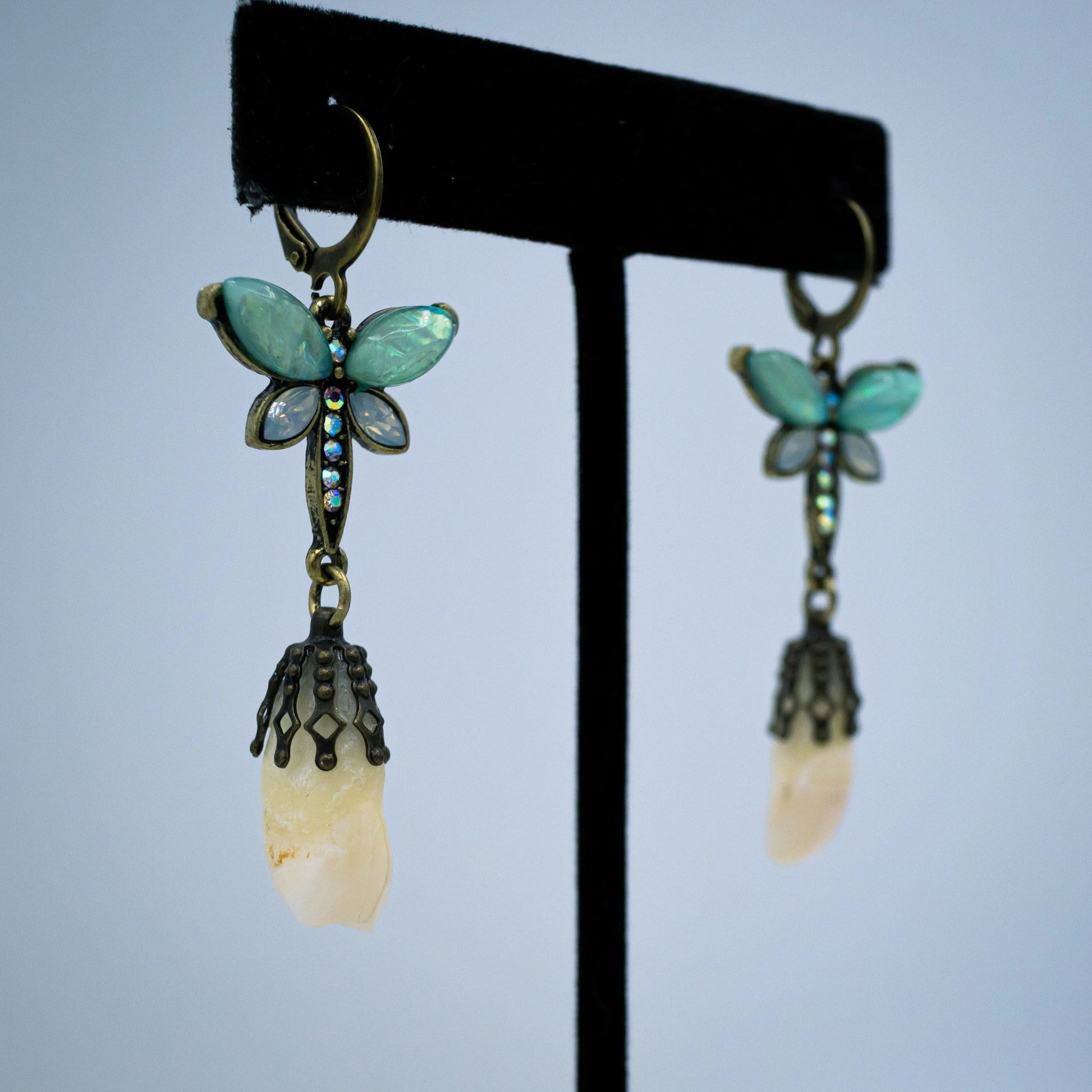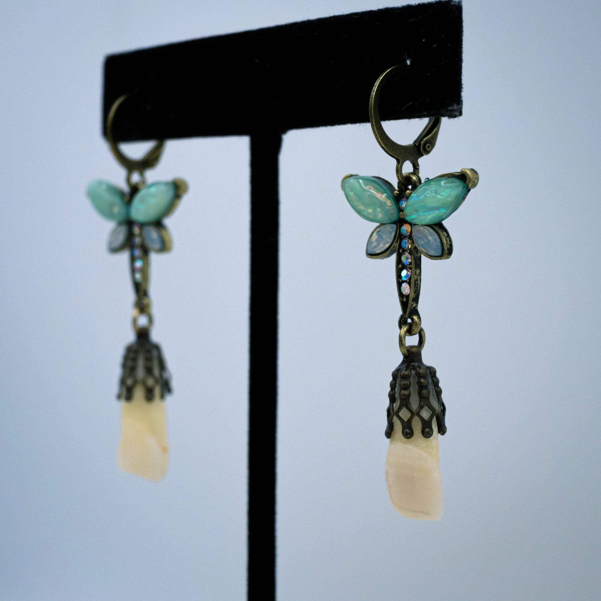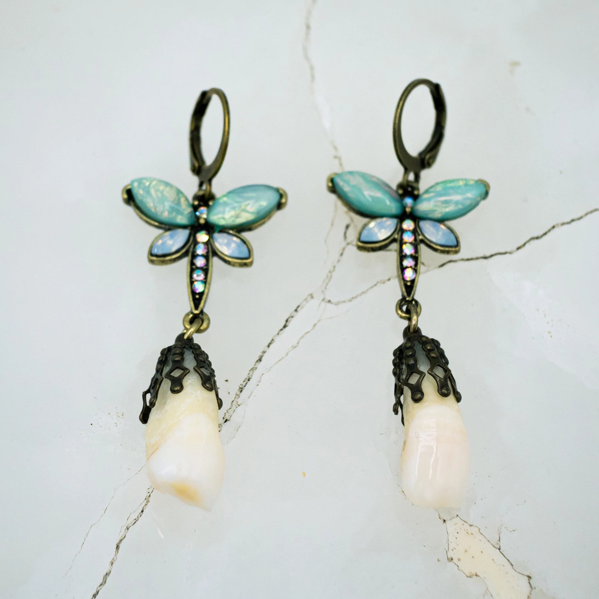 These unique earrings are made from authentic human central incisors (two front teeth) and are filigree capped to dangle from crystal decorated teal and blue butterfly earrings