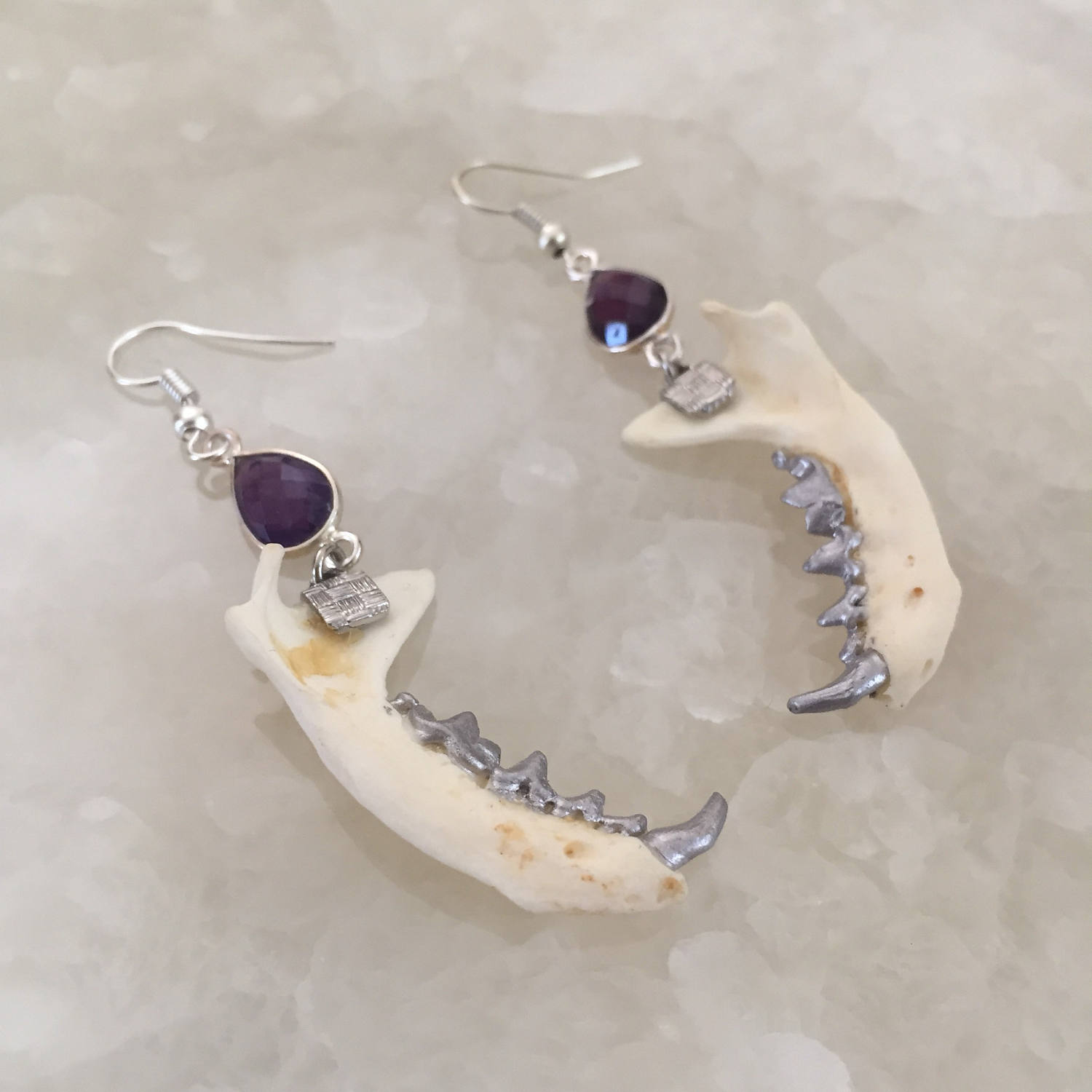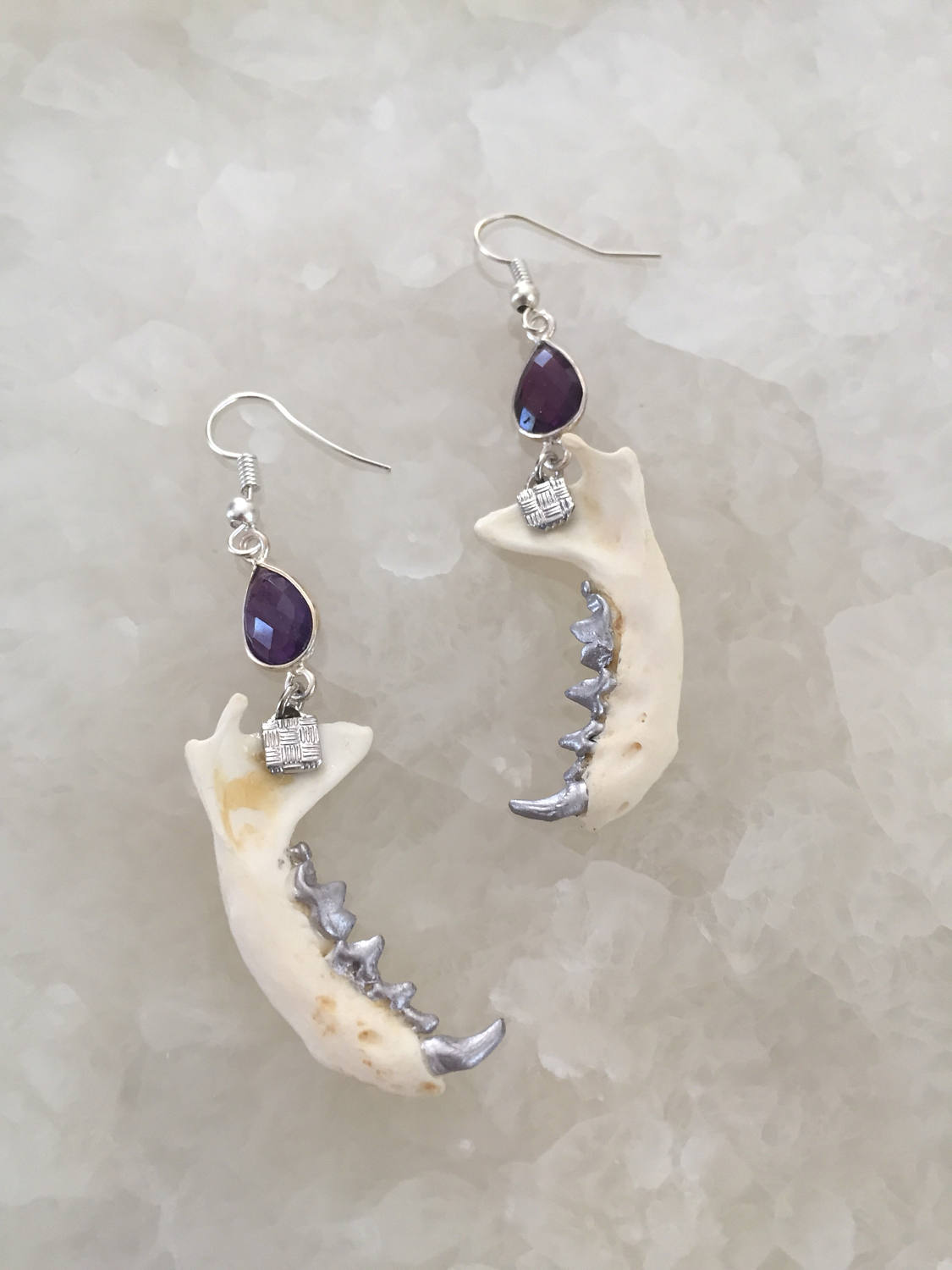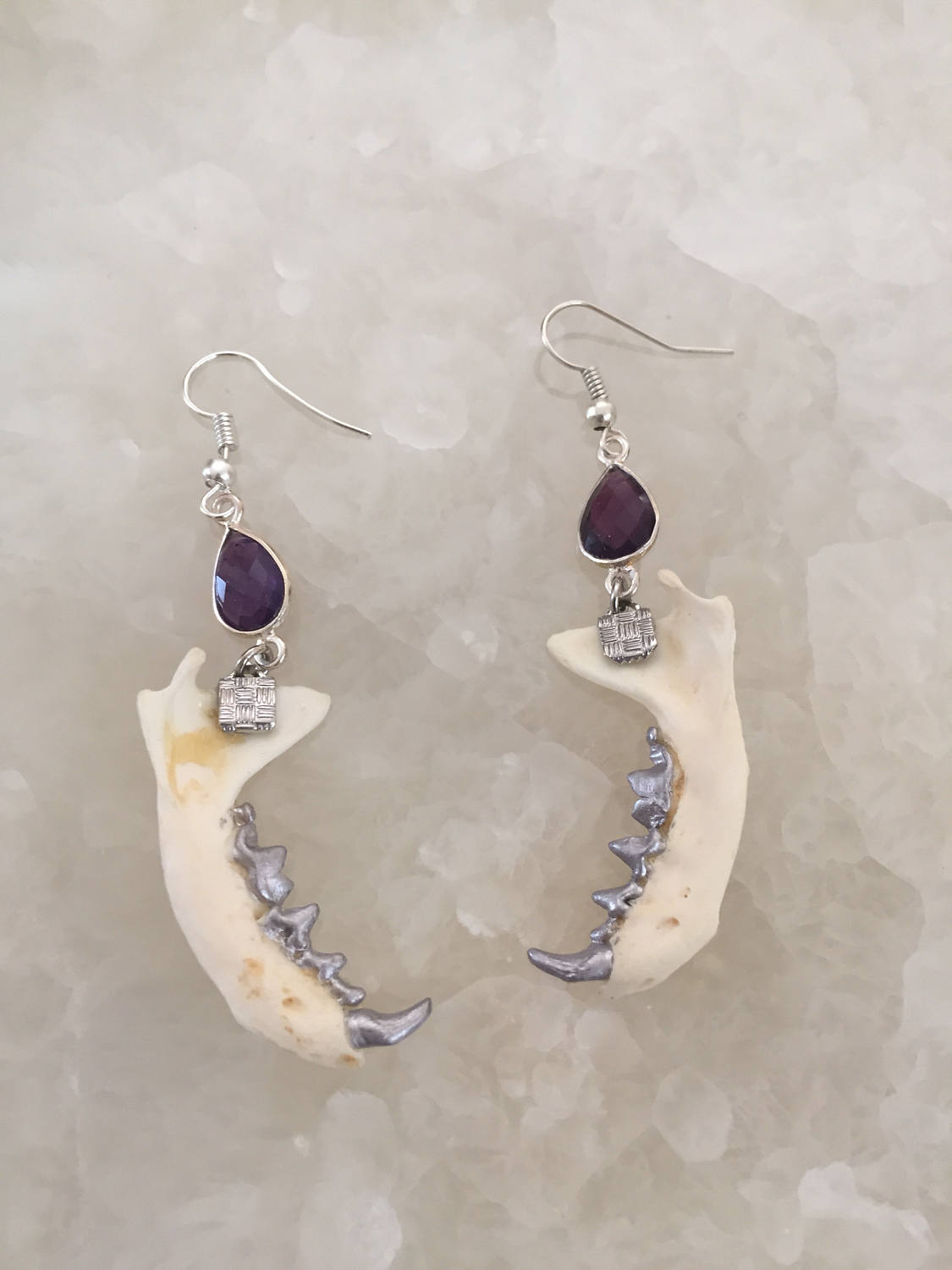 Authentic mink jaws with silver gilded teeth hang from gorgeous sterling silver set amethyst teardrops by earring hooks