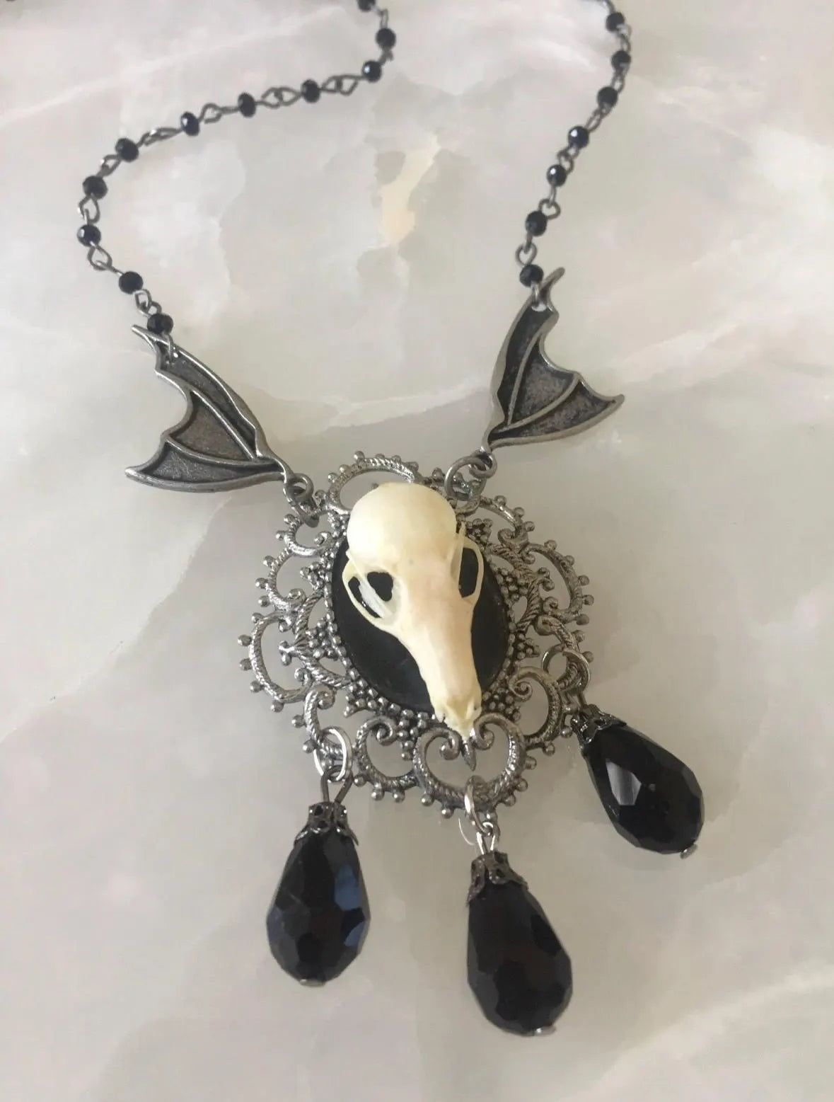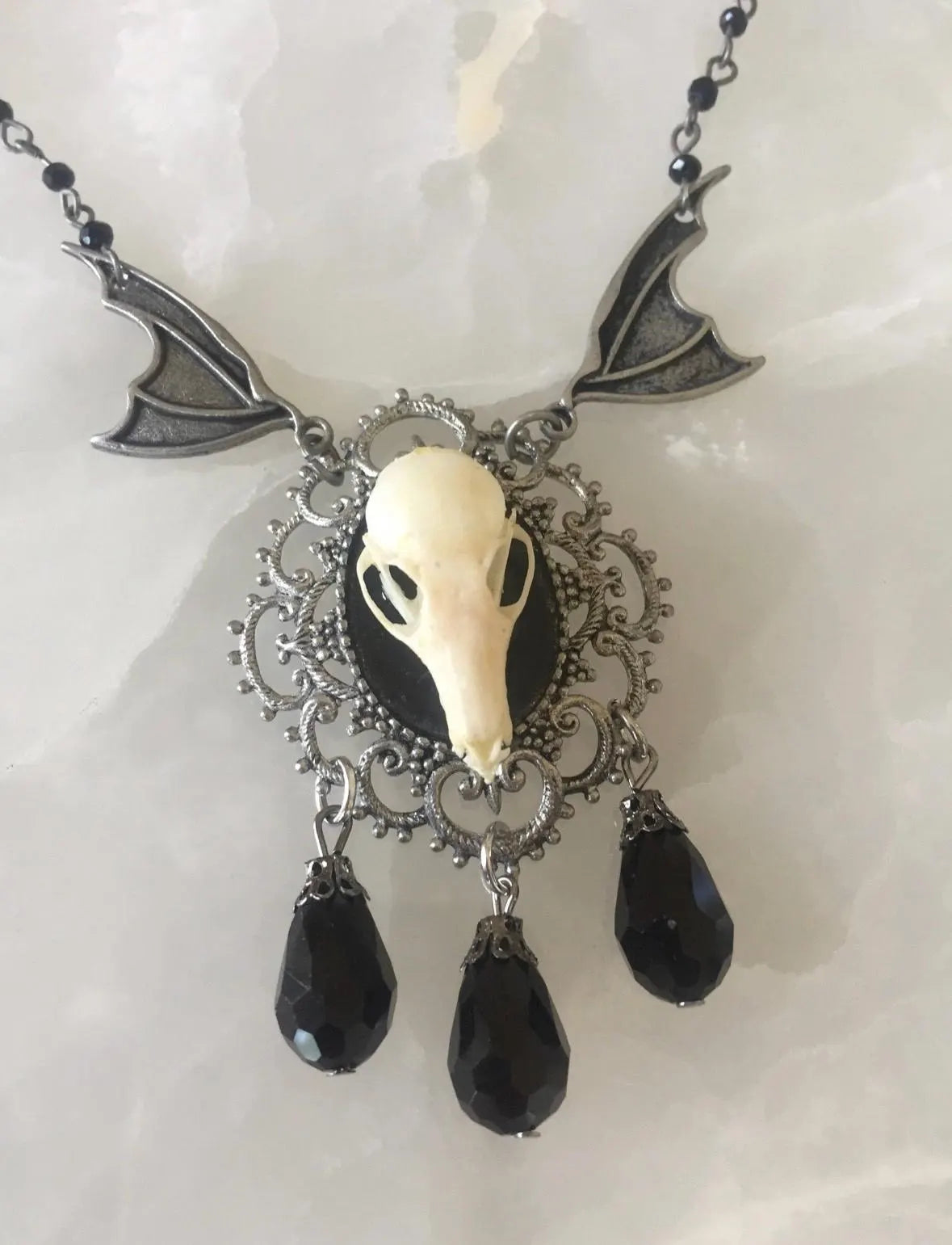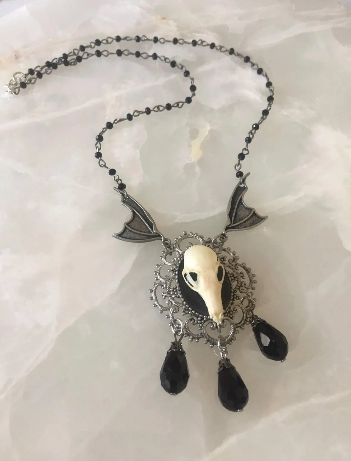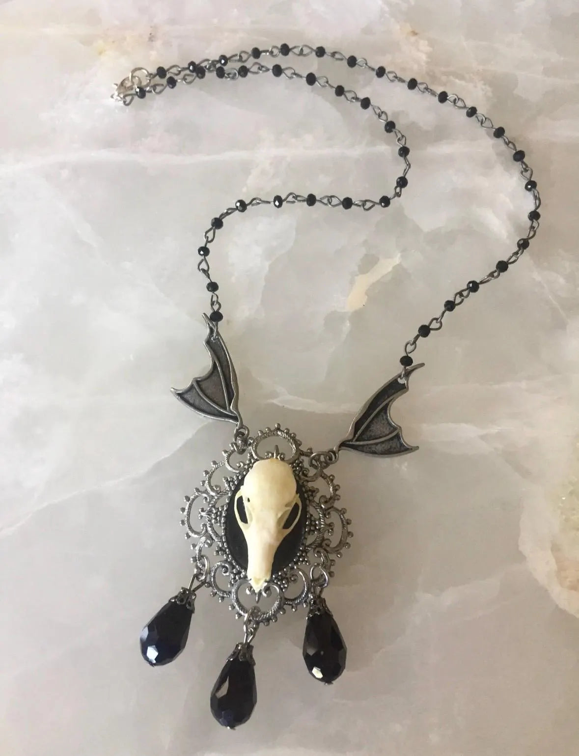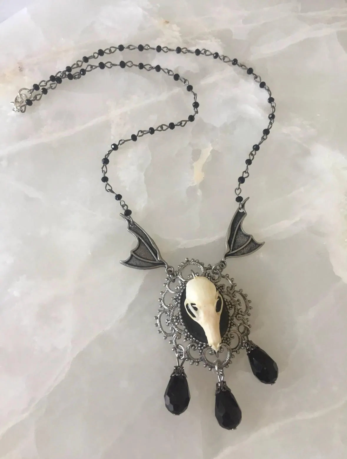 This black beaded chain necklace centers a bat skull that hangs from silver bat wings on a gorgeous silver setting that dangles black beads