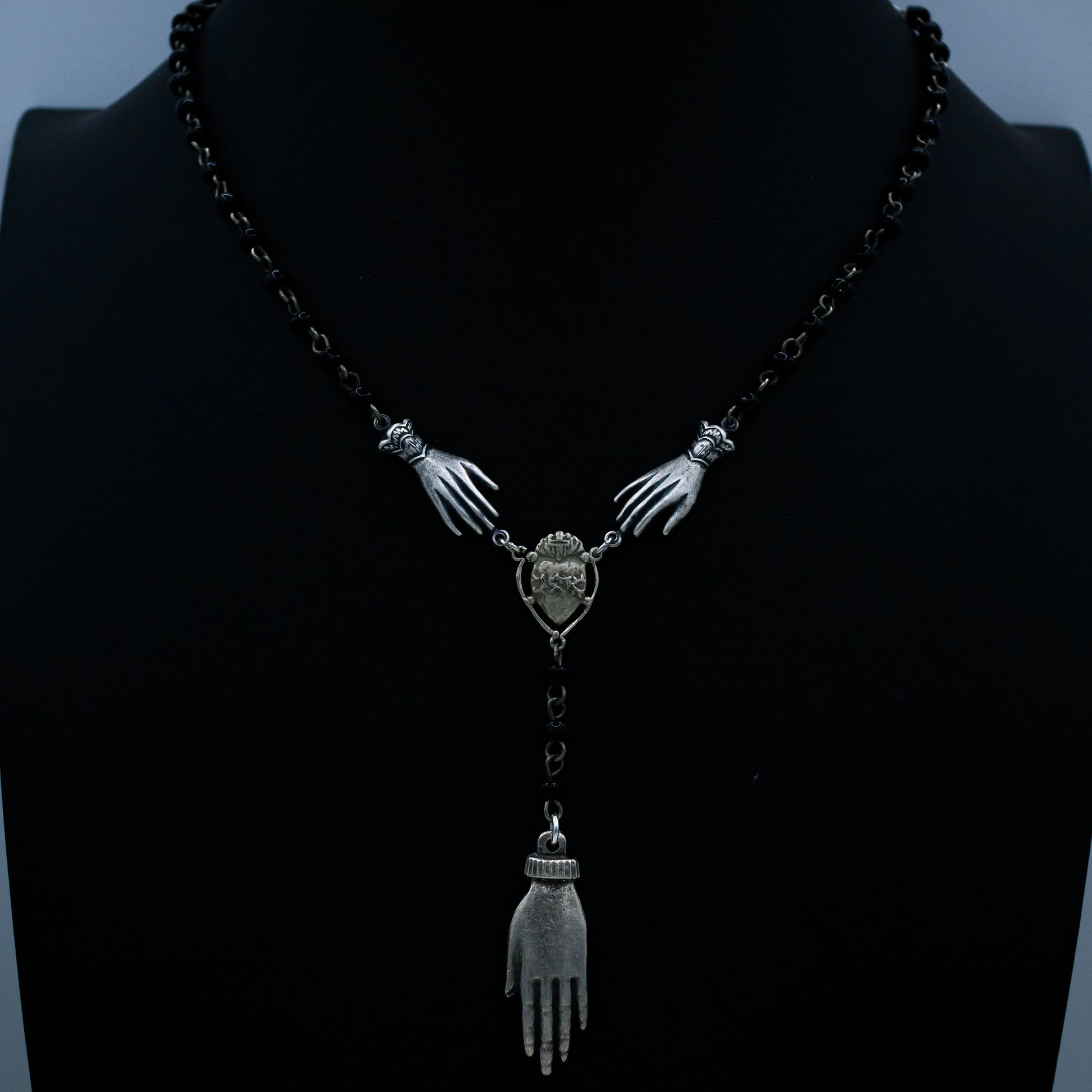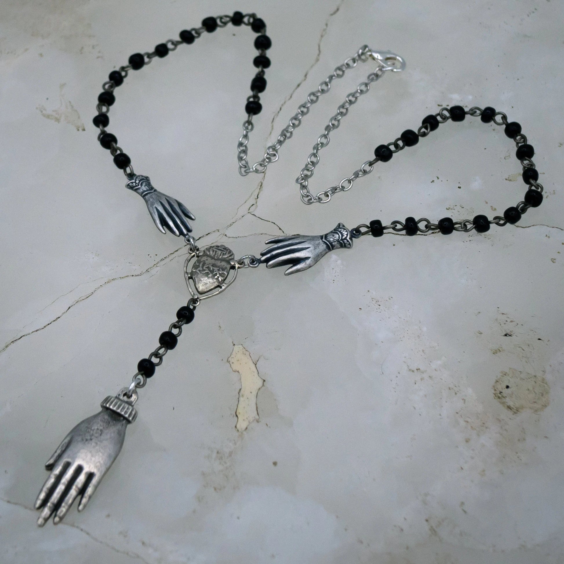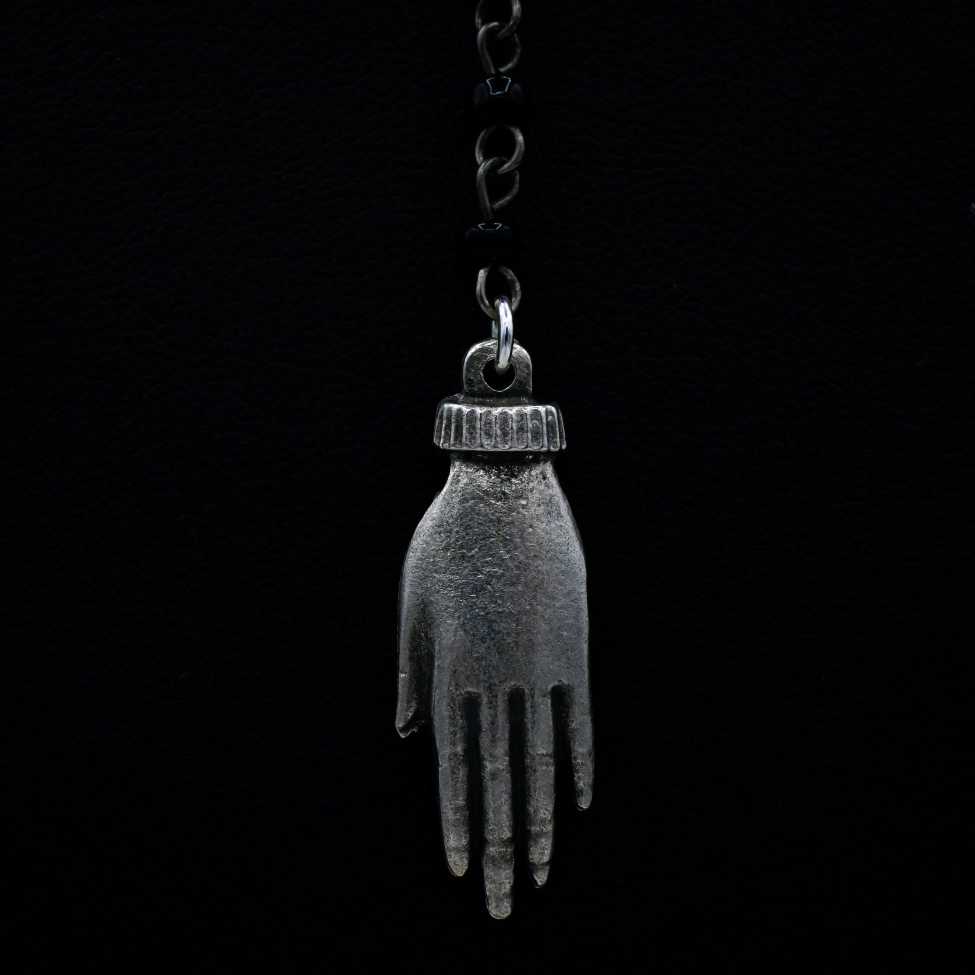 This Palm Readers Necklace hangs from beautiful jet black glass beads with an elaborate silver connector and the signature Palm Readers Palm.