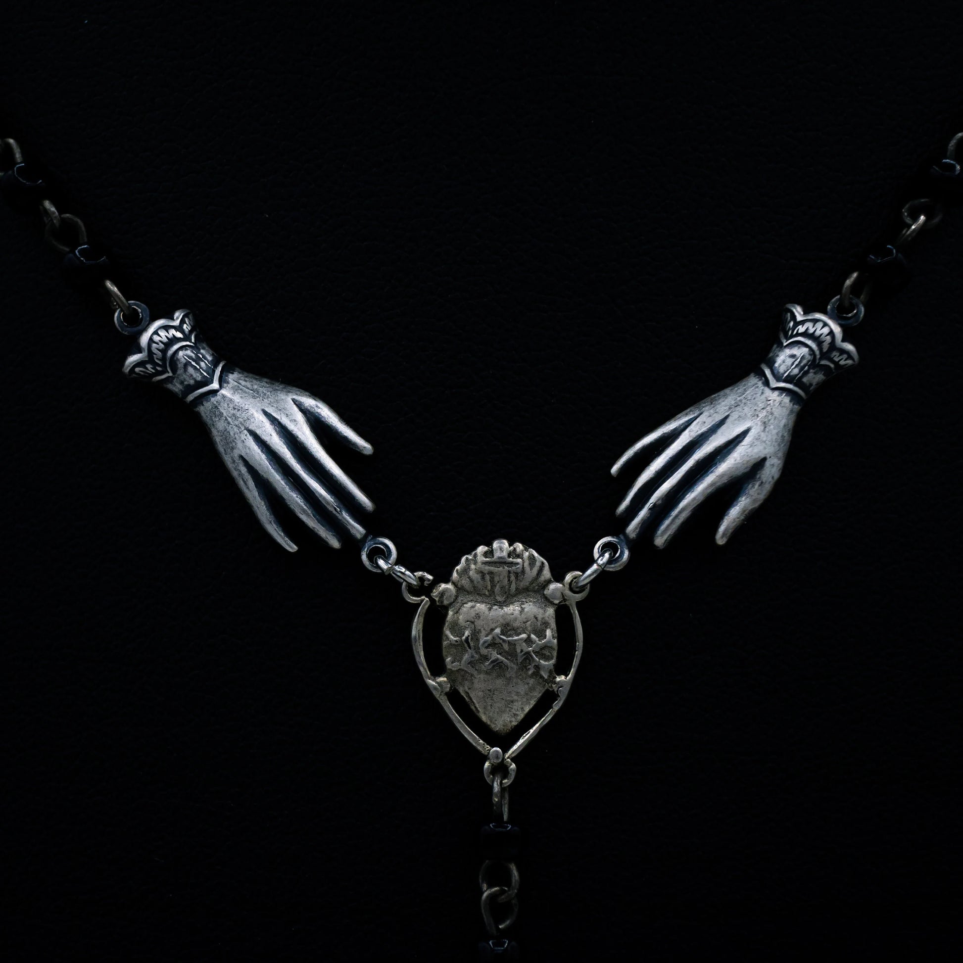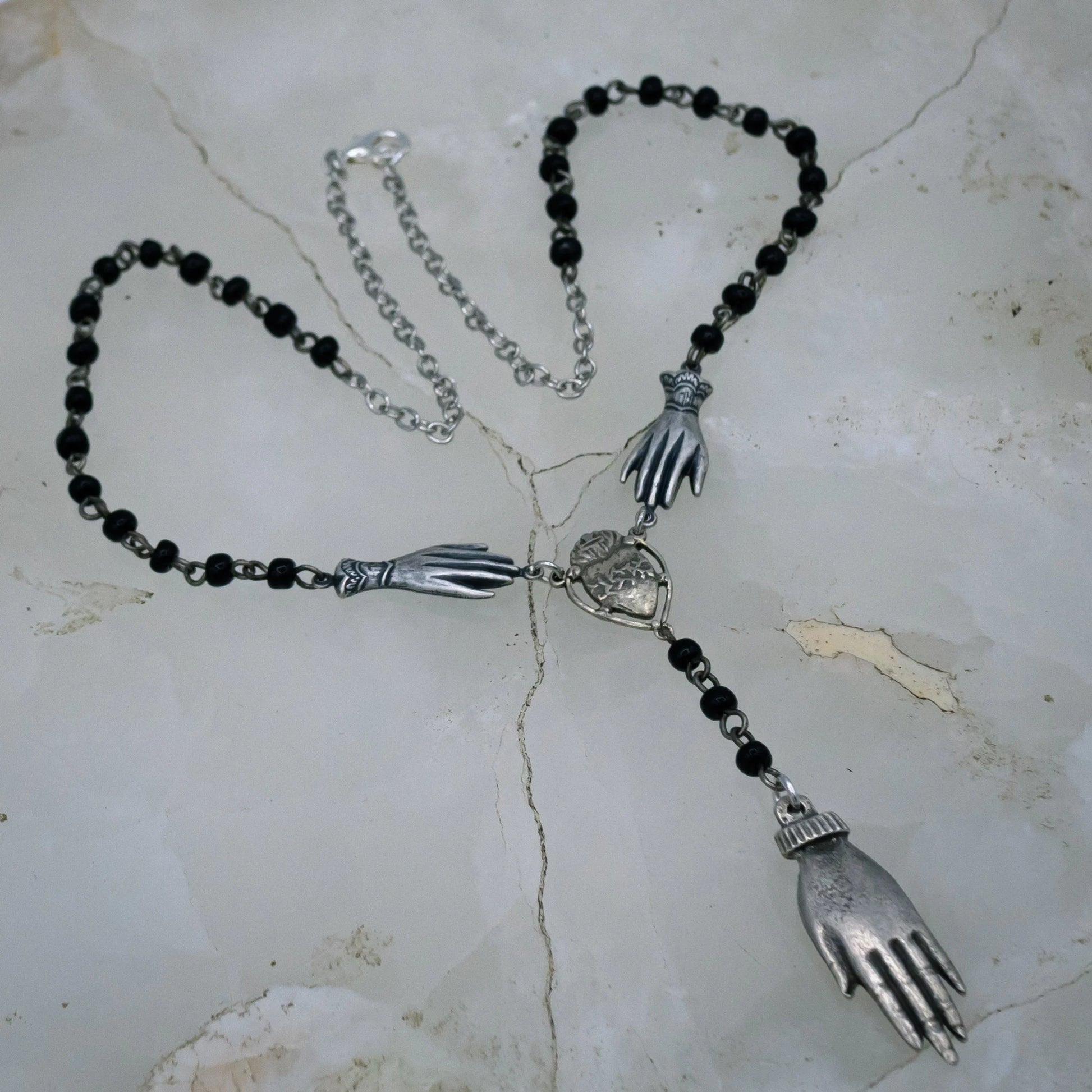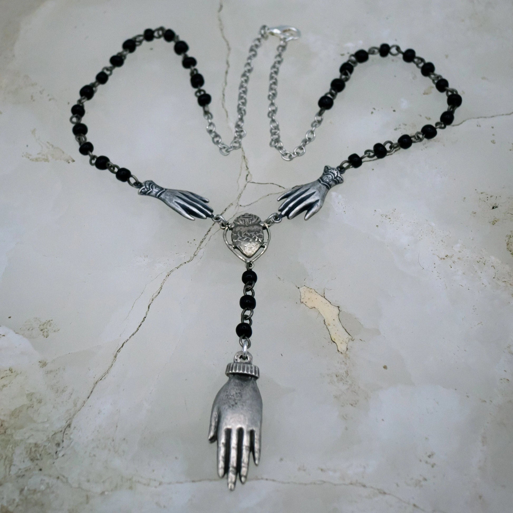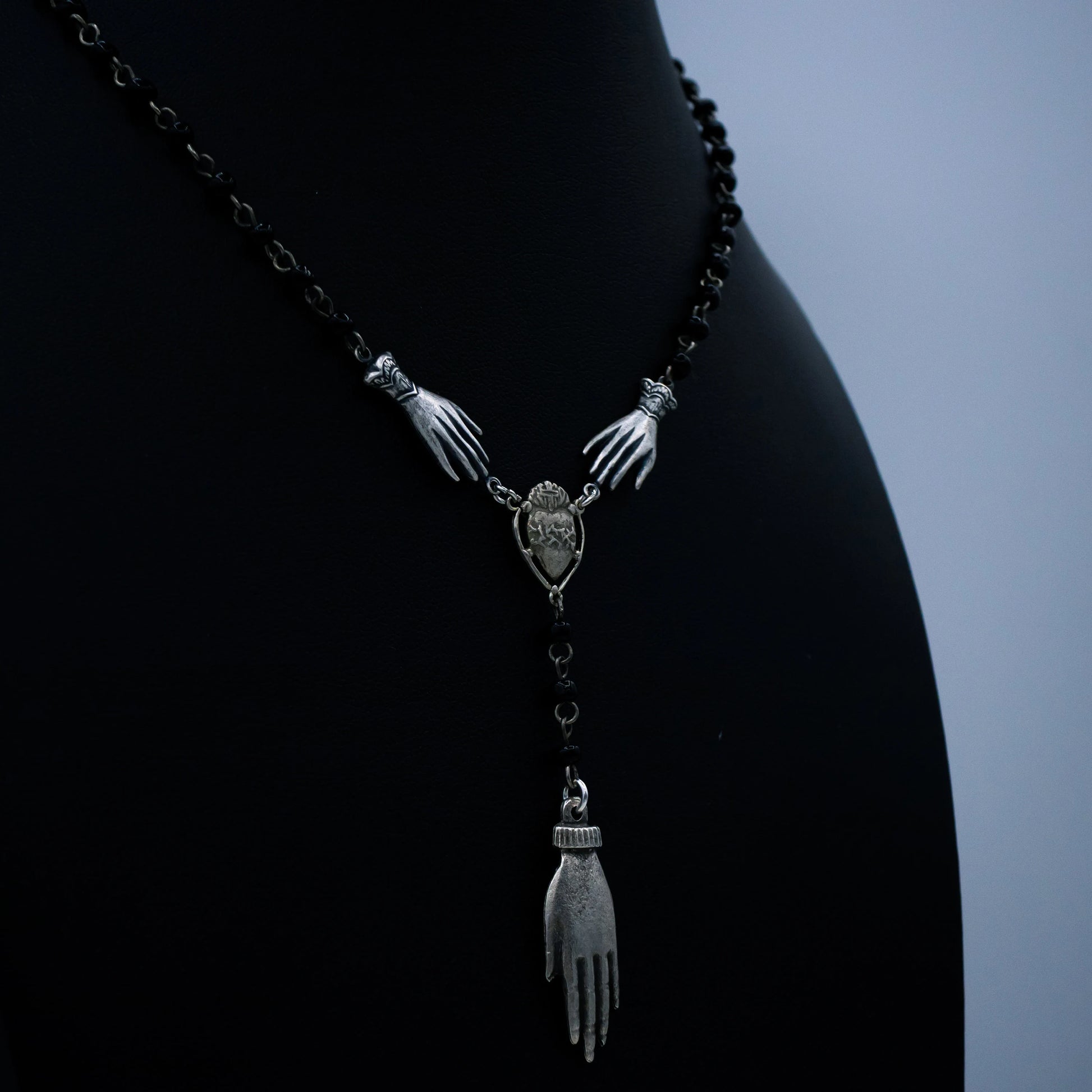 This Palm Readers Necklace hangs from beautiful jet black glass beads with an elaborate silver connector and the signature Palm Readers Palm.