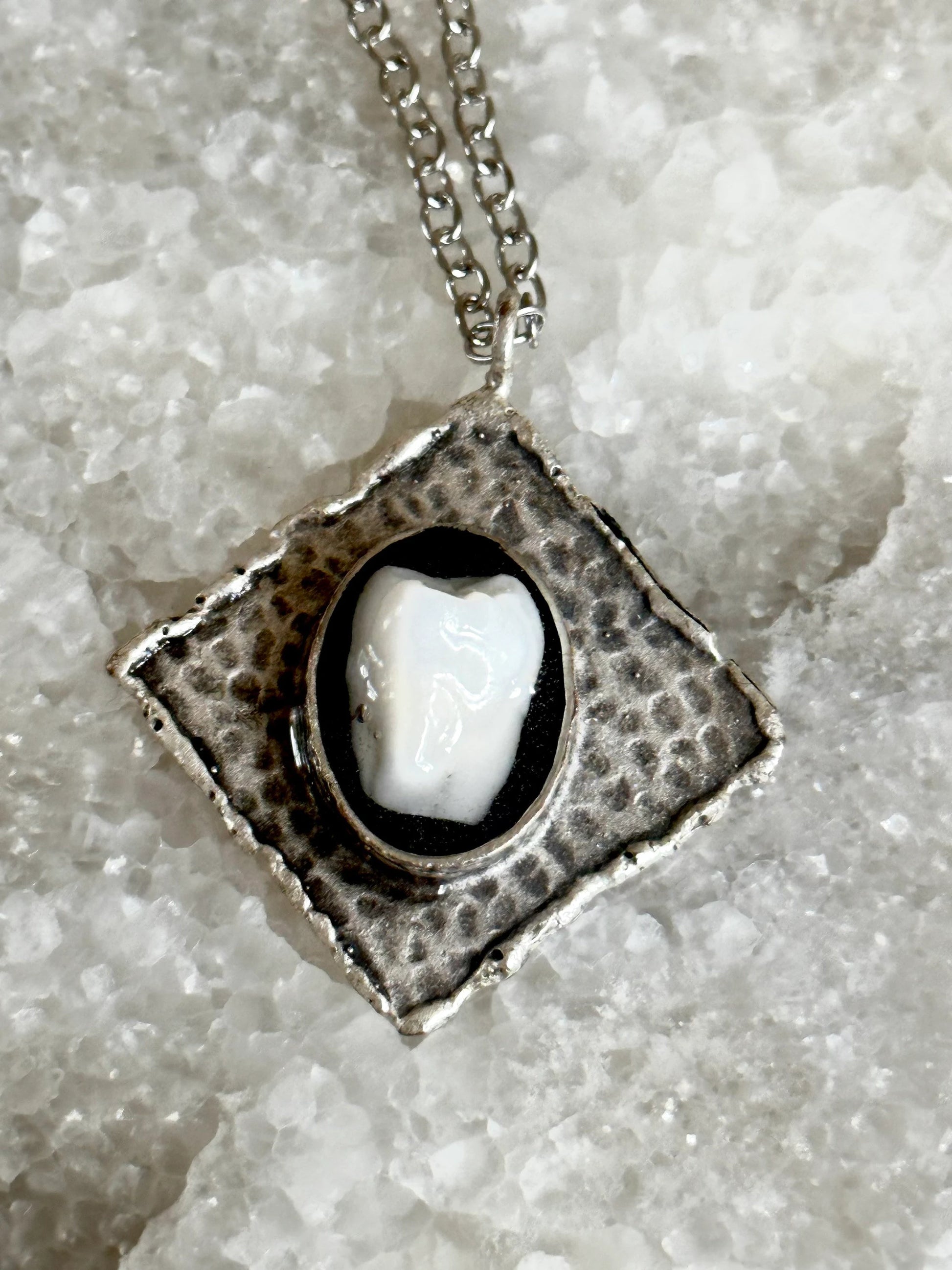 This unique necklace features a genuine human tooth that resin set to a unique sterling silver pendant and hangs from an 17inch silver chain