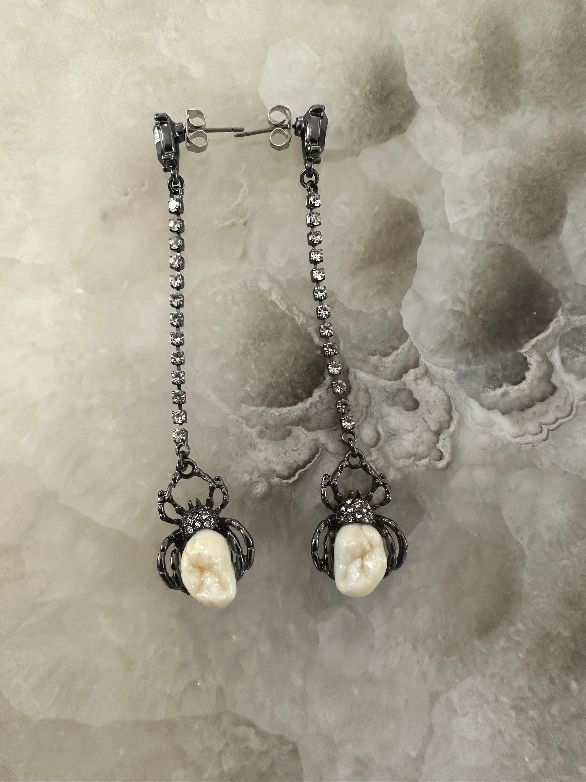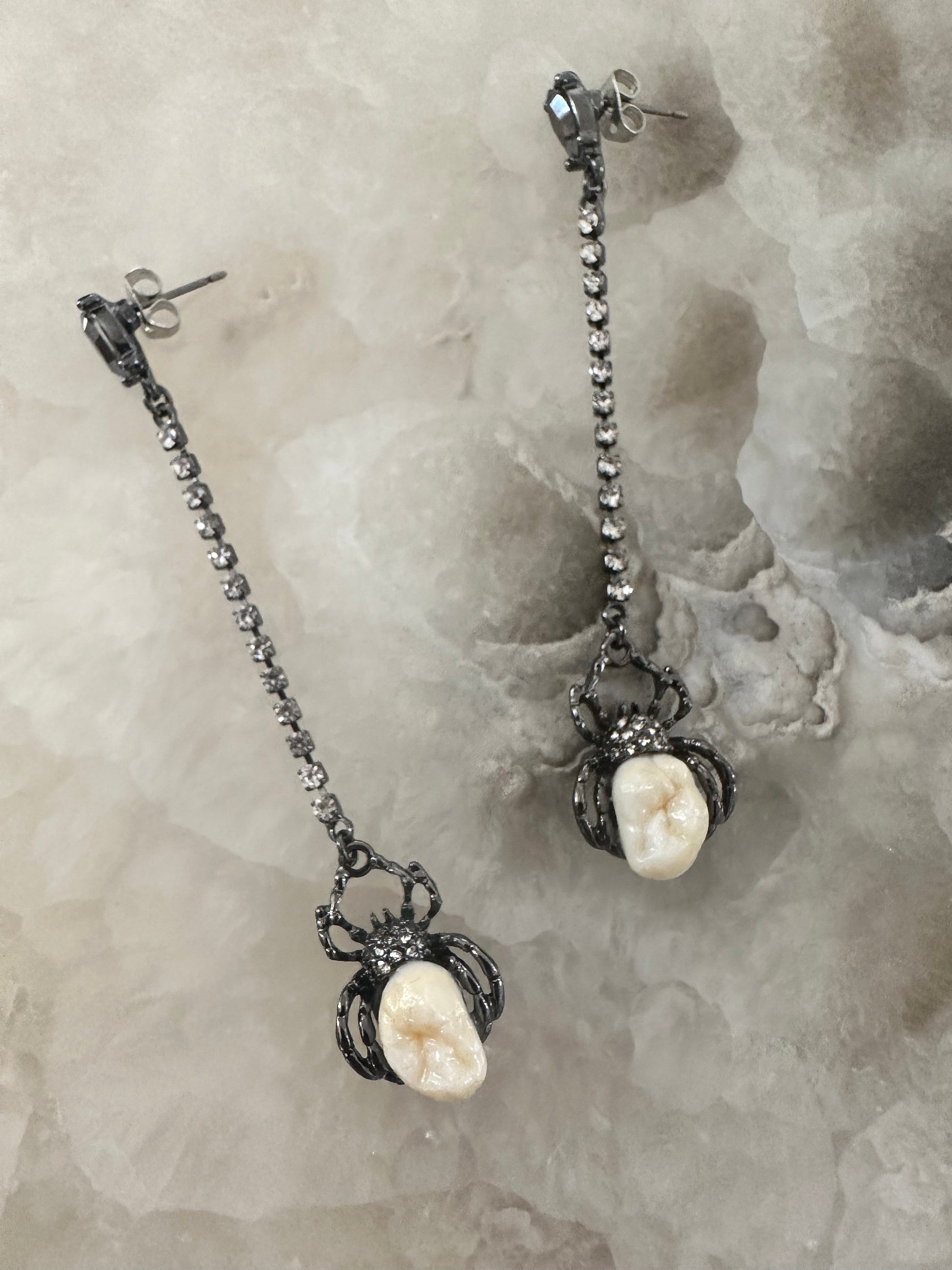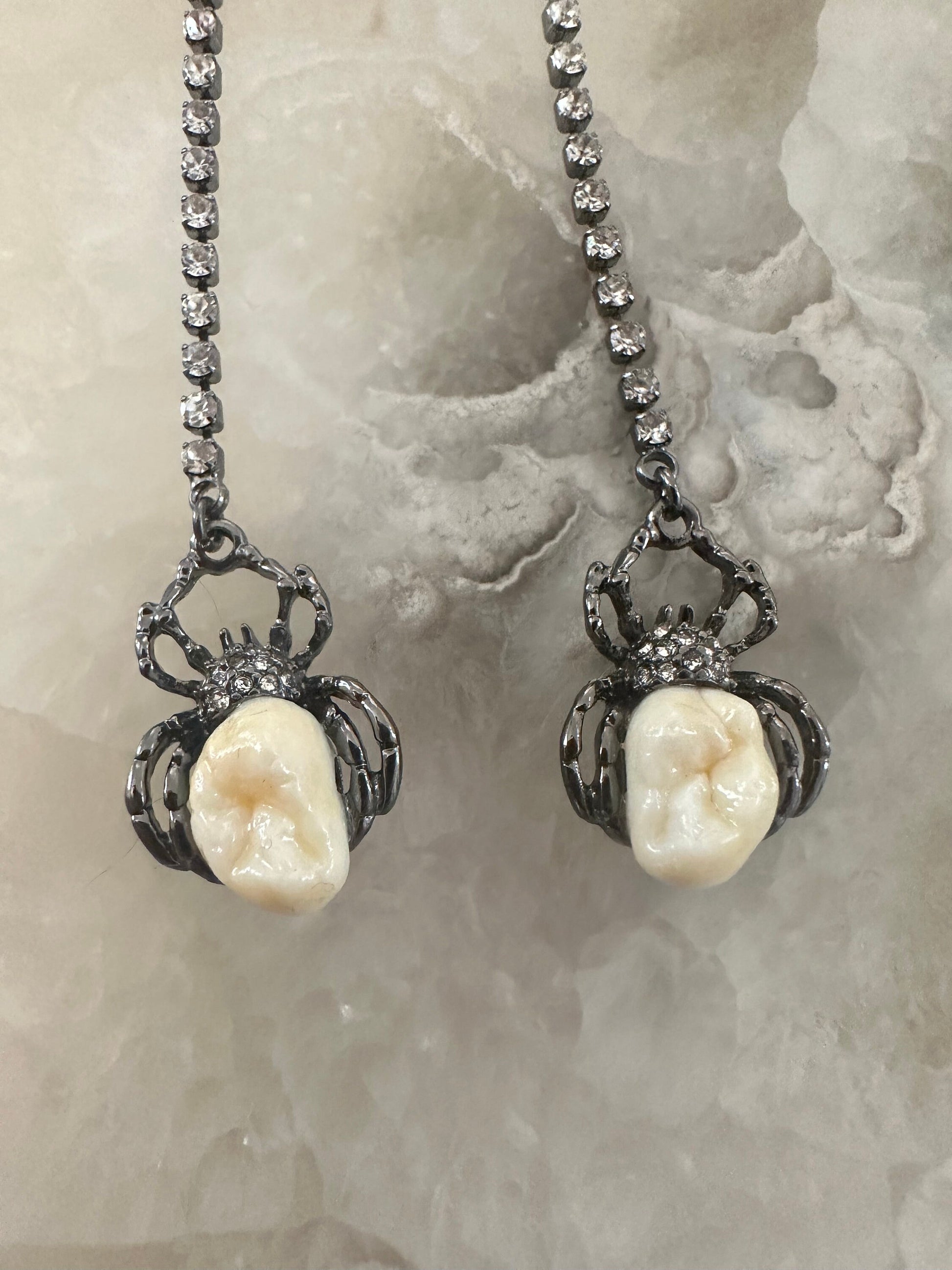 These creepy cute earrings are little black spiders with genuine human teeth in their center coated in resin for durability and shine they dangle from a crystal chain by matching crystal earring studs