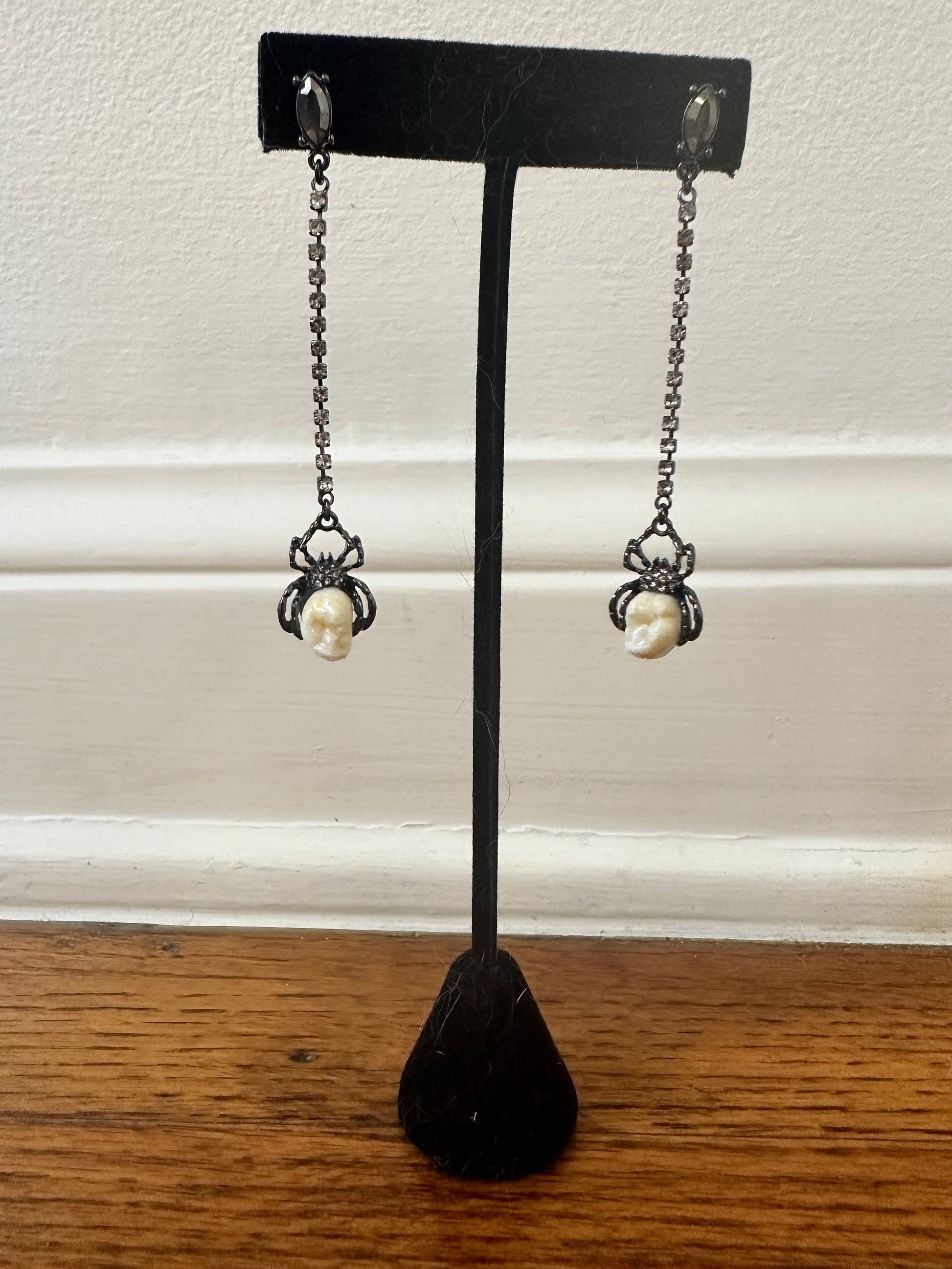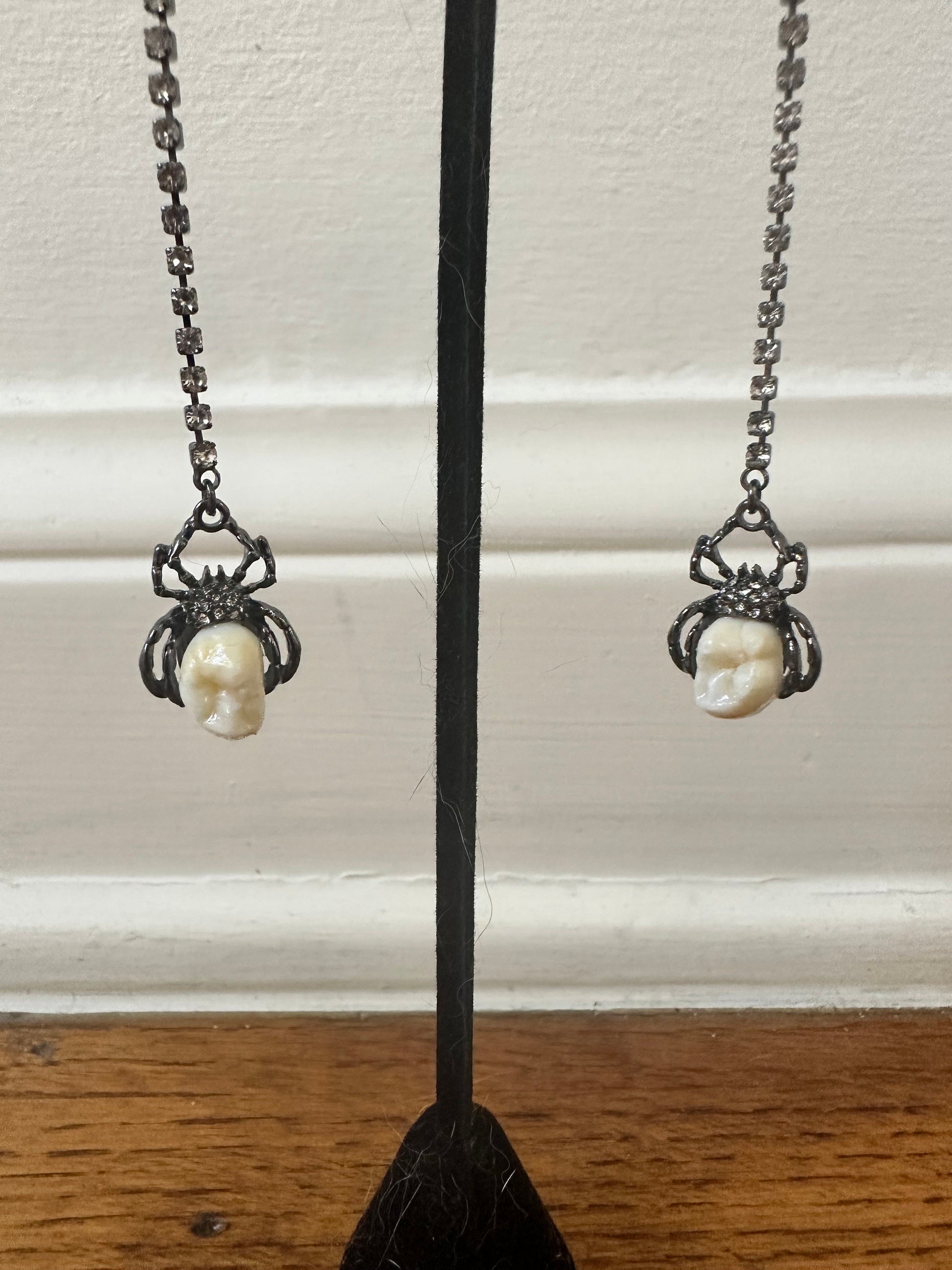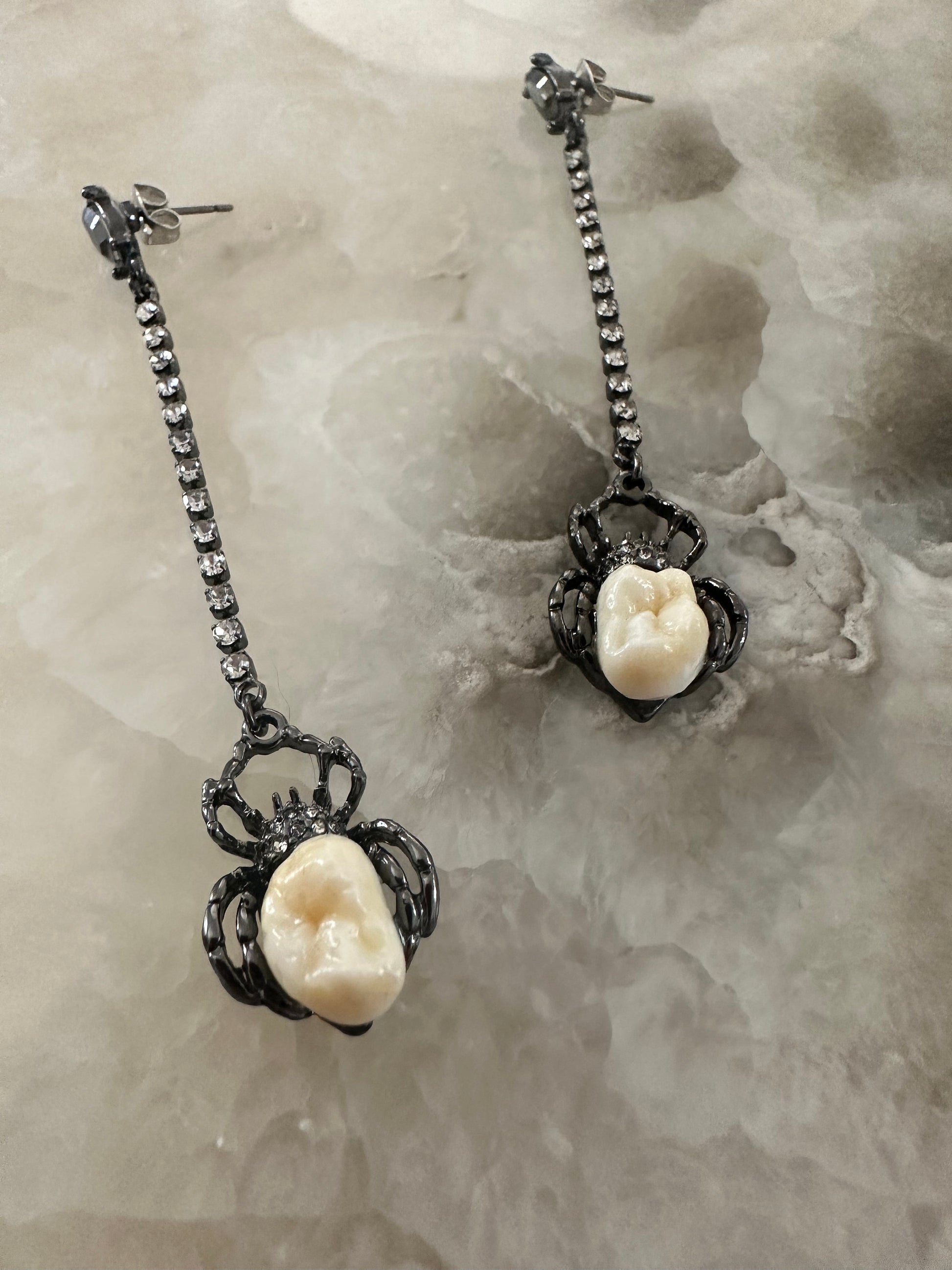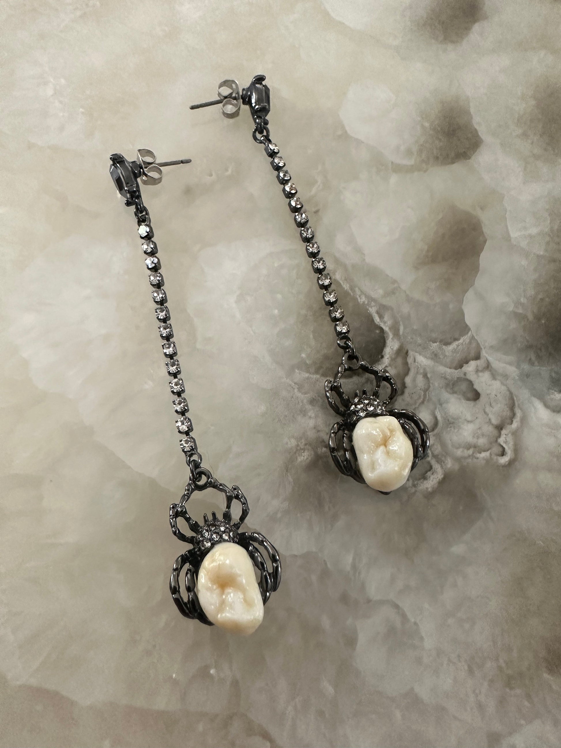 These creepy cute earrings are little black spiders with genuine human teeth in their center coated in resin for durability and shine they dangle from a crystal chain by matching crystal earring studs