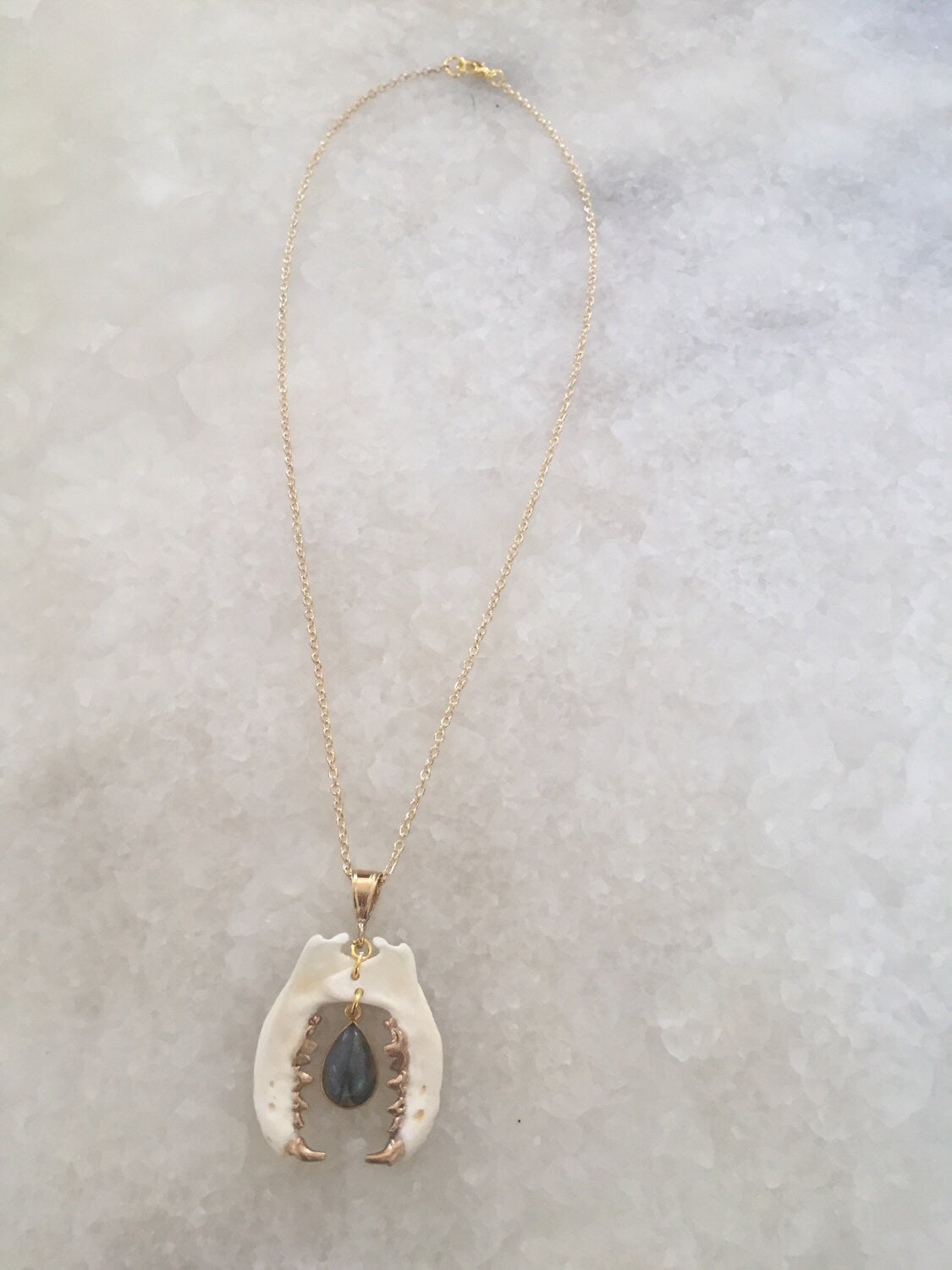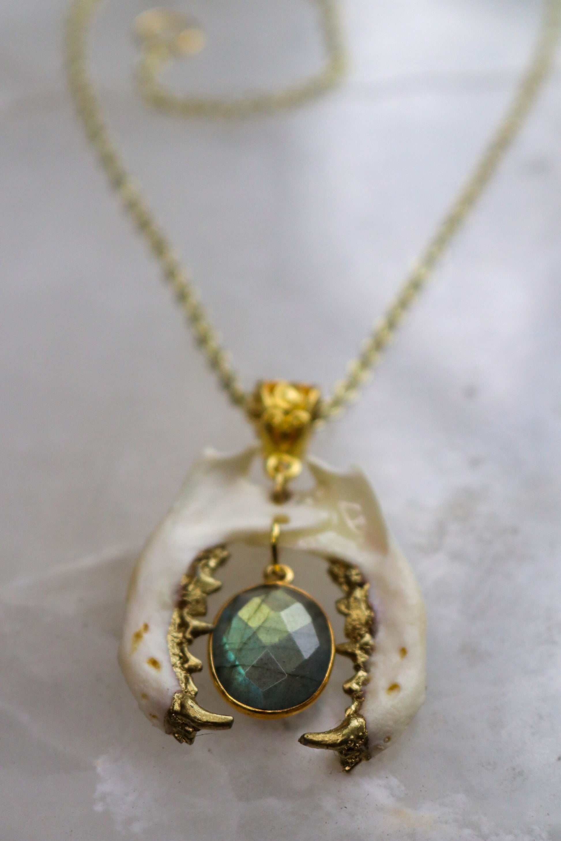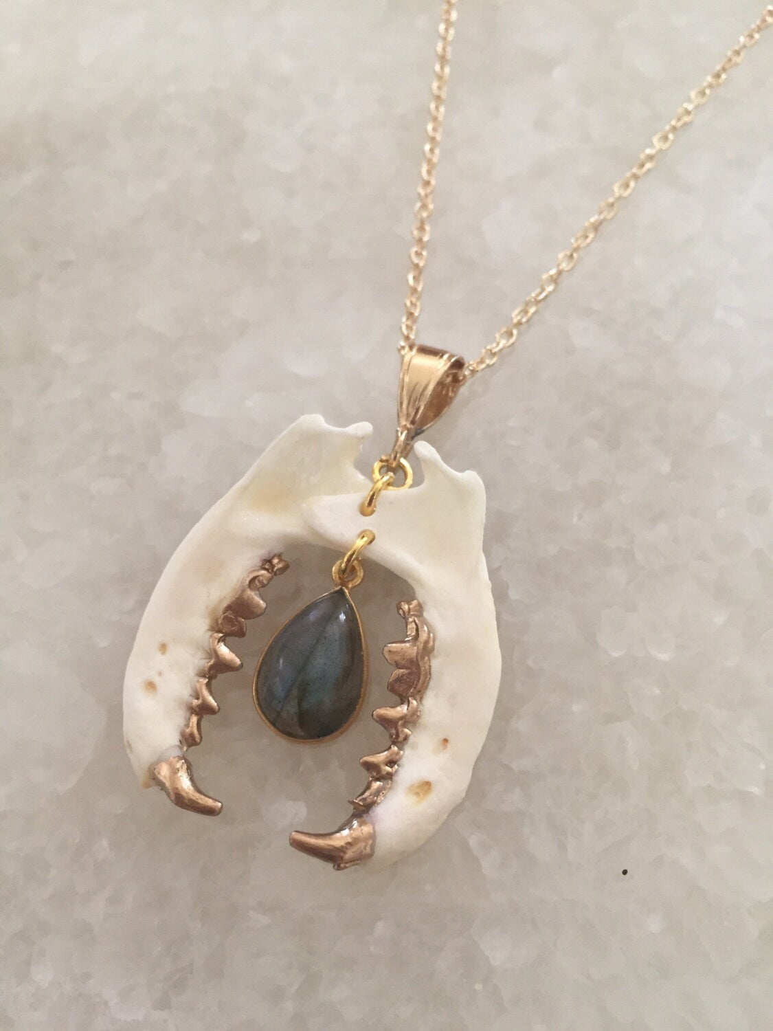 Authentic mink jaws with gold gilded teeth are coated with resin for durability and shine that hang from a golden chain and dangle a labradorite teardrop in their jaws