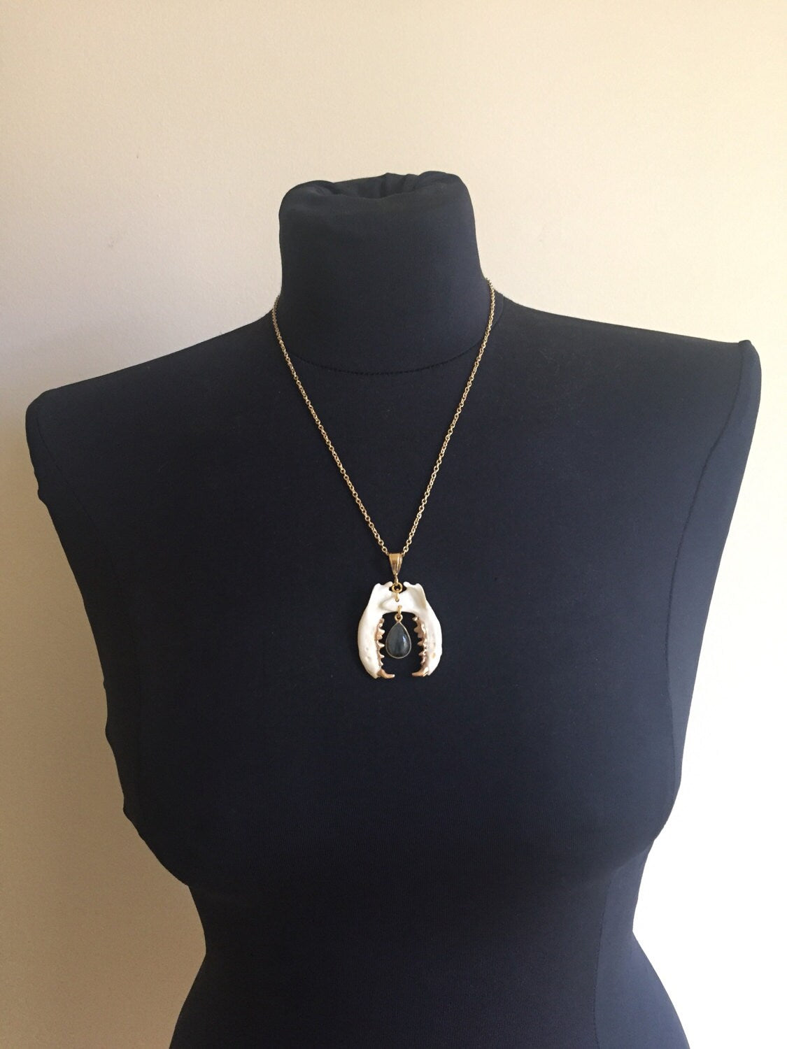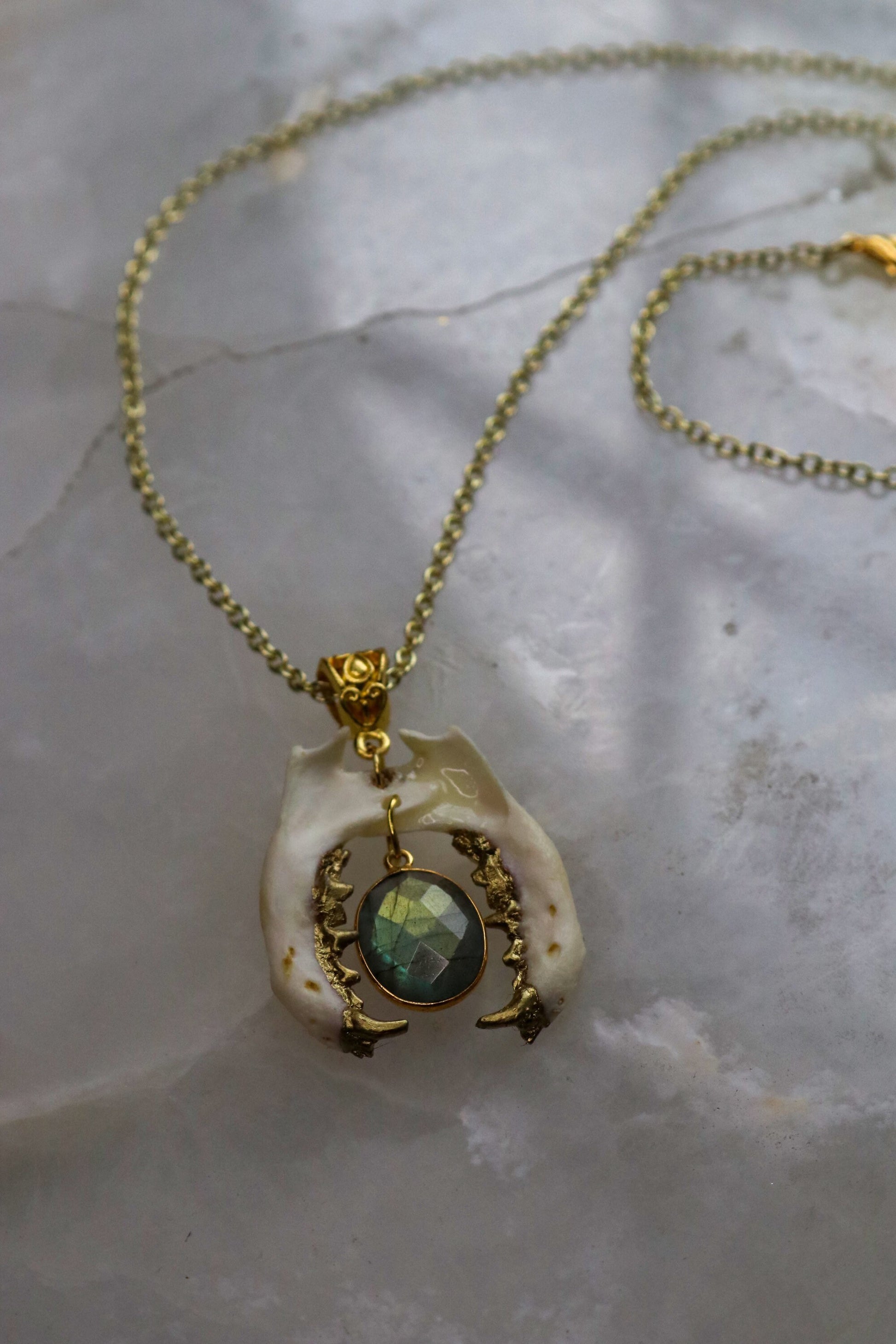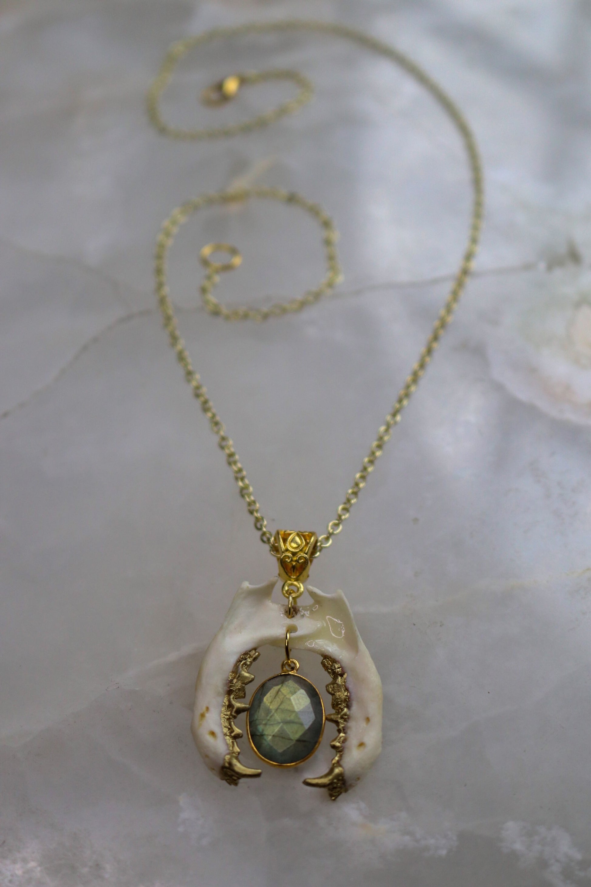 Authentic mink jaws with gold gilded teeth are coated with resin for durability and shine that hang from a golden chain and dangle a labradorite teardrop in their jaws