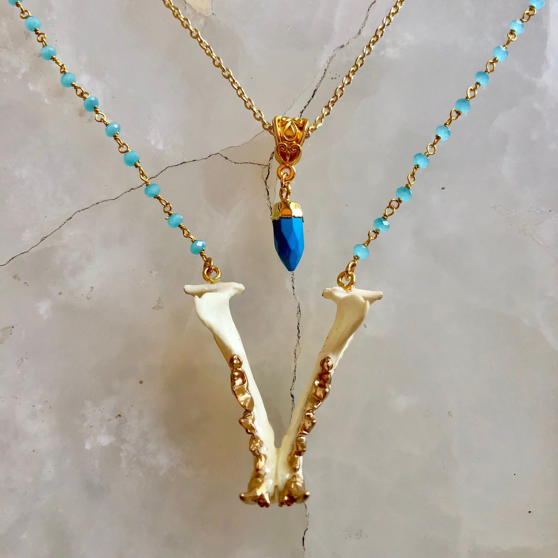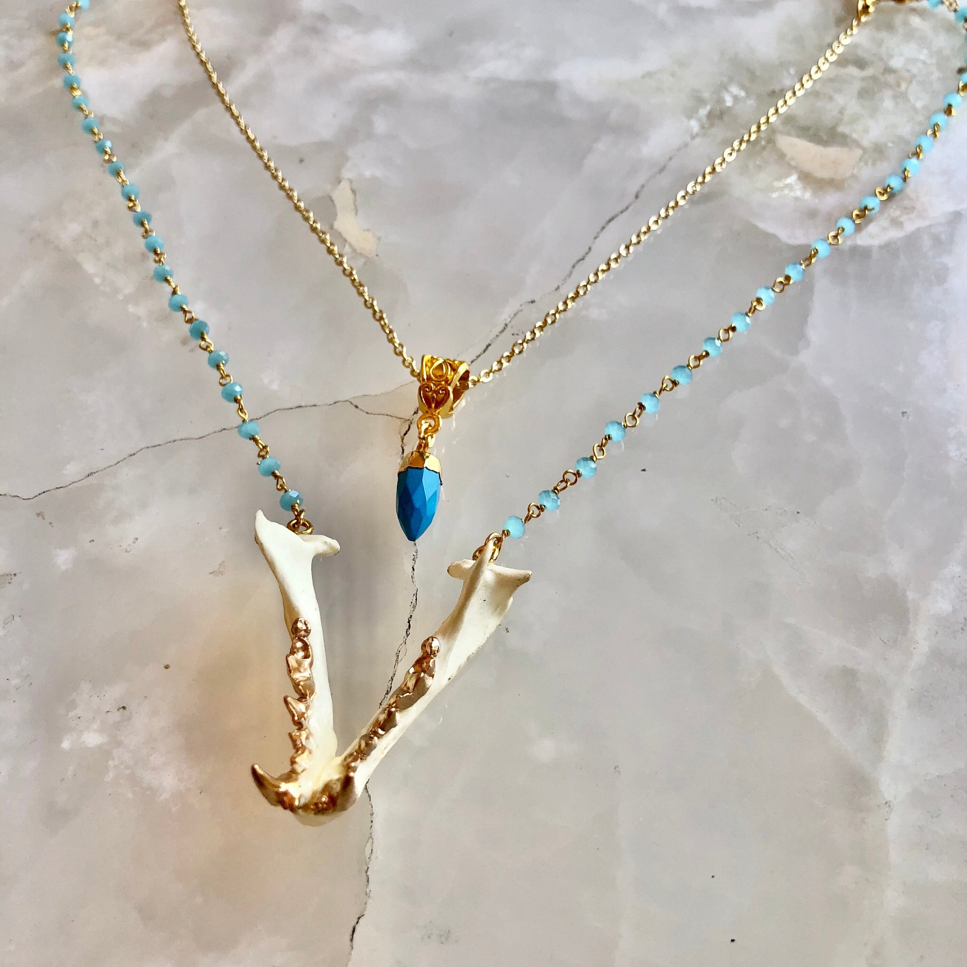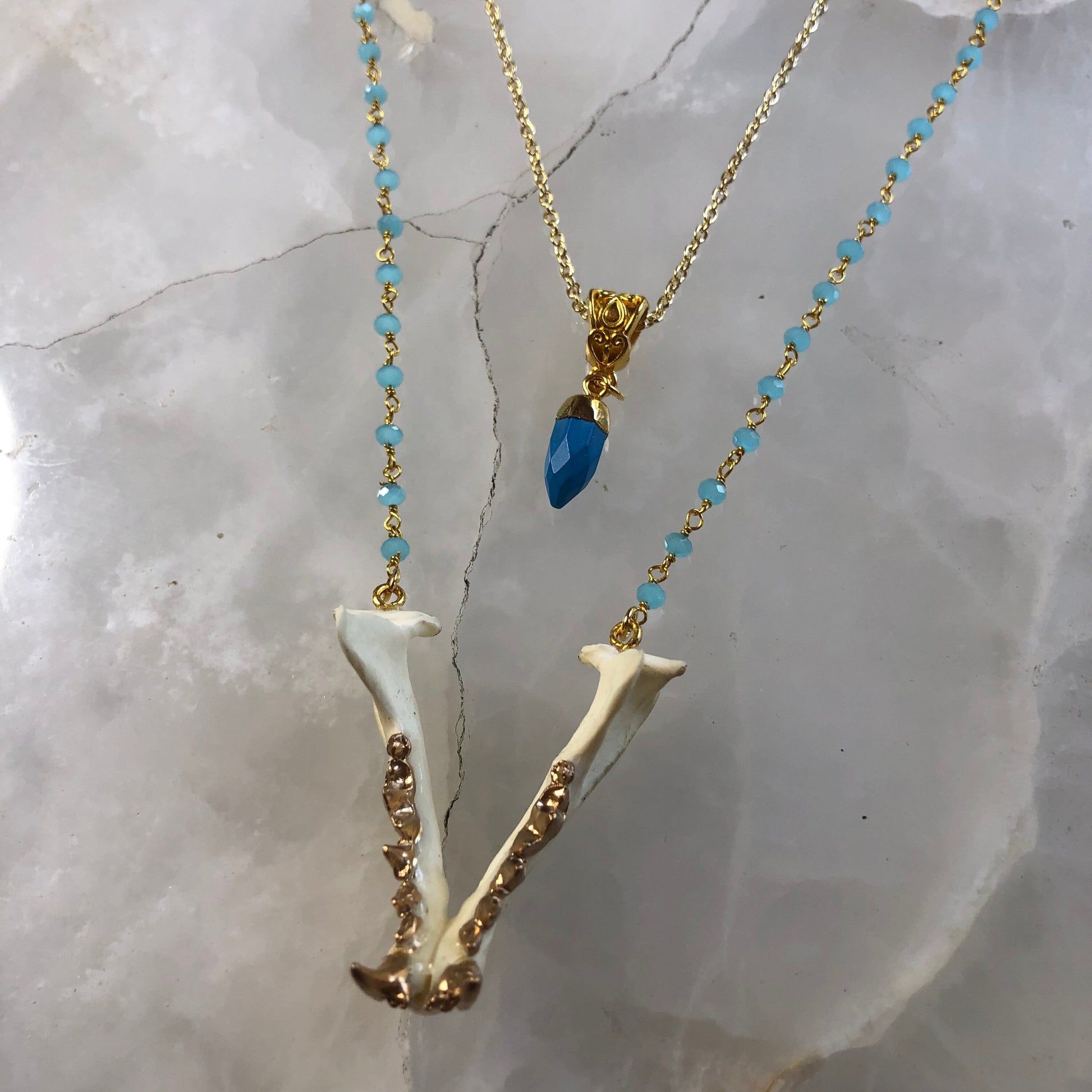 This unique necklace features an authentic mink jaw with gold gilded teeth and hangs from a chain of beads and connects to a gold chain that dangles a stone drop