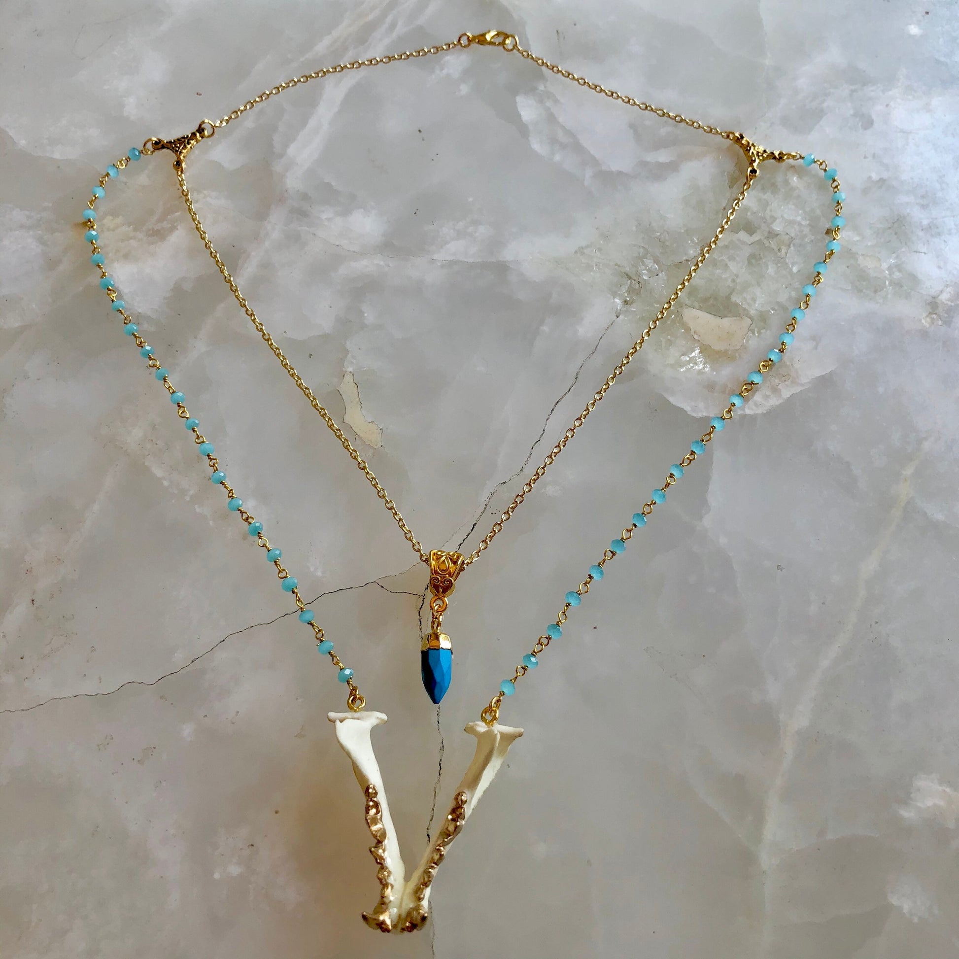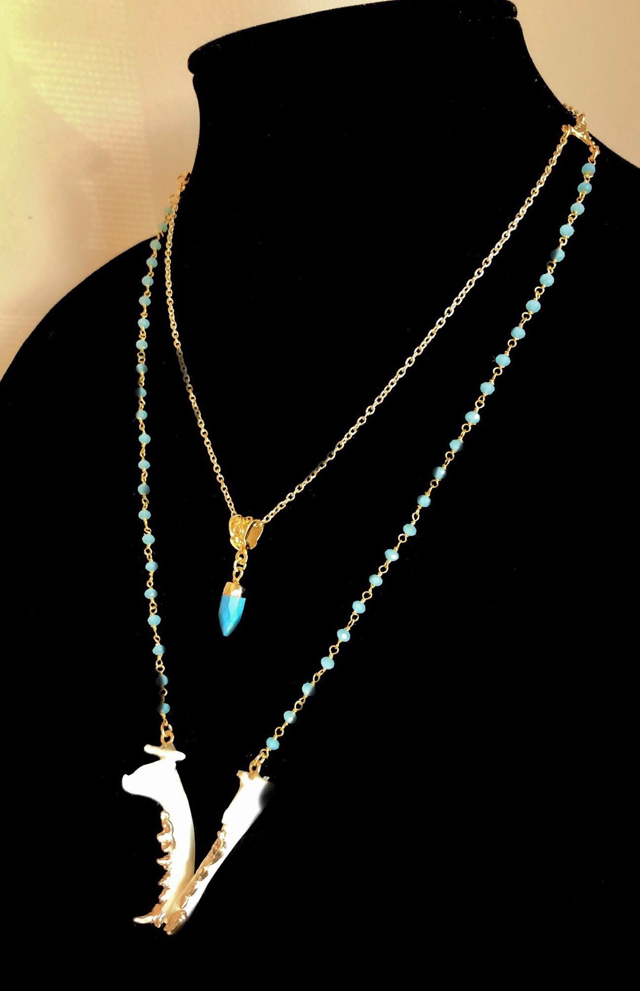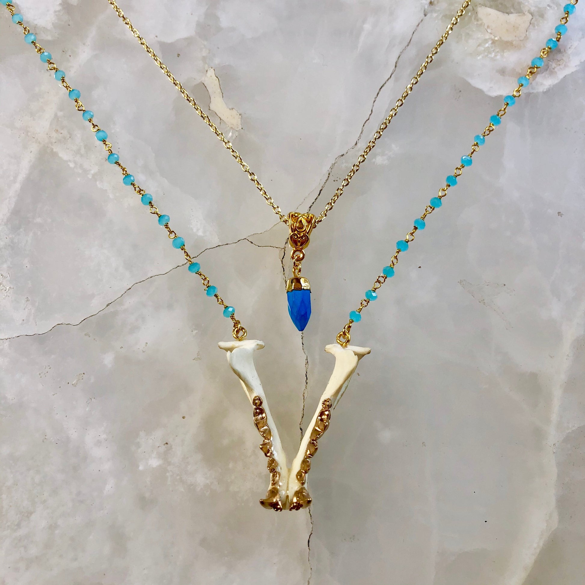 This unique necklace features an authentic mink jaw with gold gilded teeth and hangs from a chain of beads and connects to a gold chain that dangles a stone drop