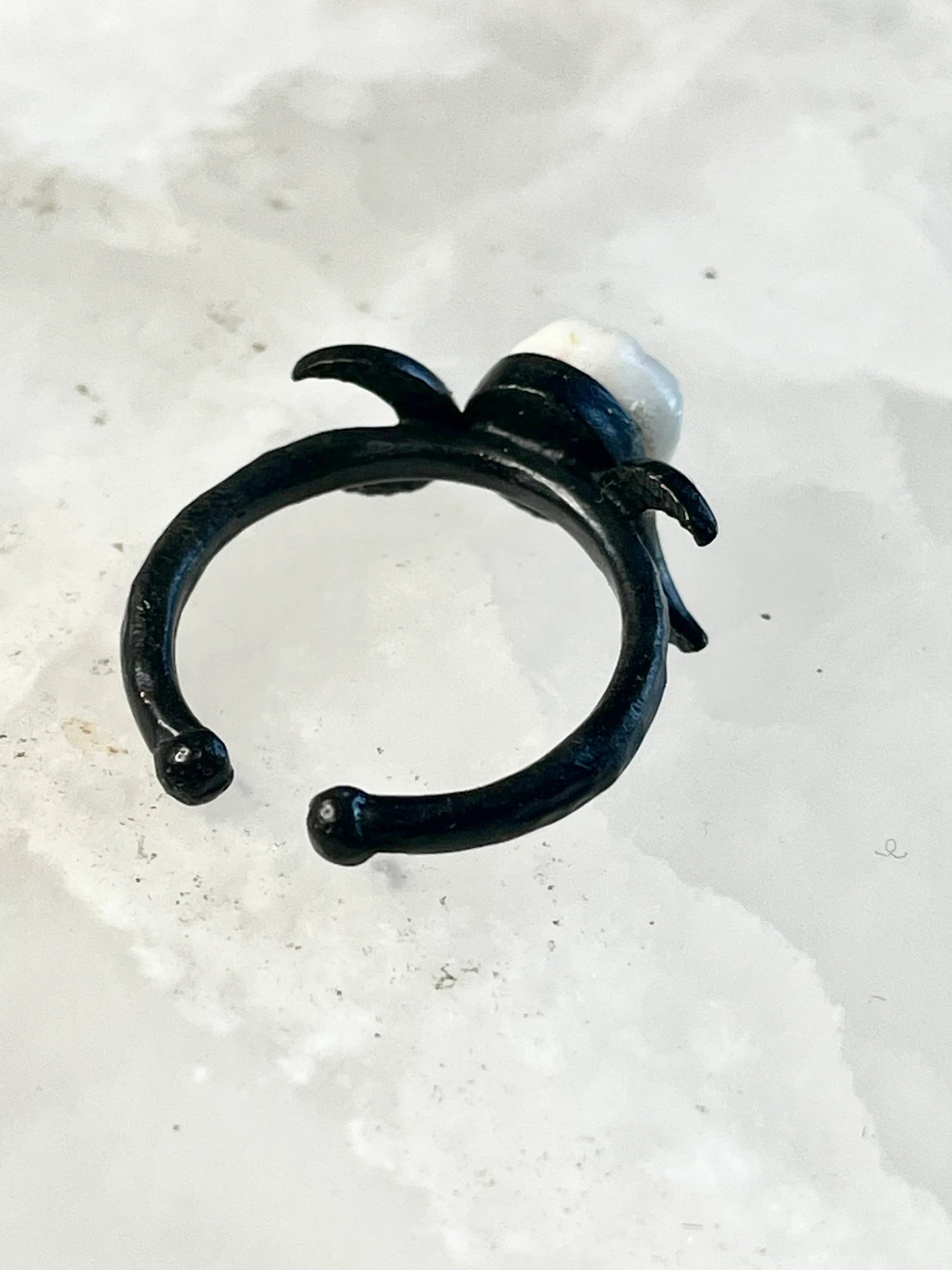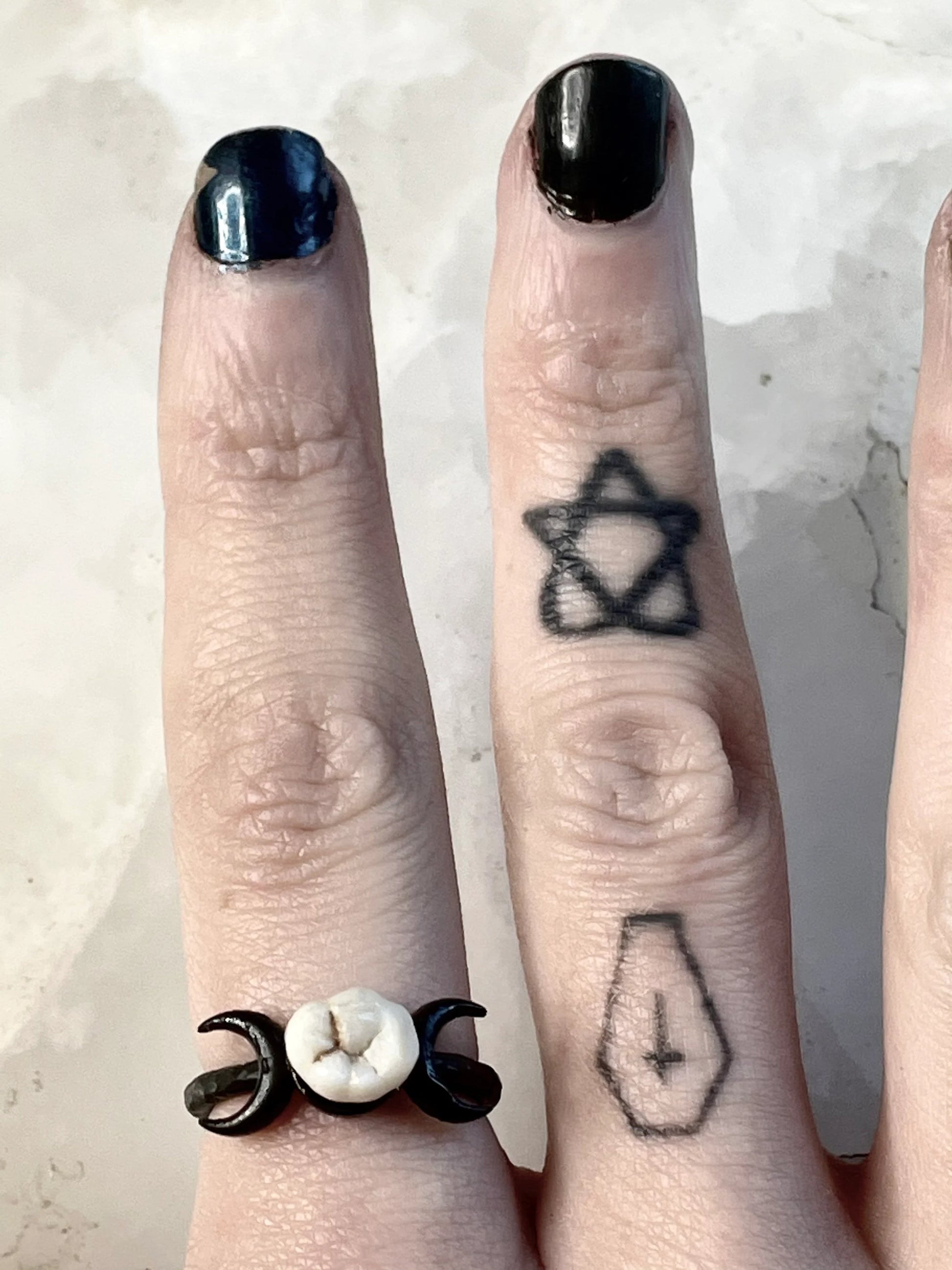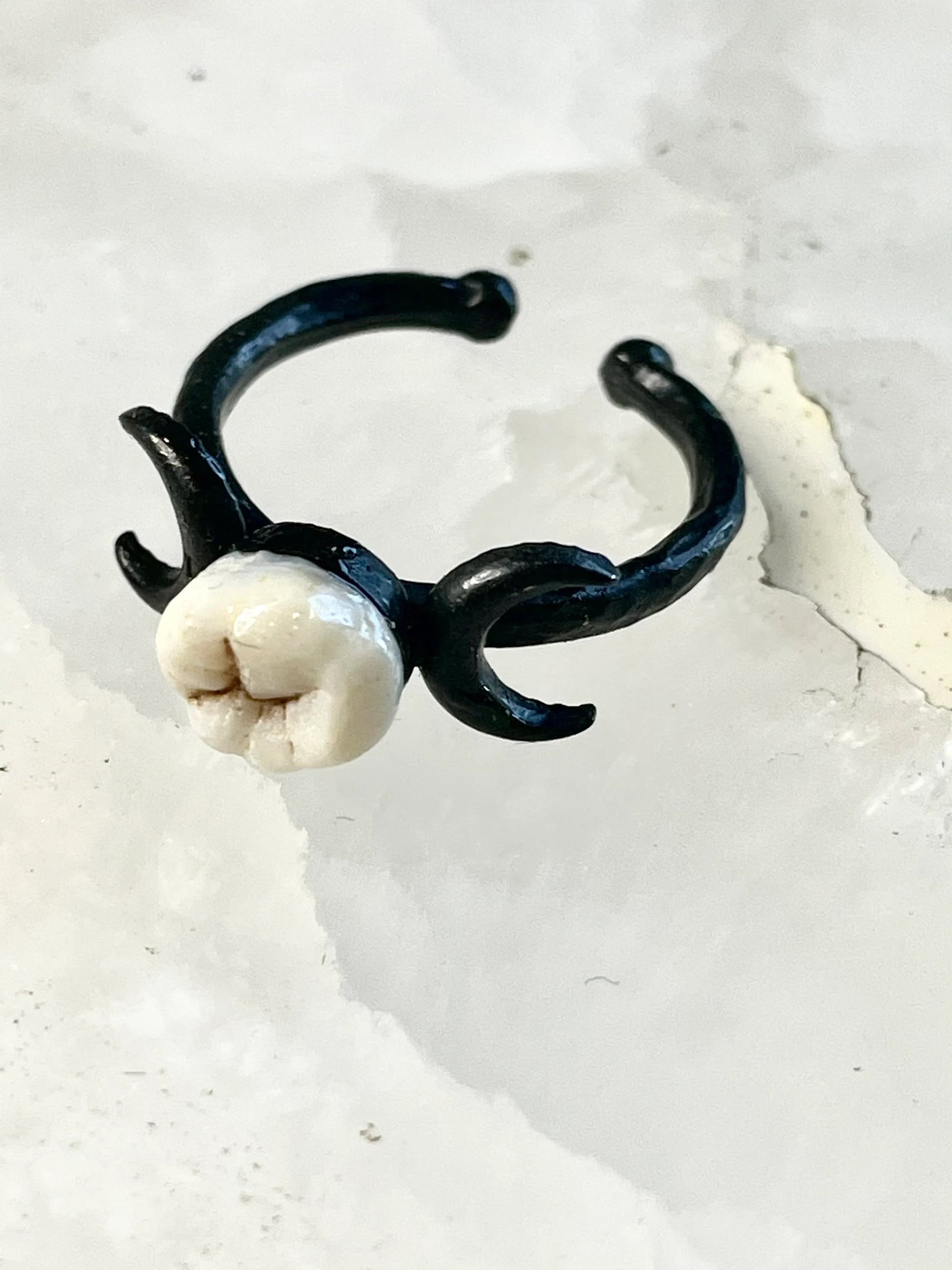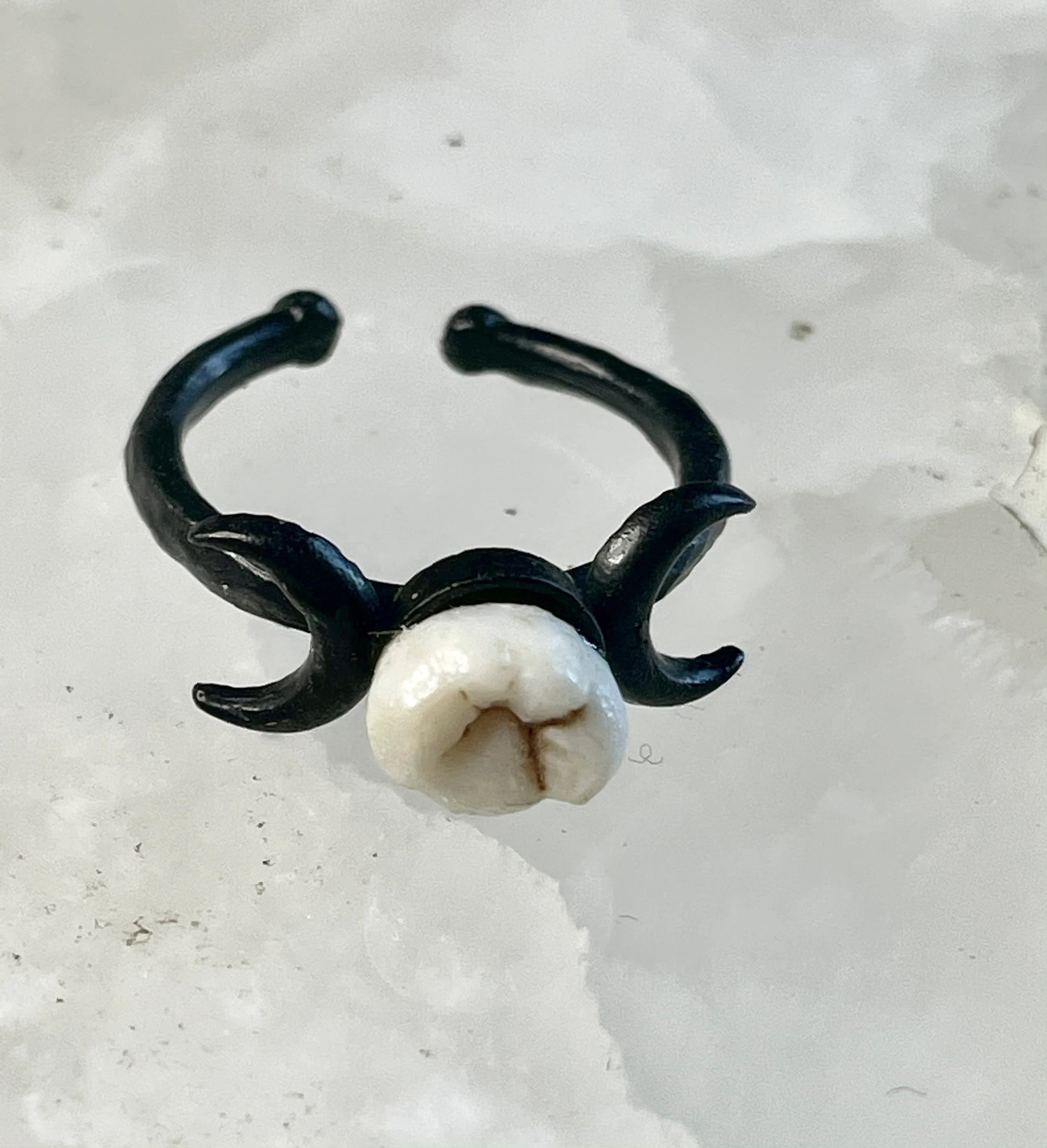 This unique witchy ring setting holds an authentic human premolar that centers two crescent moons. This ring black and adjustable! Perfect for any modern witch