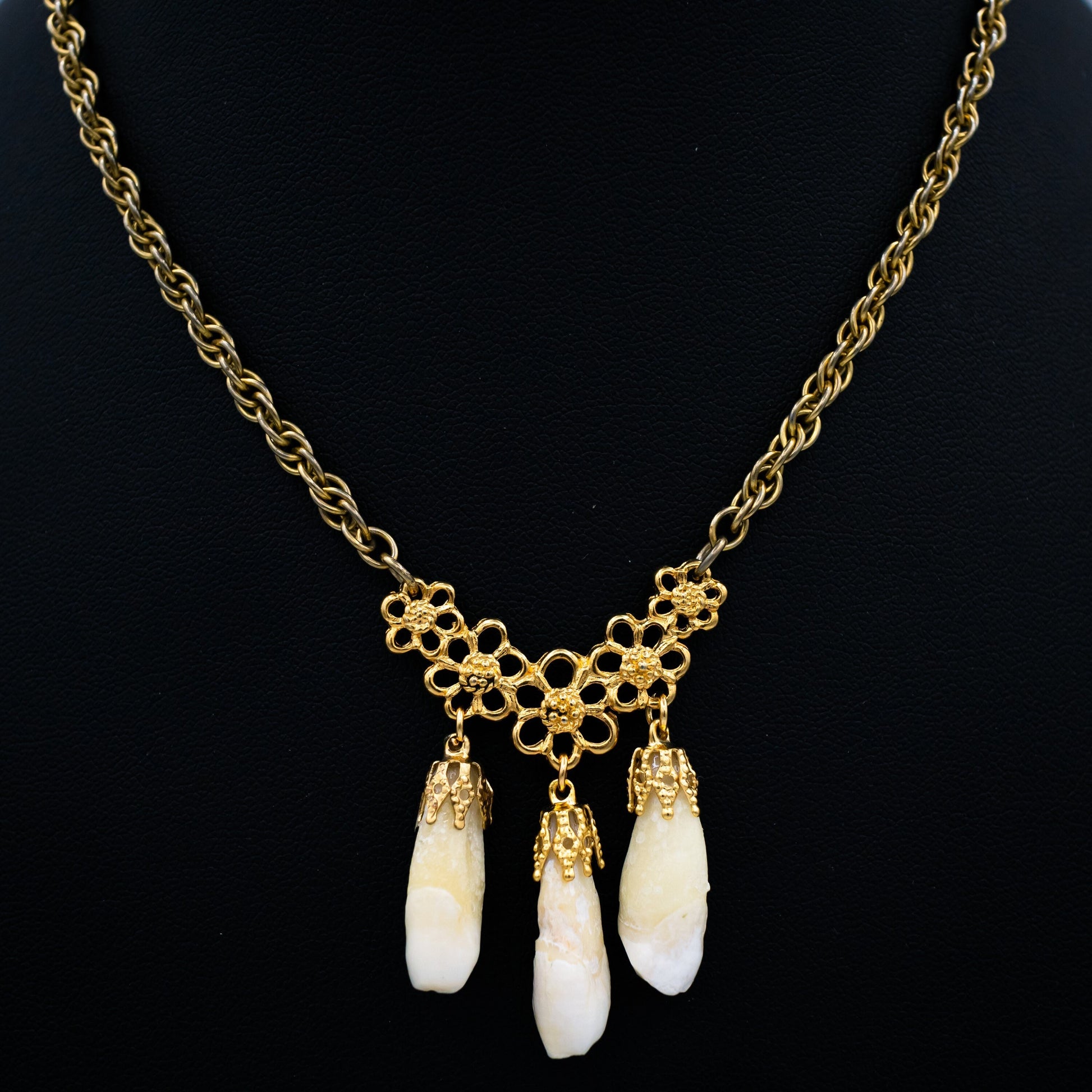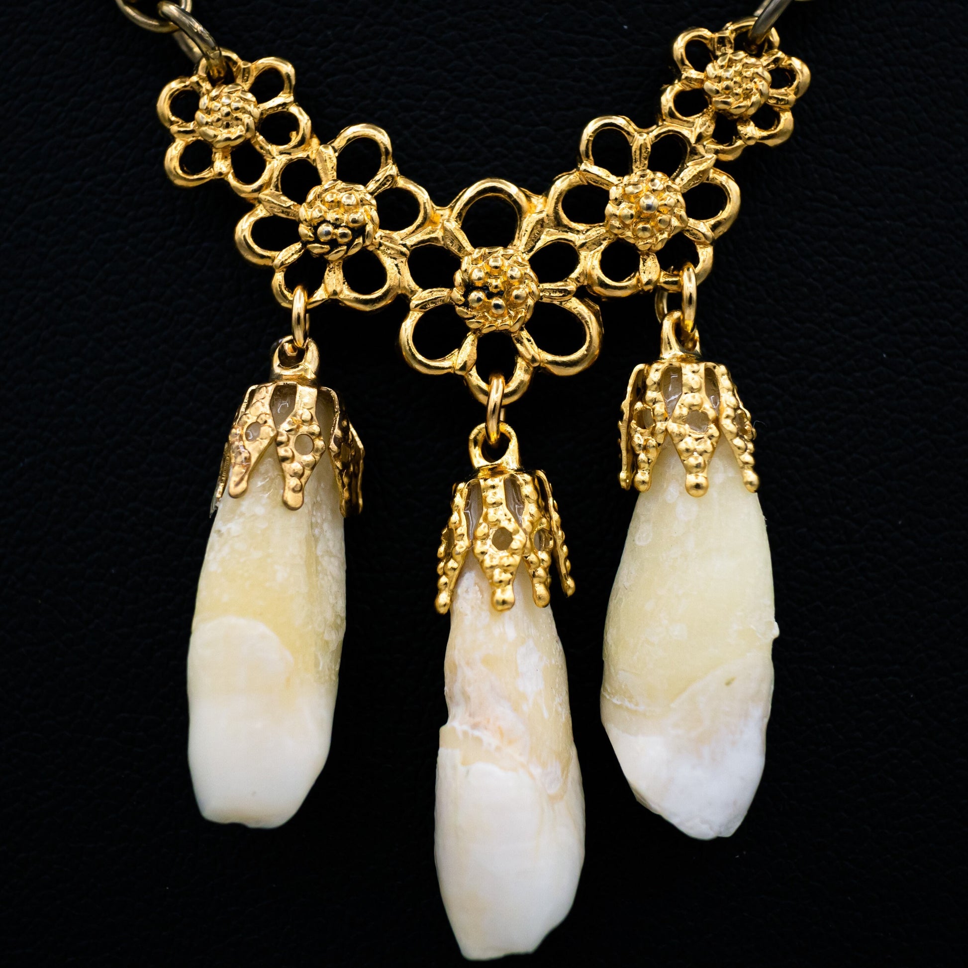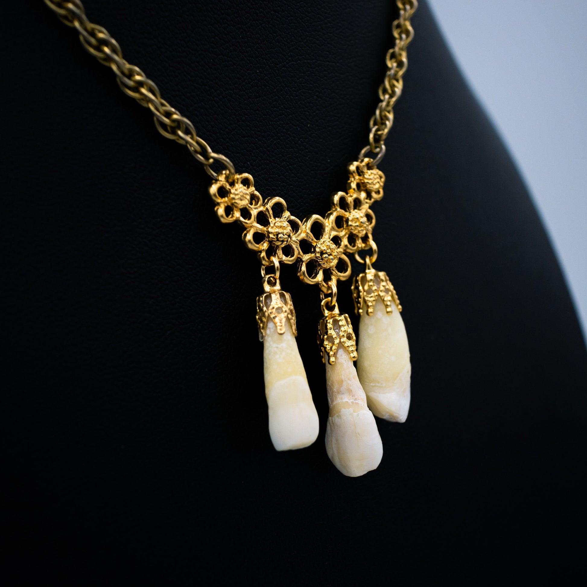 3 genuine human incisors are gold capped and dangle on a floral connector by a vintage gold chain