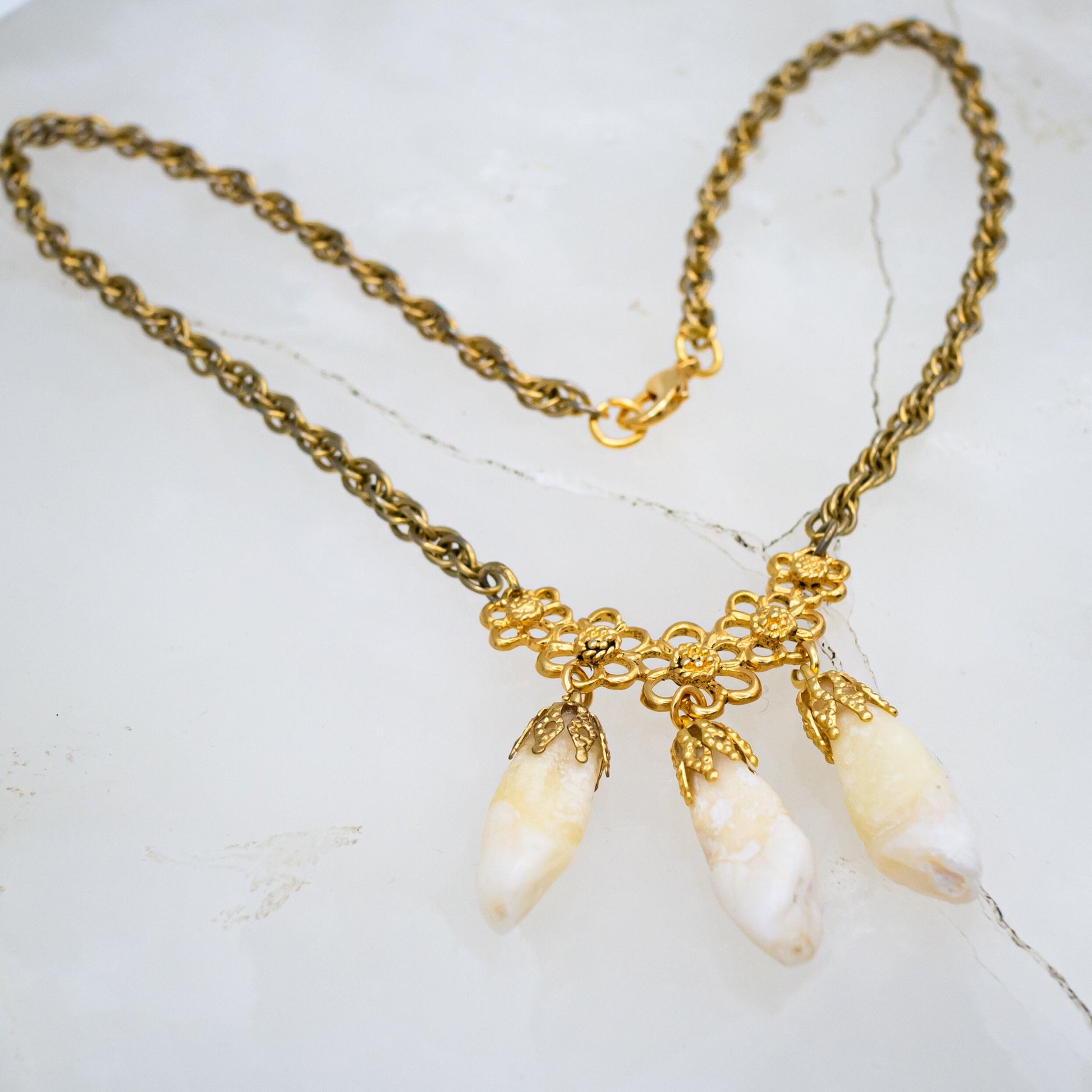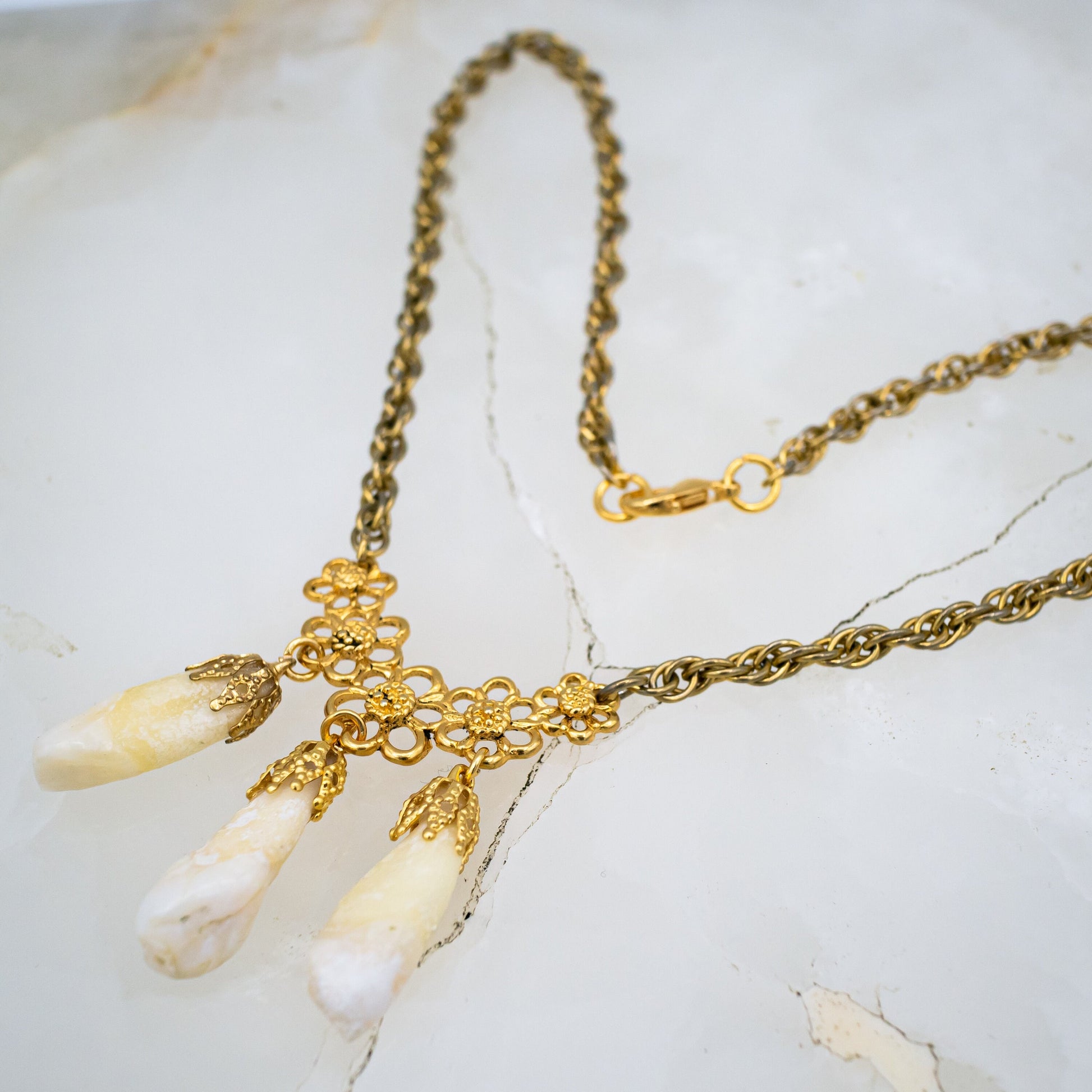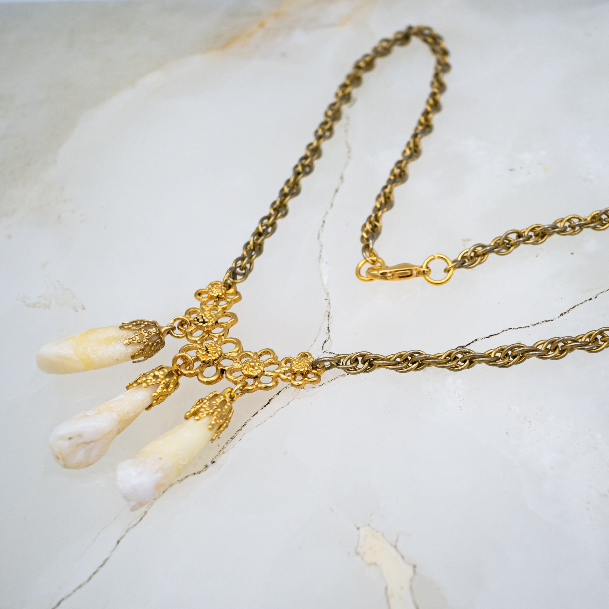 3 genuine human incisors are gold capped and dangle on a floral connector by a vintage gold chain