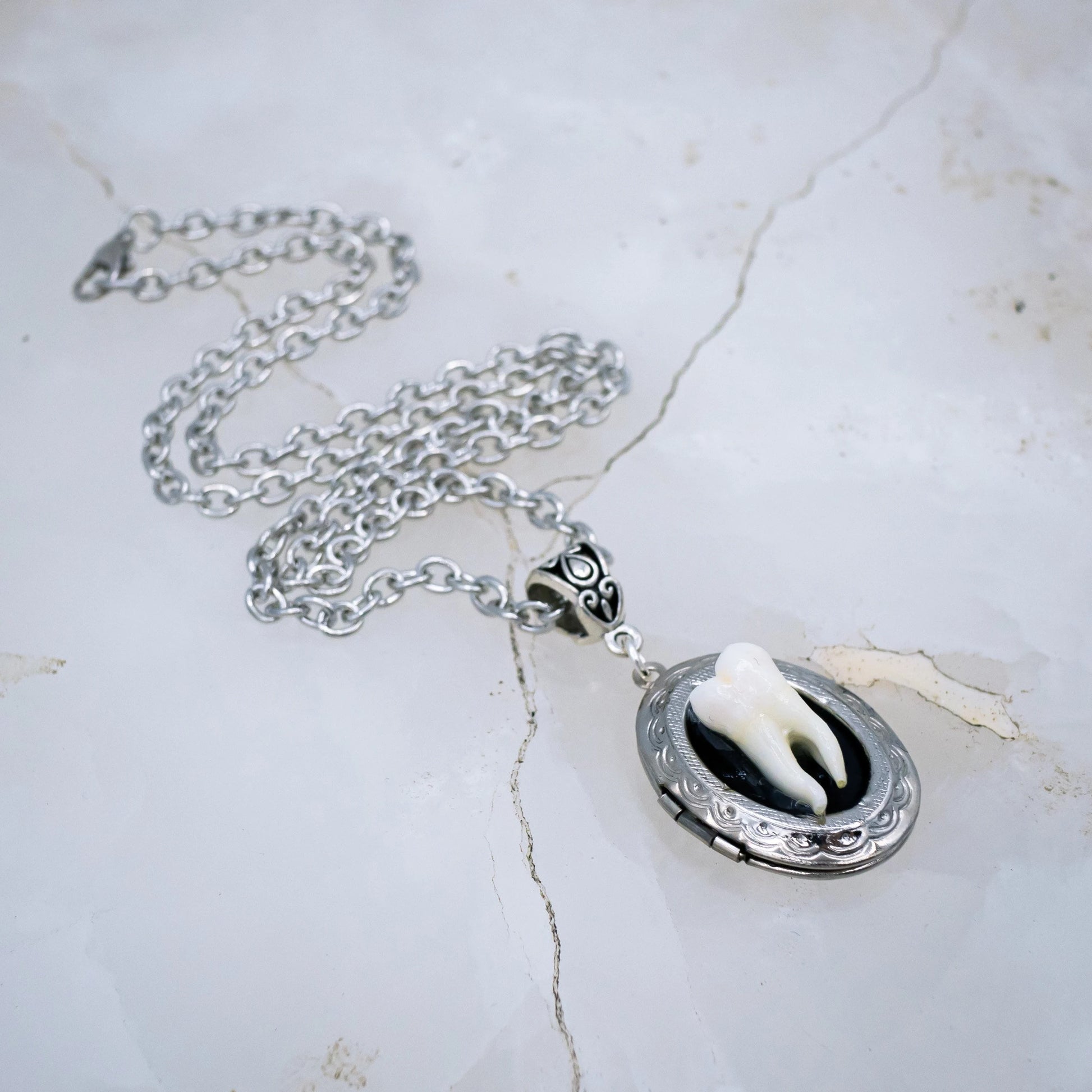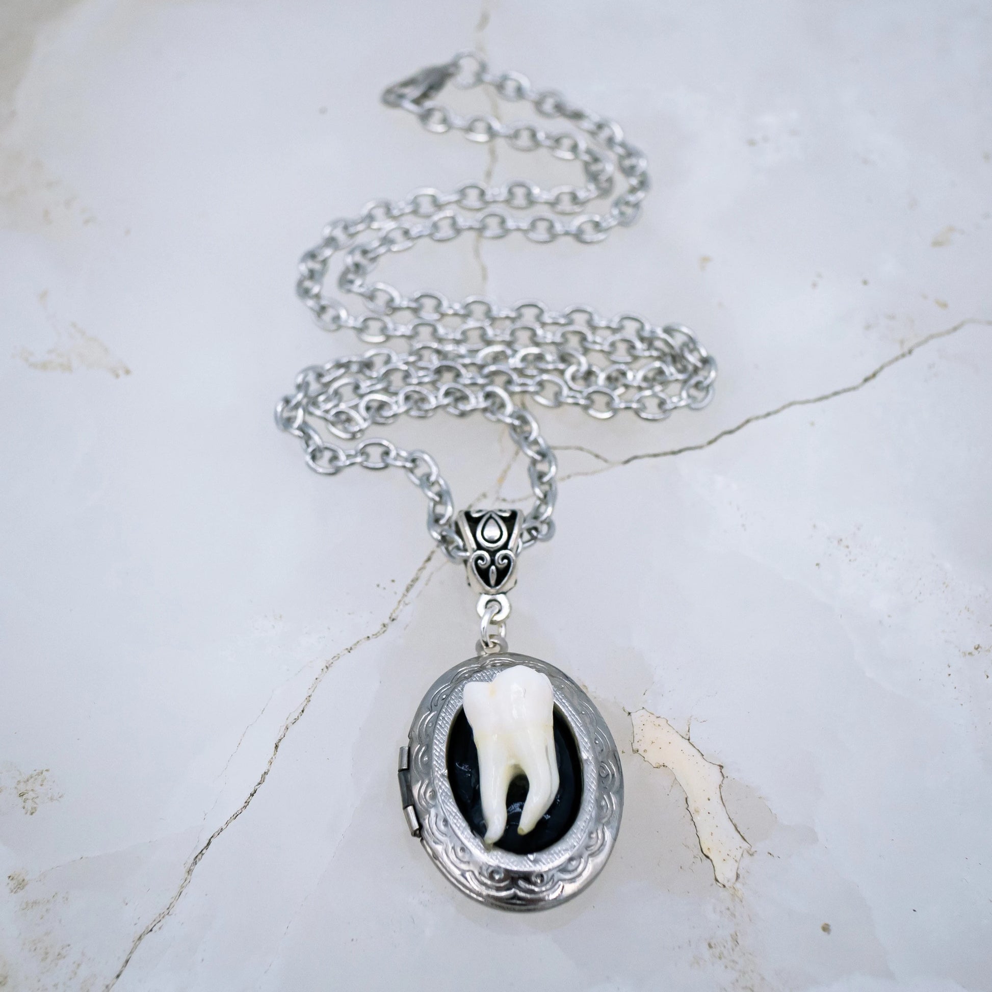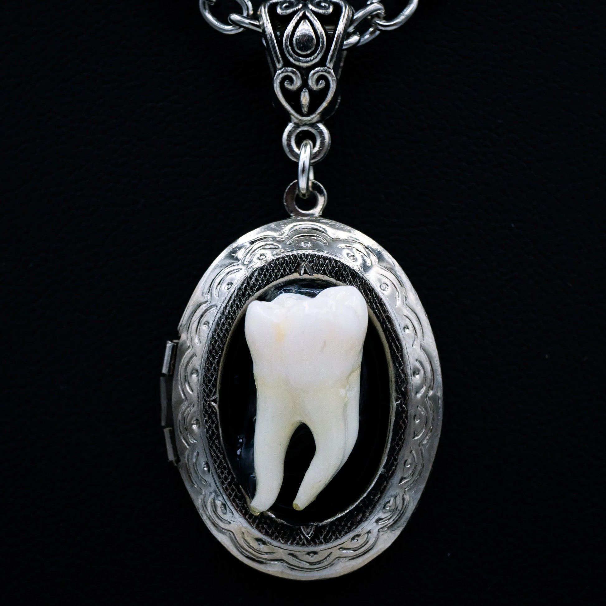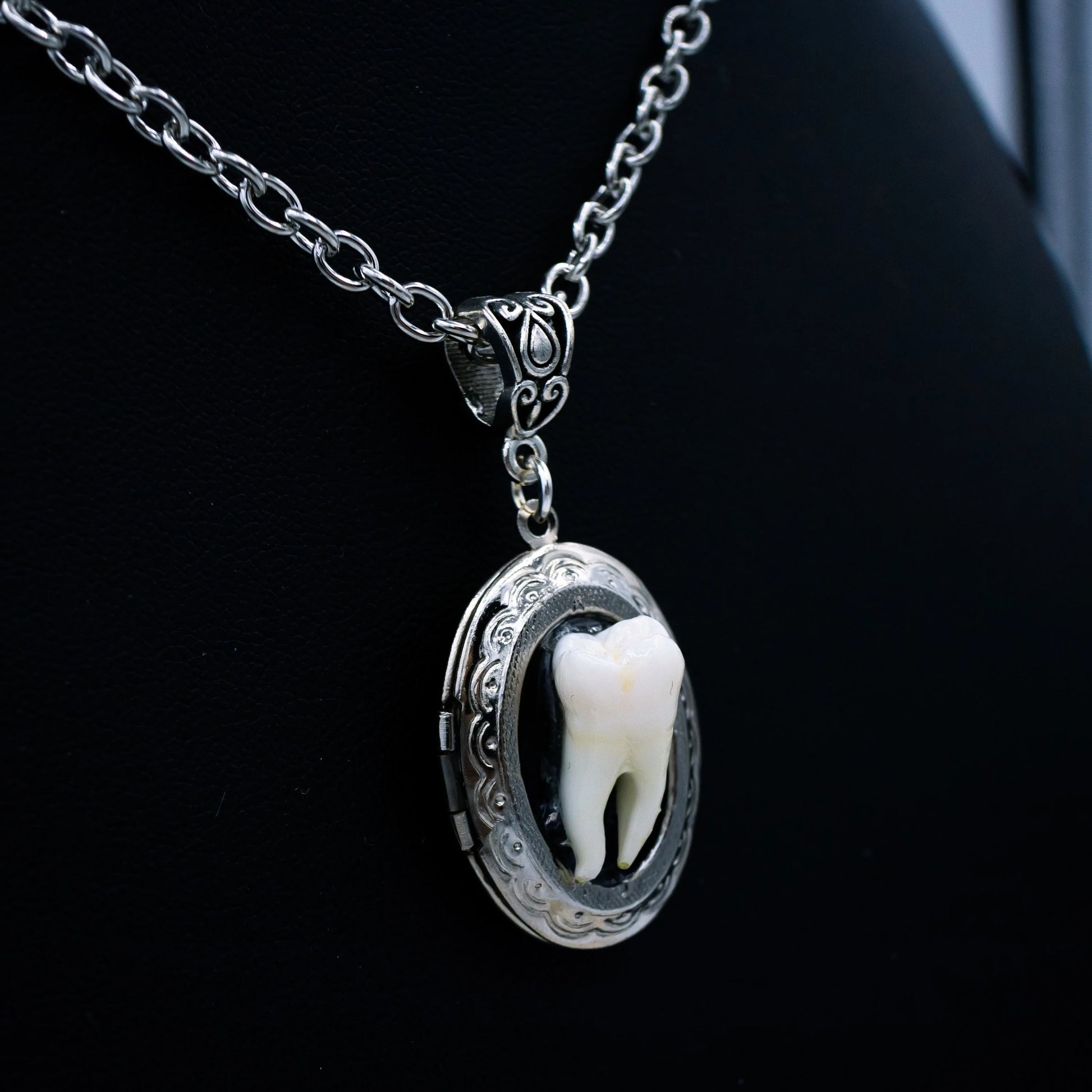 This genuine human tooth is resin coated and rests on a functional locket from a matching 16 inch chain making an eye catching and macabre necklace.