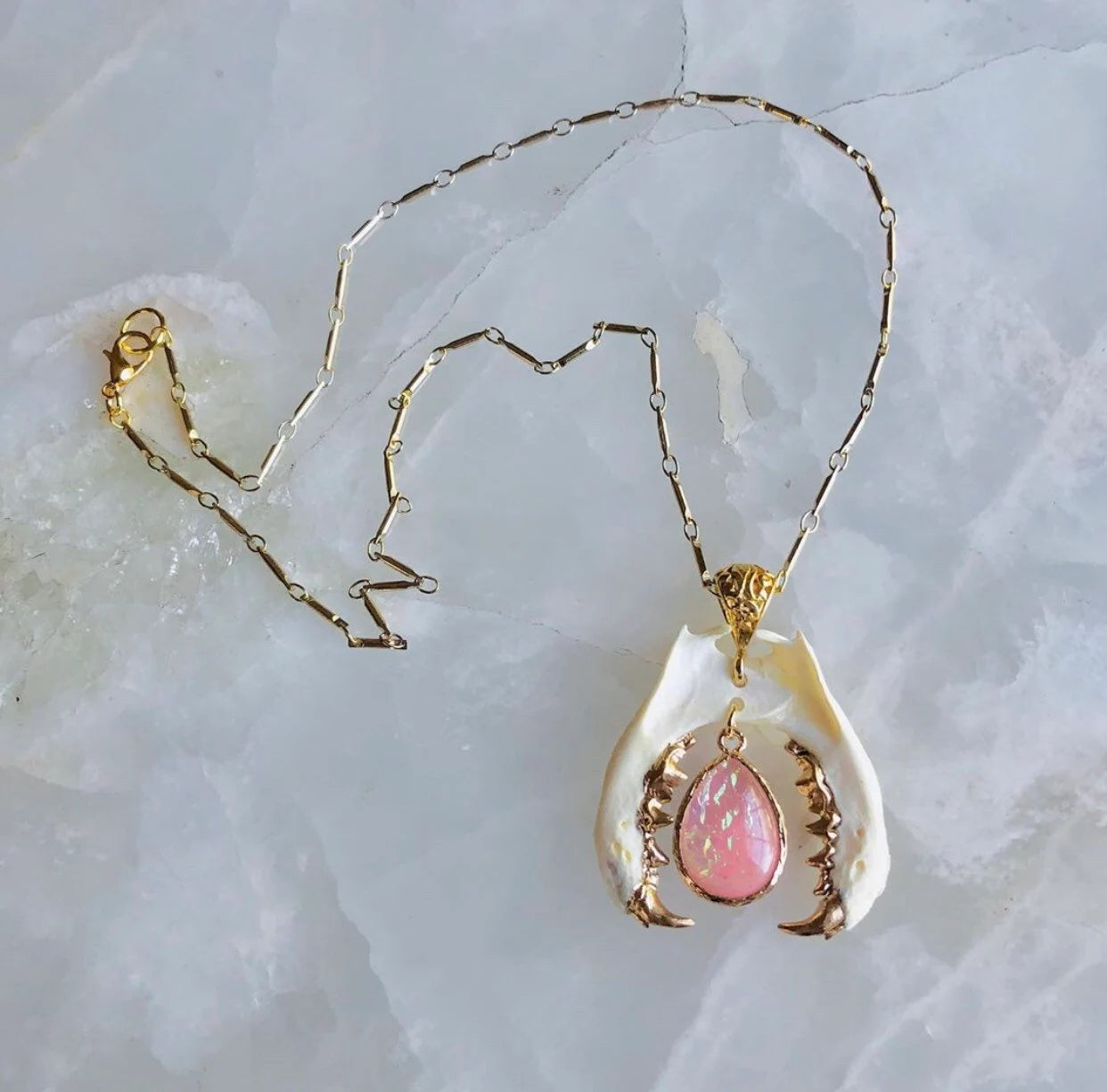 Authentic mink jaws have gold gilded teeth hang from a gold filled decorative bail and gold chain centering a stunning pendant of pink or blue faux opal