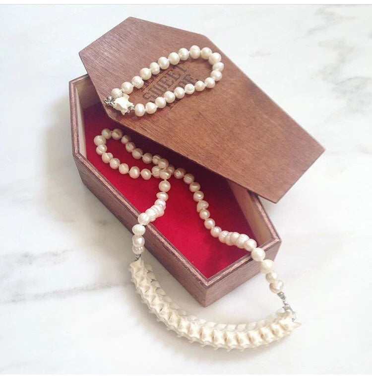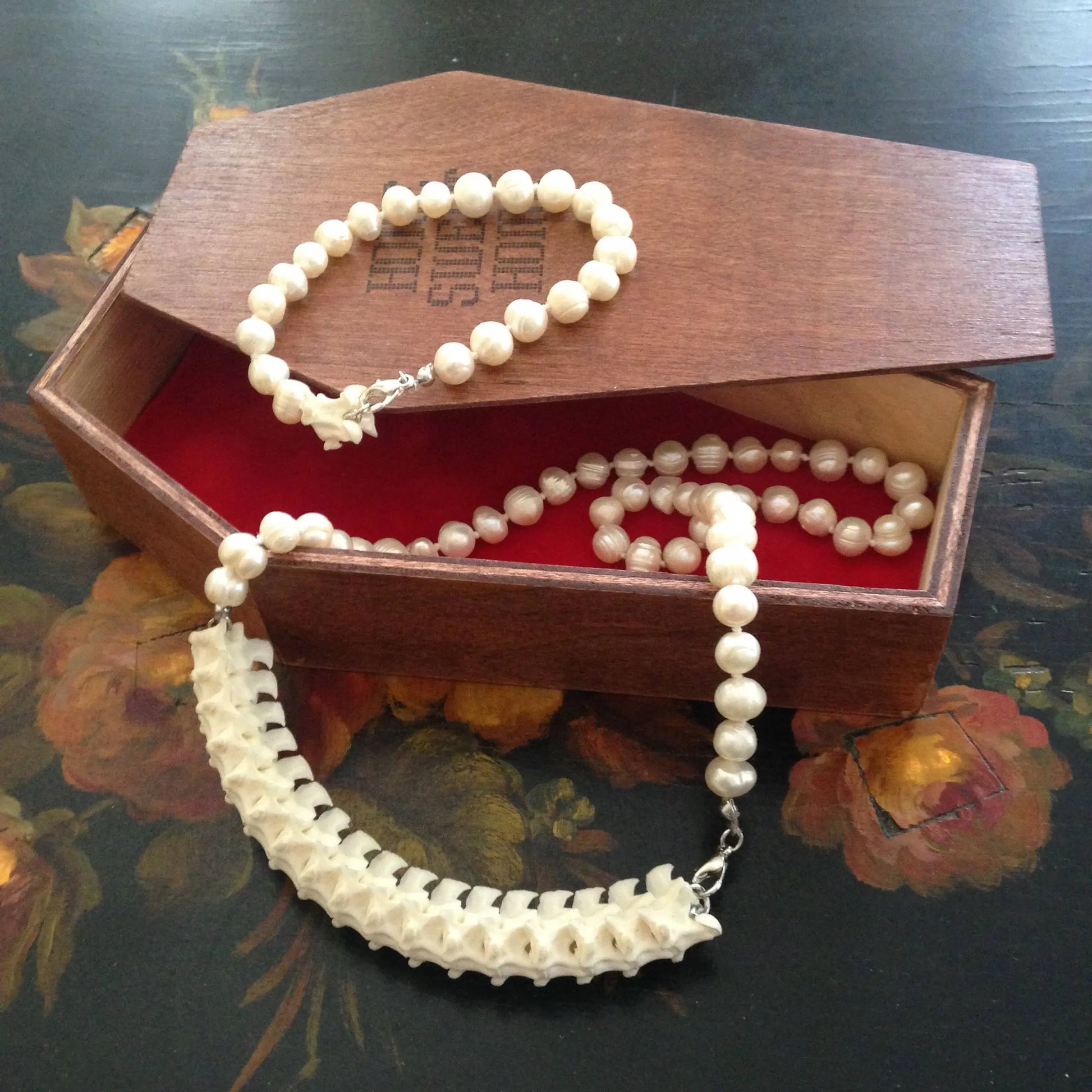 Land meets the sea when authentic Python vertebrae are paired with salt water pearls in this stunning jewelry set containing a matching necklace and bracelet including the coffin shaped jewelry box