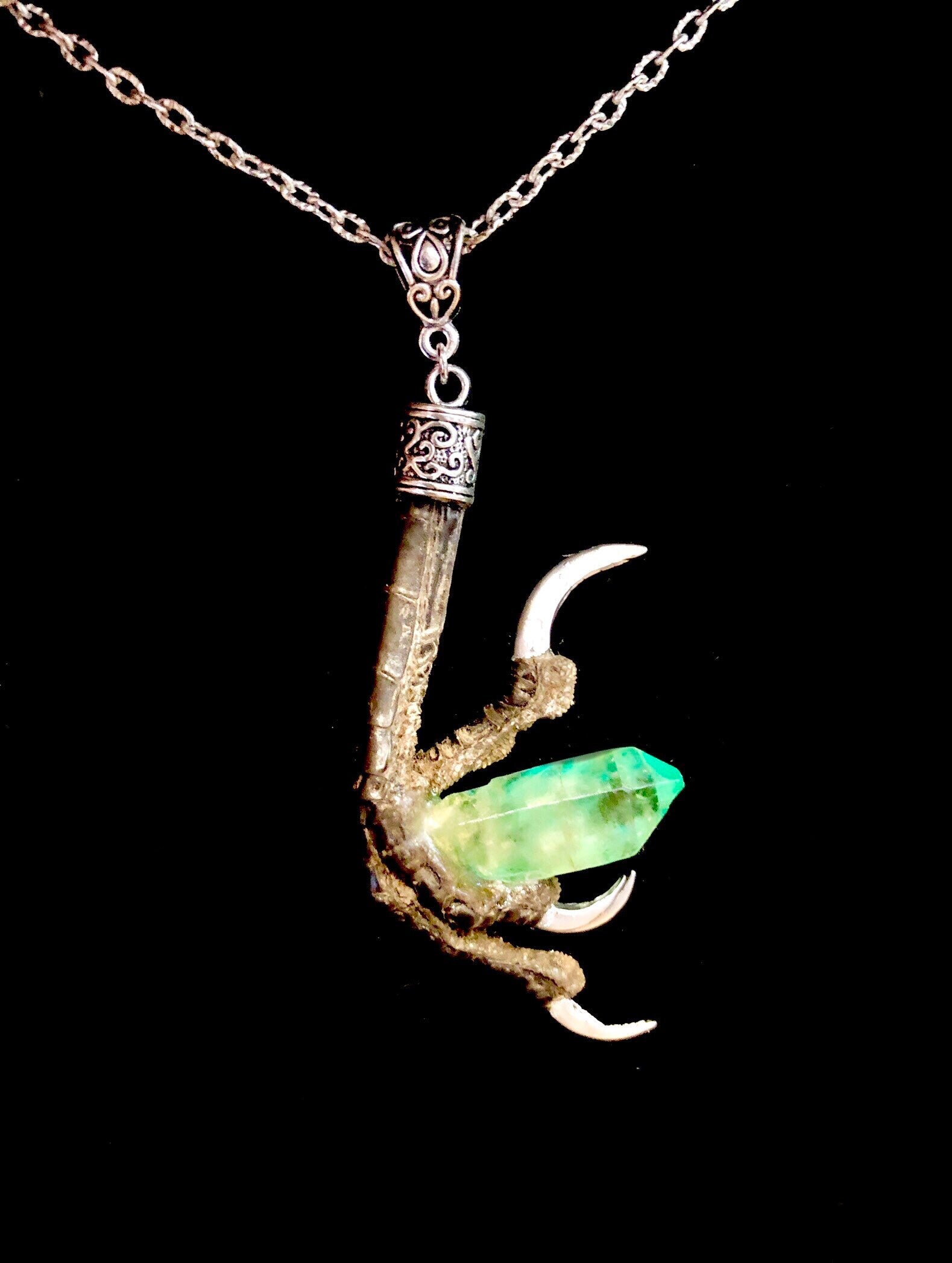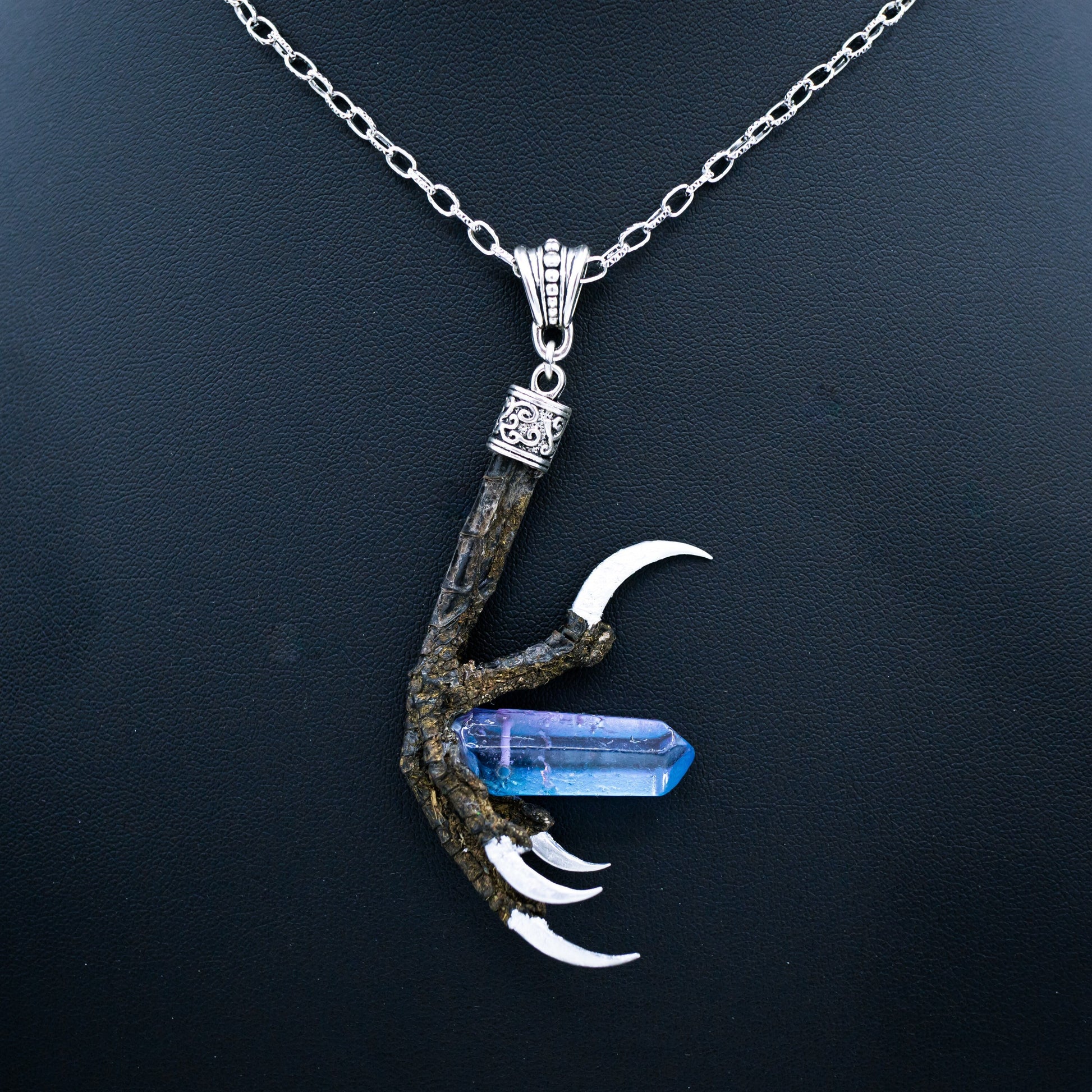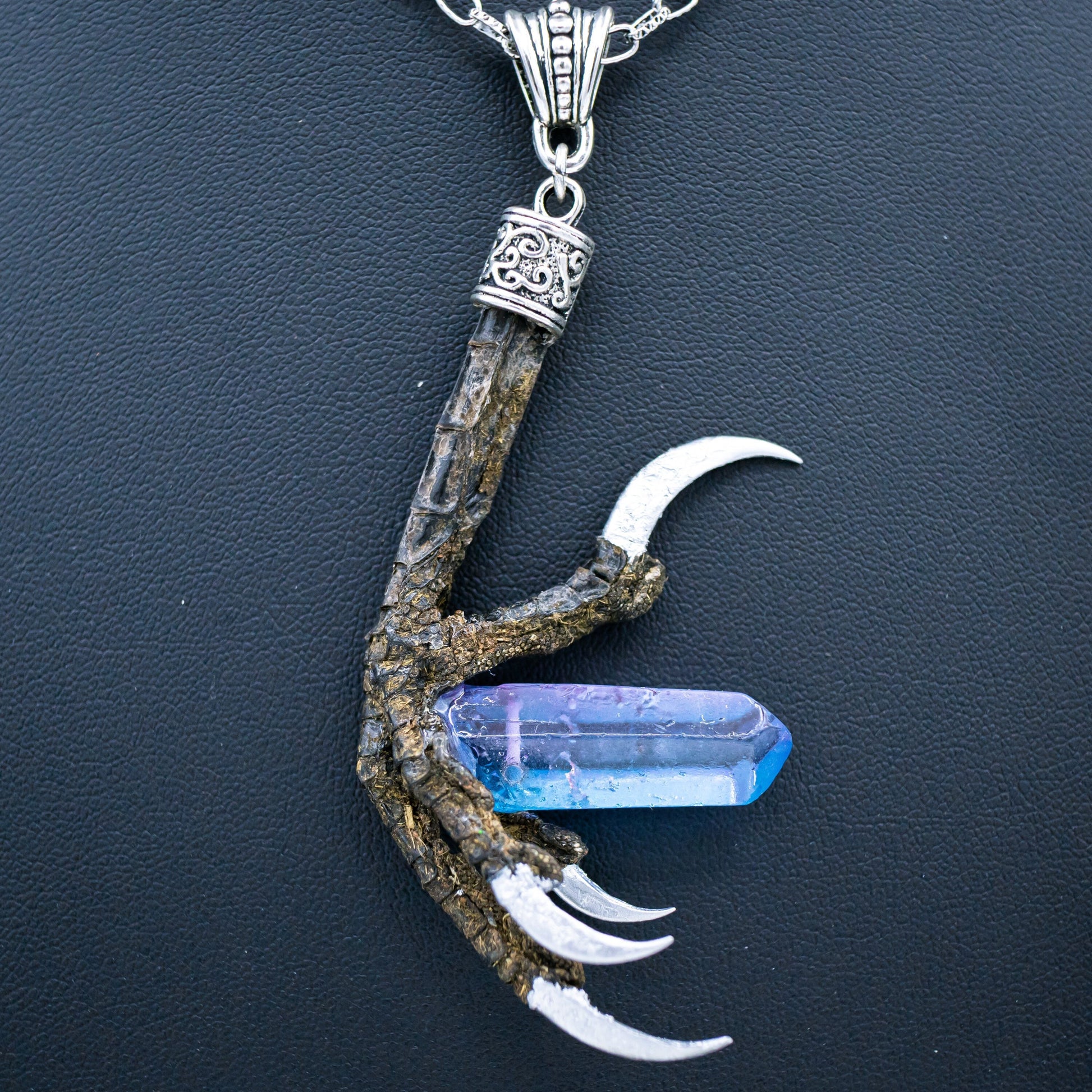 This authentic crow talon has silver gilded nails and holds a large dyed quartz crystal! It hangs from a decorative bail on a long silver chain