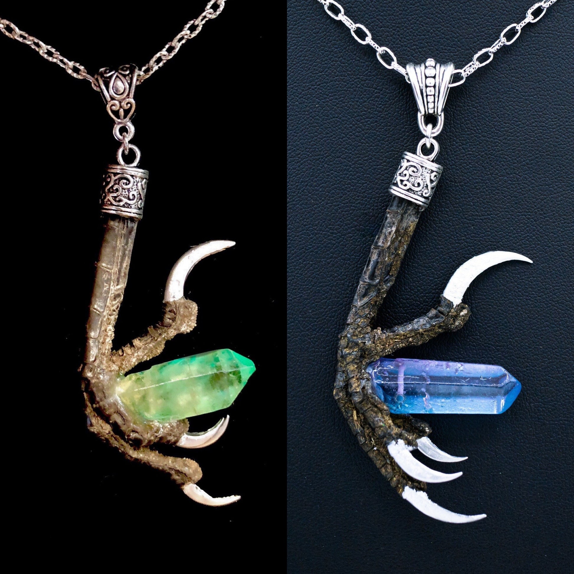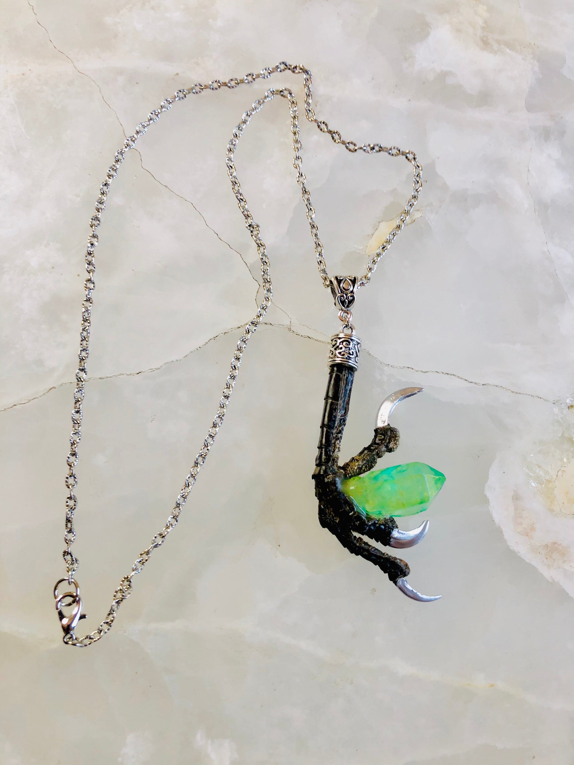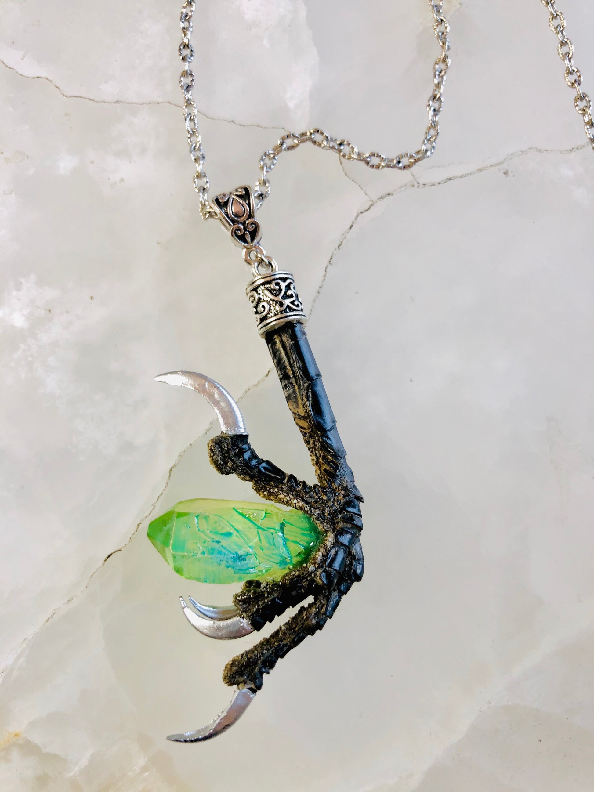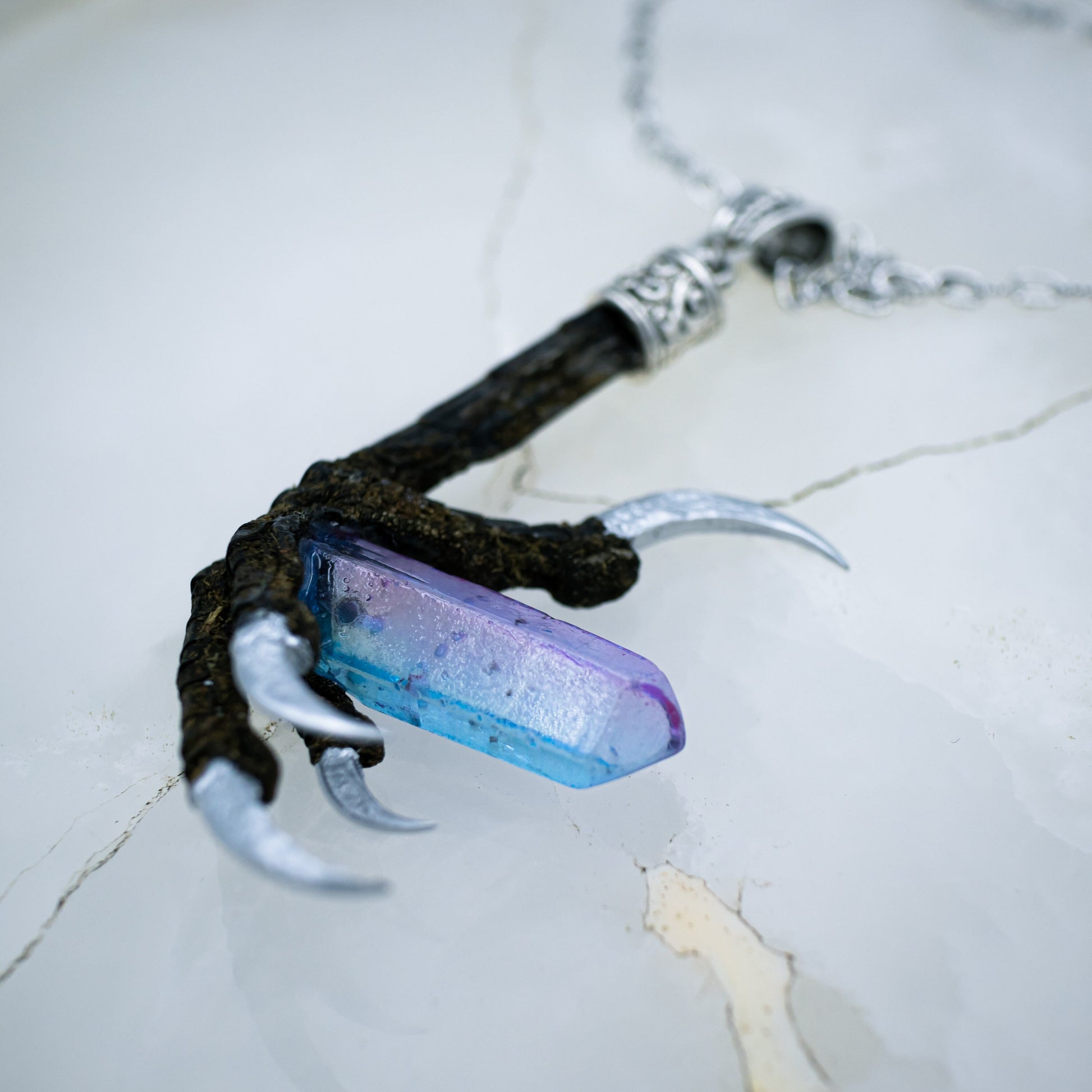 This authentic crow talon has silver gilded nails and holds a large dyed quartz crystal! It hangs from a decorative bail on a long silver chain
