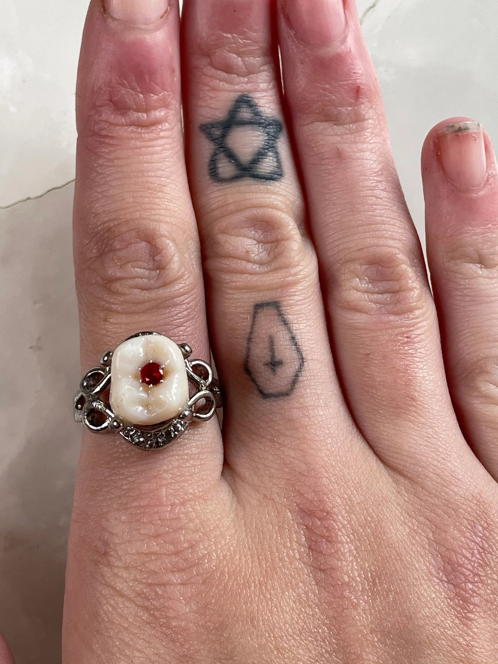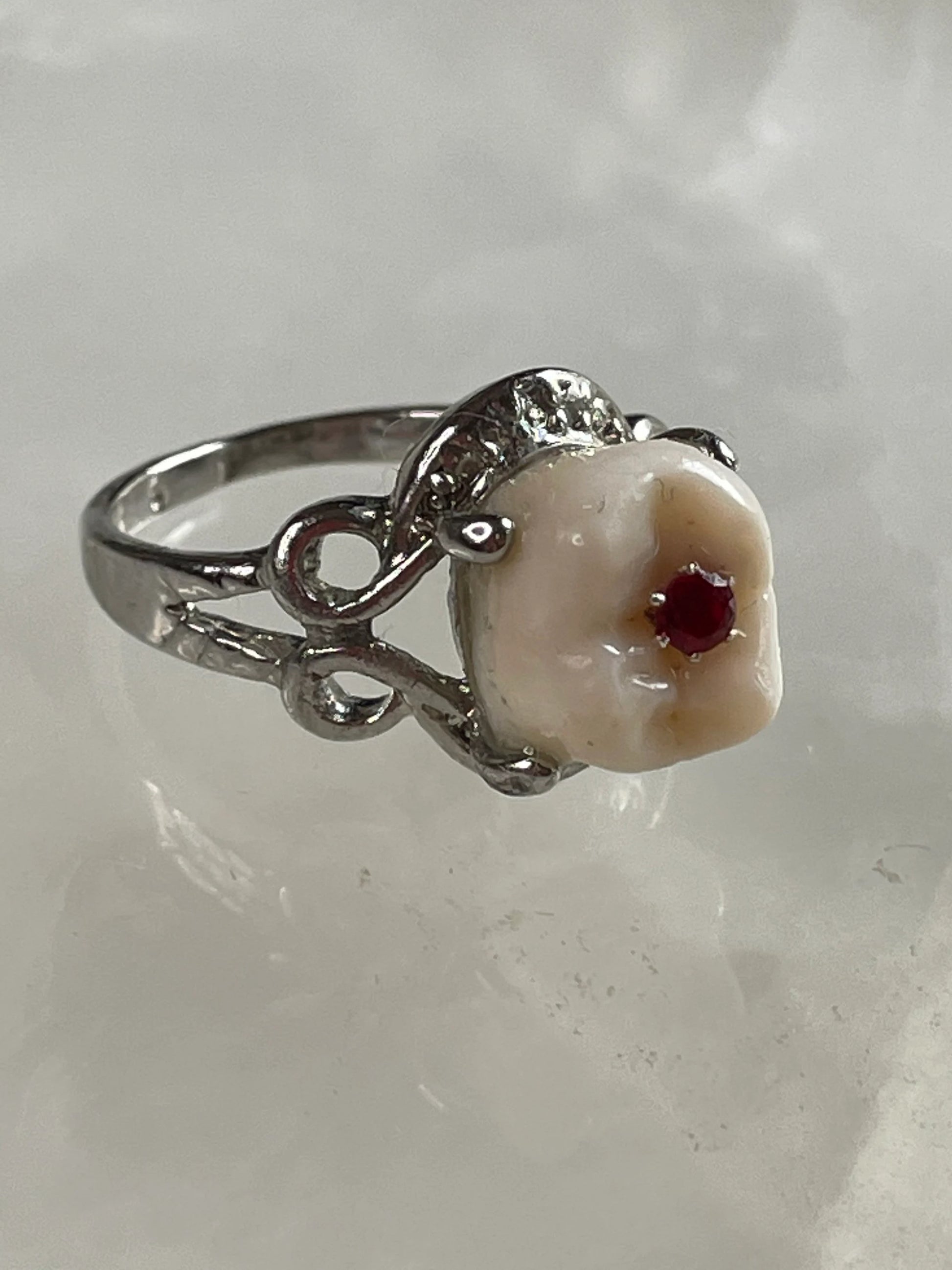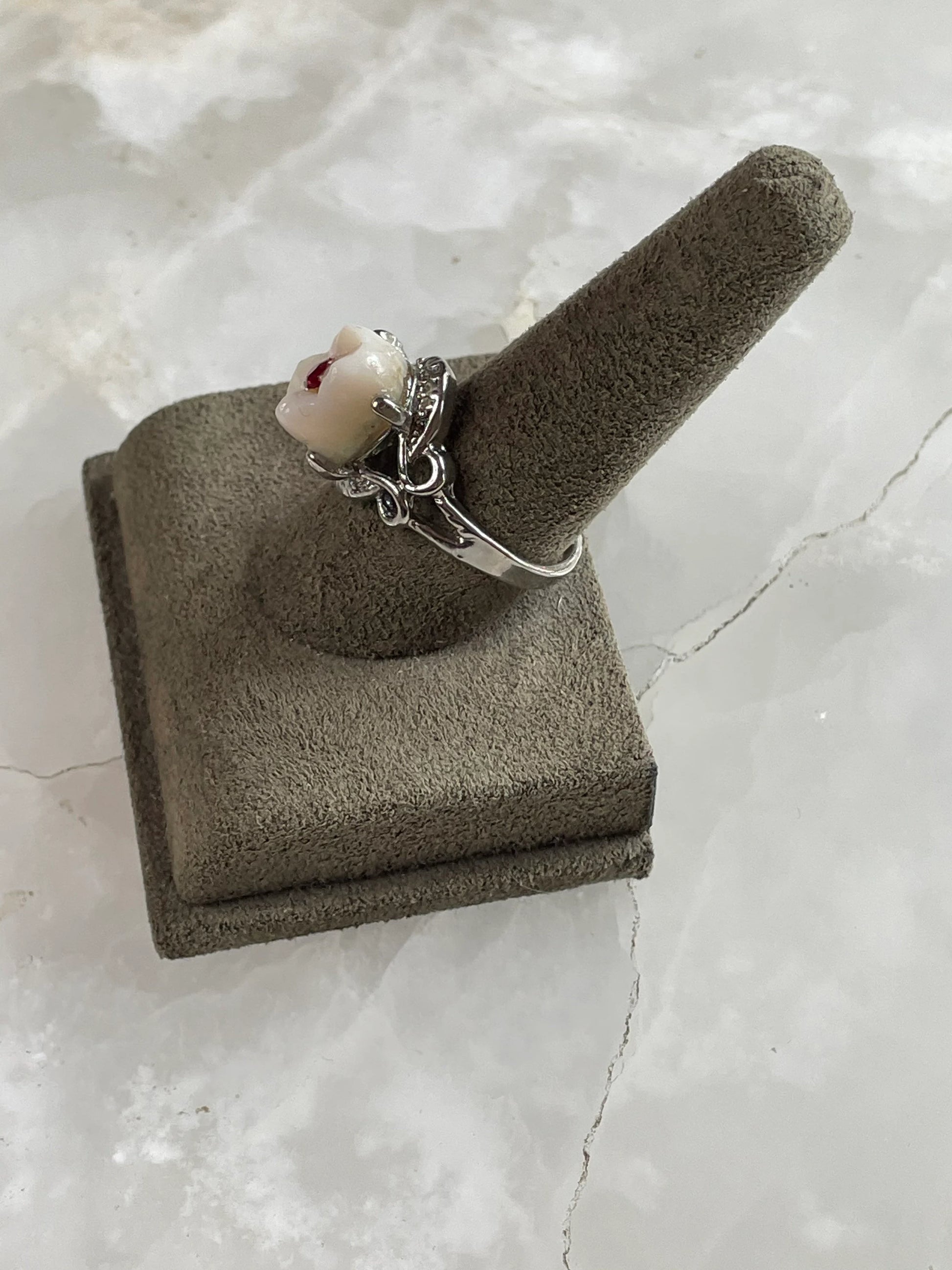 This unique ring features an authentic human molar with a deep red crystal cavity and is set in a stunning silver plated ring setting size 8