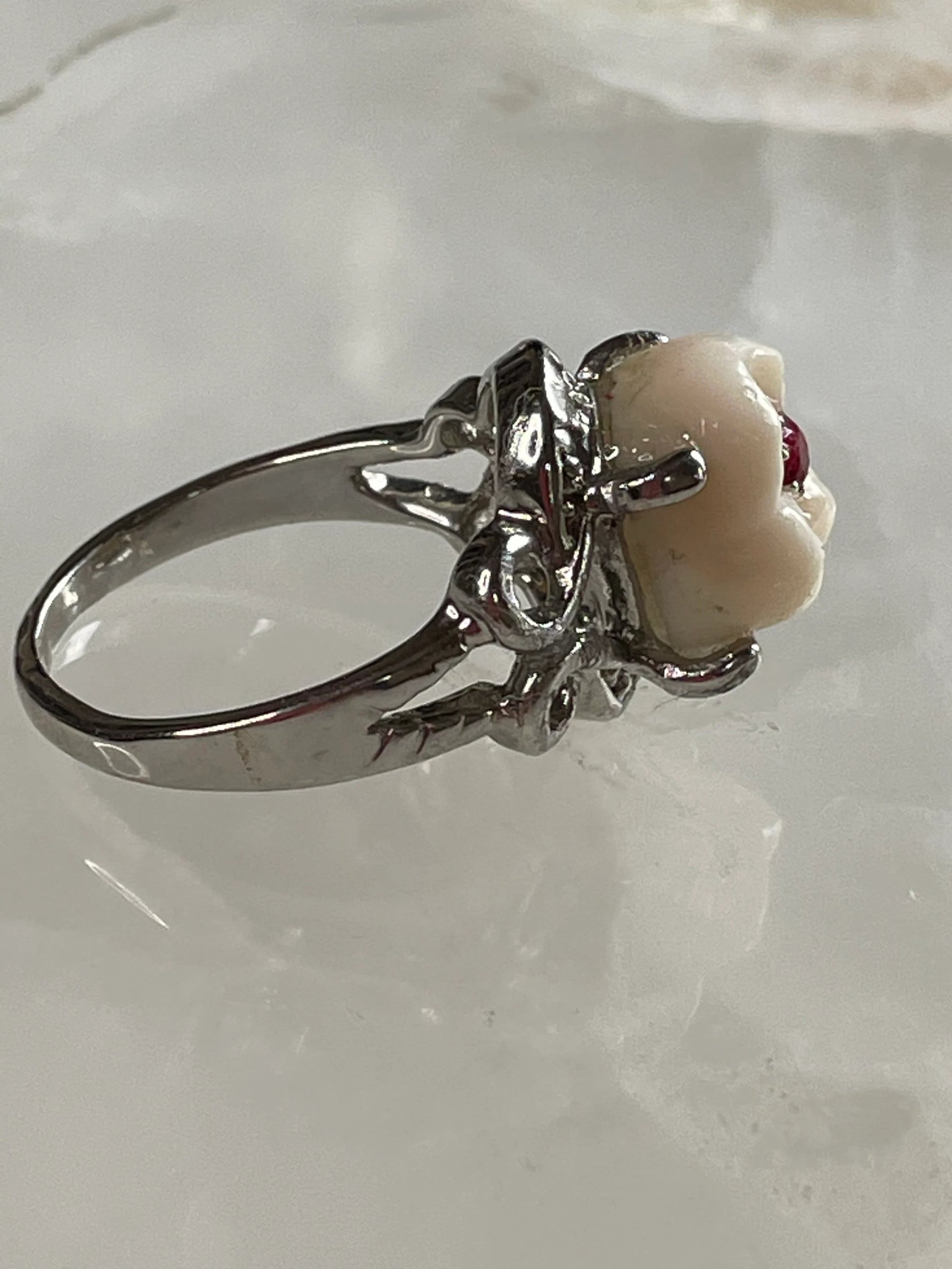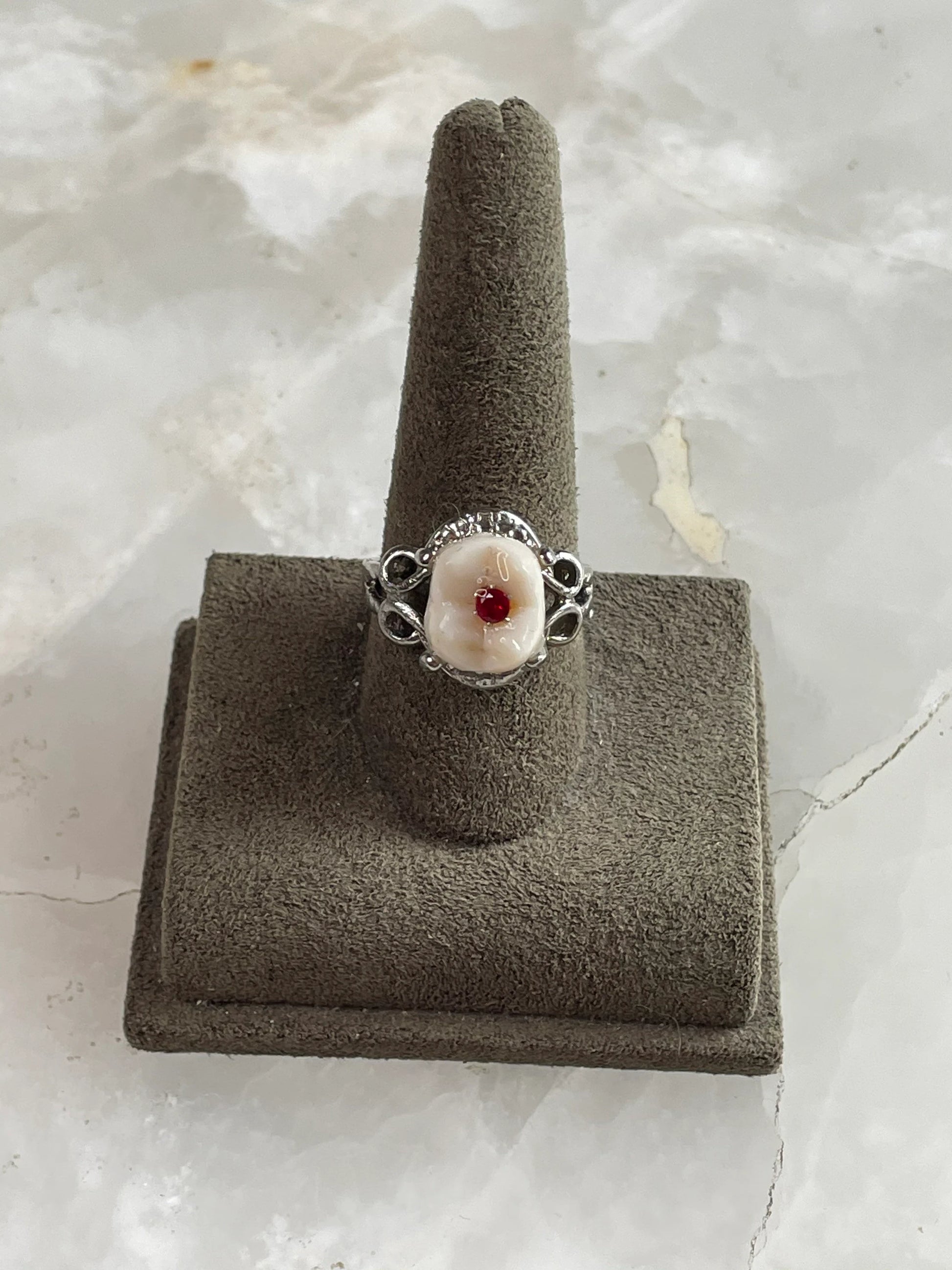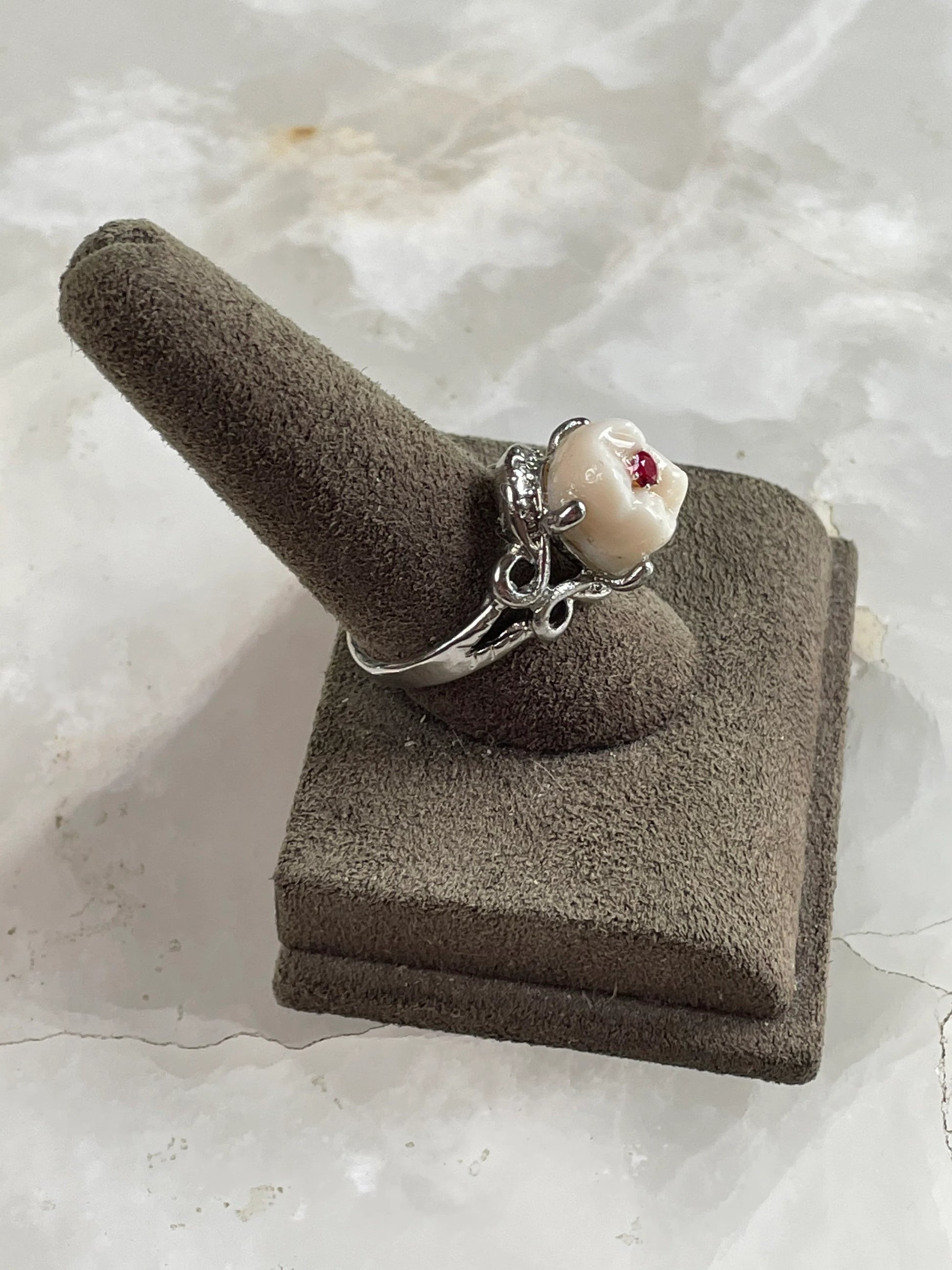 This unique ring features an authentic human molar with a deep red crystal cavity and is set in a stunning silver plated ring setting size 8