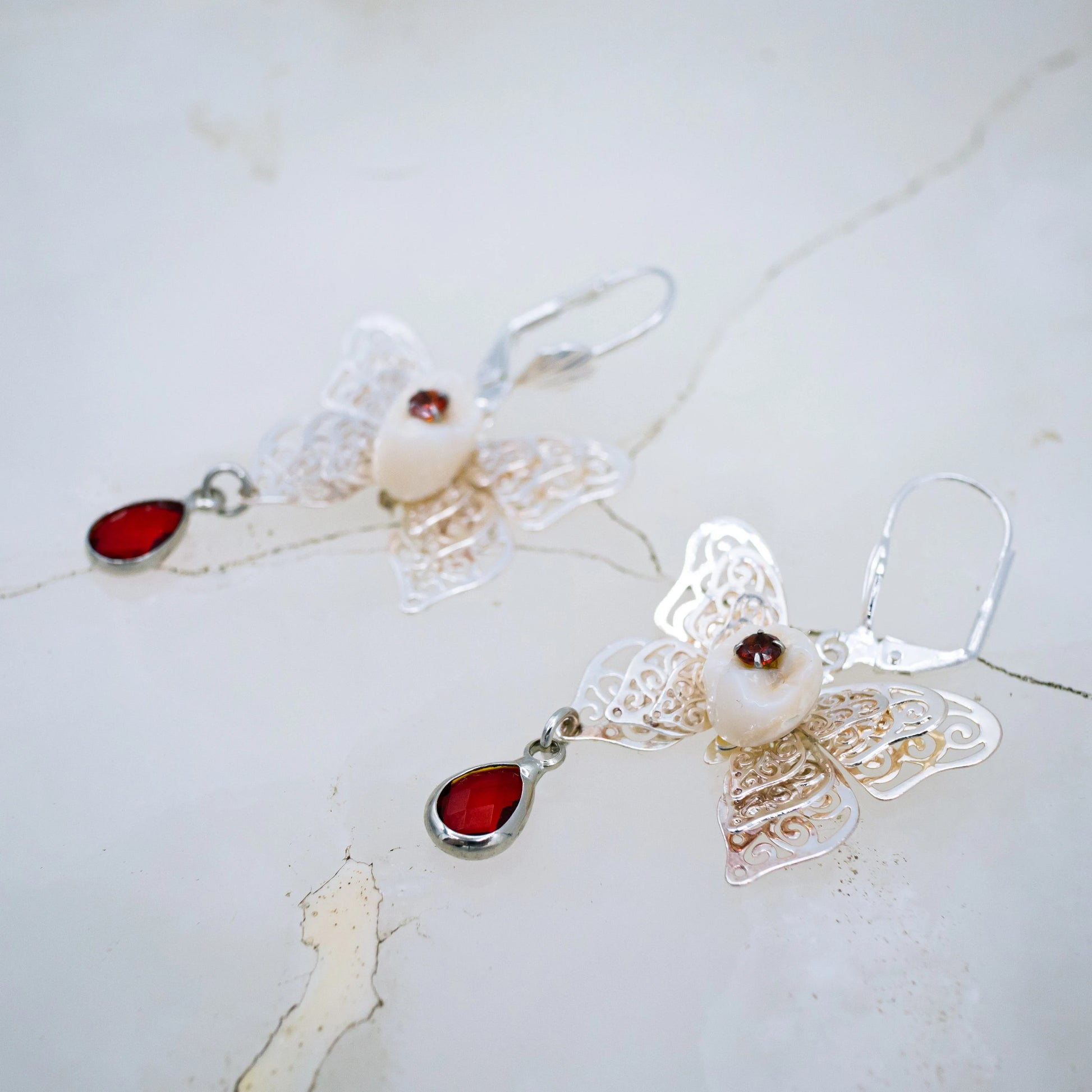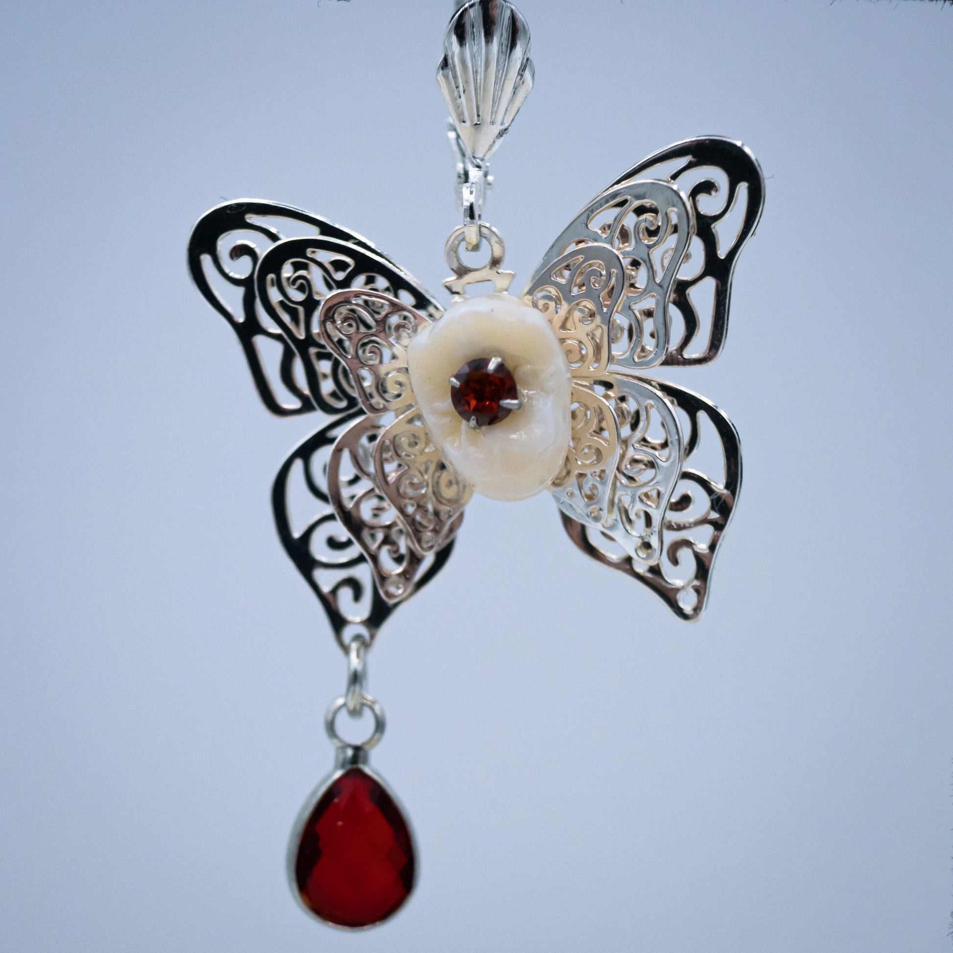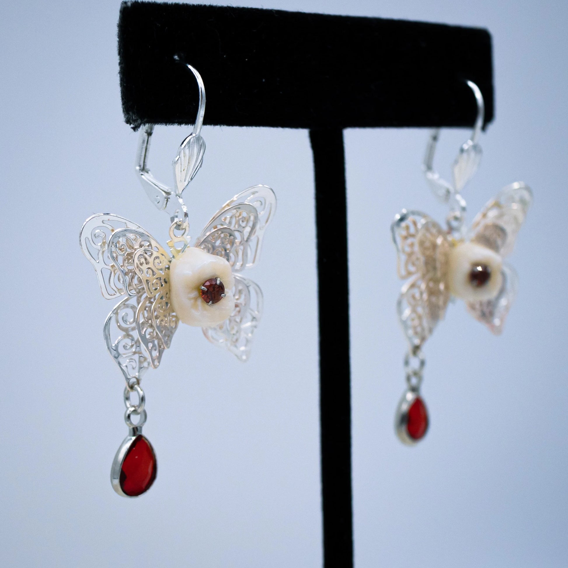 These stunning latch back earrings are made from authentic human teeth with red gems in their center and rest on silver filigree butterfly's that dangle red teardrop stones