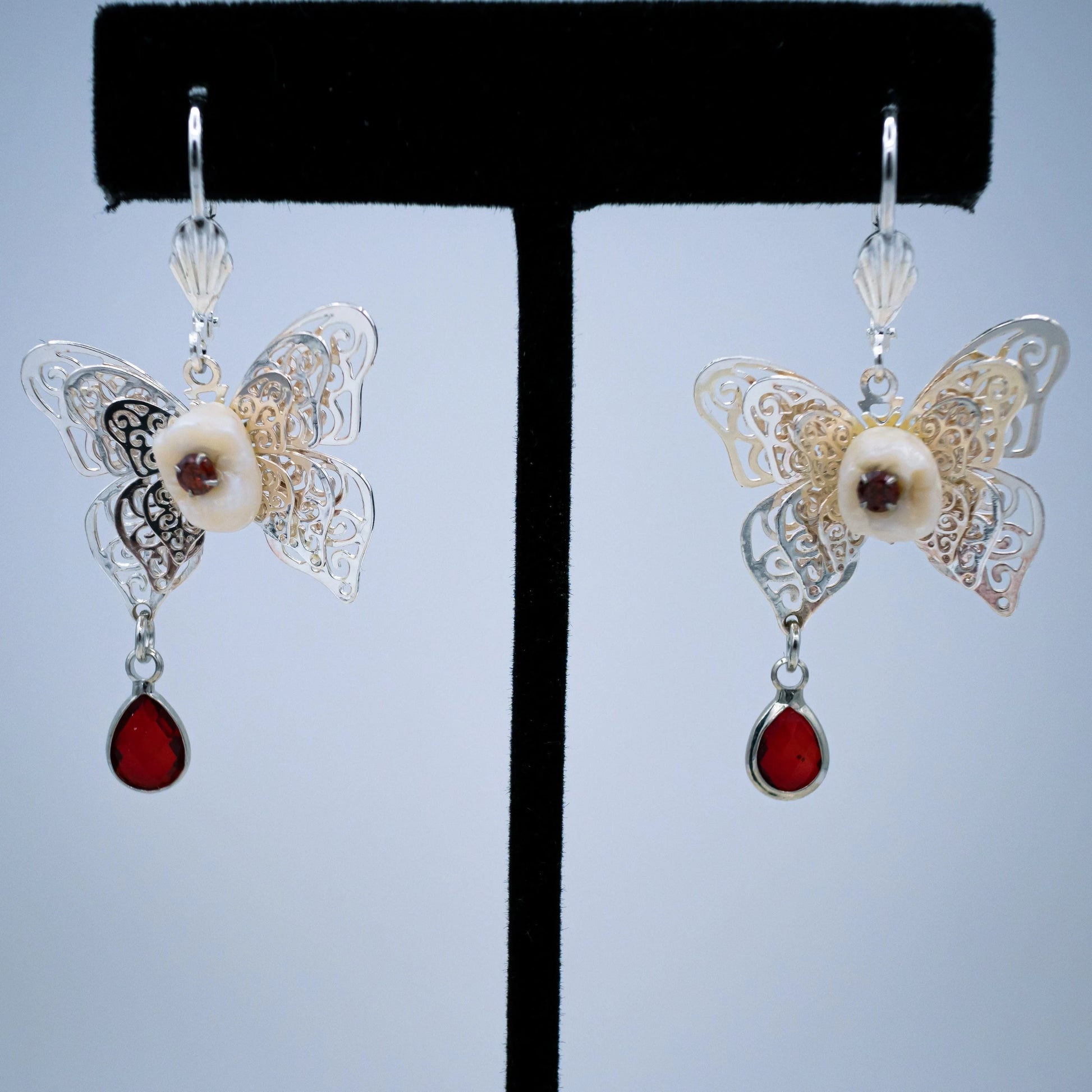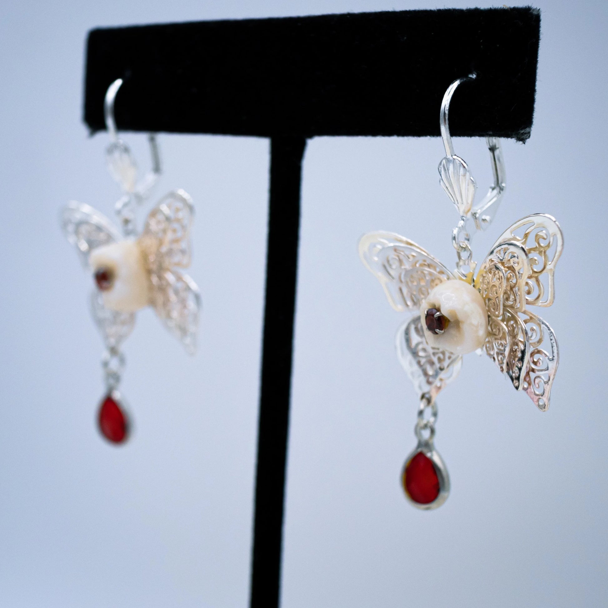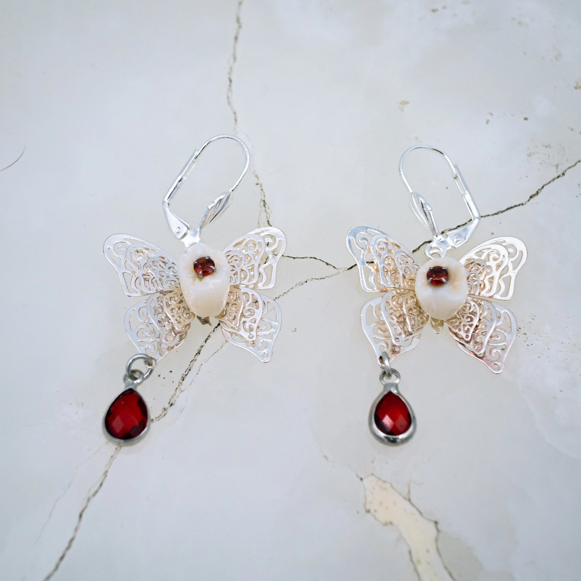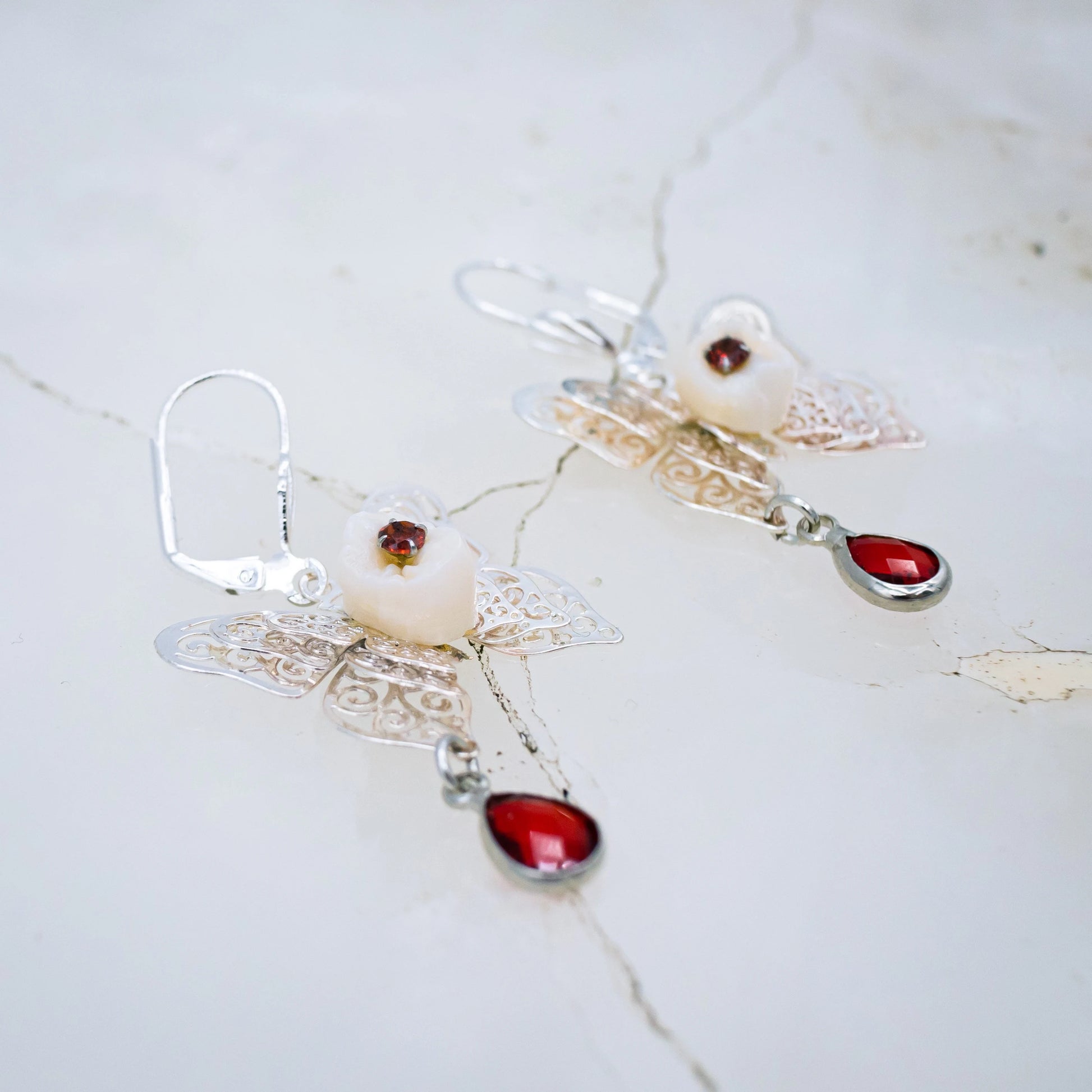 These stunning latch back earrings are made from authentic human teeth with red gems in their center and rest on silver filigree butterfly's that dangle red teardrop stones