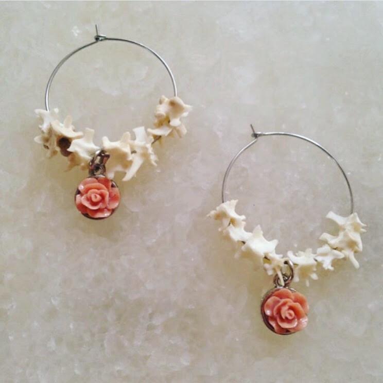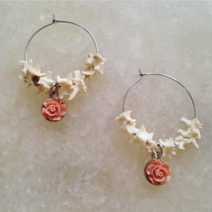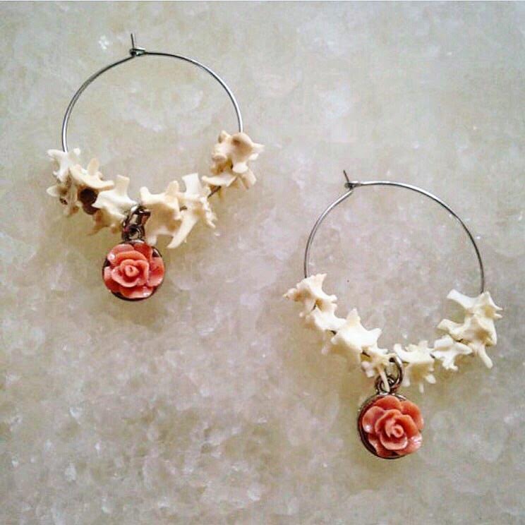 Authentic snake vertebrae hang on hoop earrings centering roses